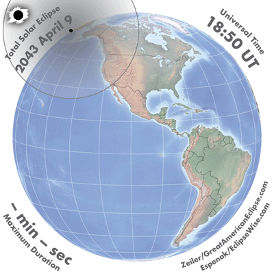 The map to the right shows a single frame from the medium size animation for the Total Solar Eclipse of 2043 Apr 09 . In the upper left corner is the type of eclipse and the eclipse date. To the upper right is the Universal Time. The lower left corner displays the instantaneous duration of totality. To the lower right is the credit for the animation.