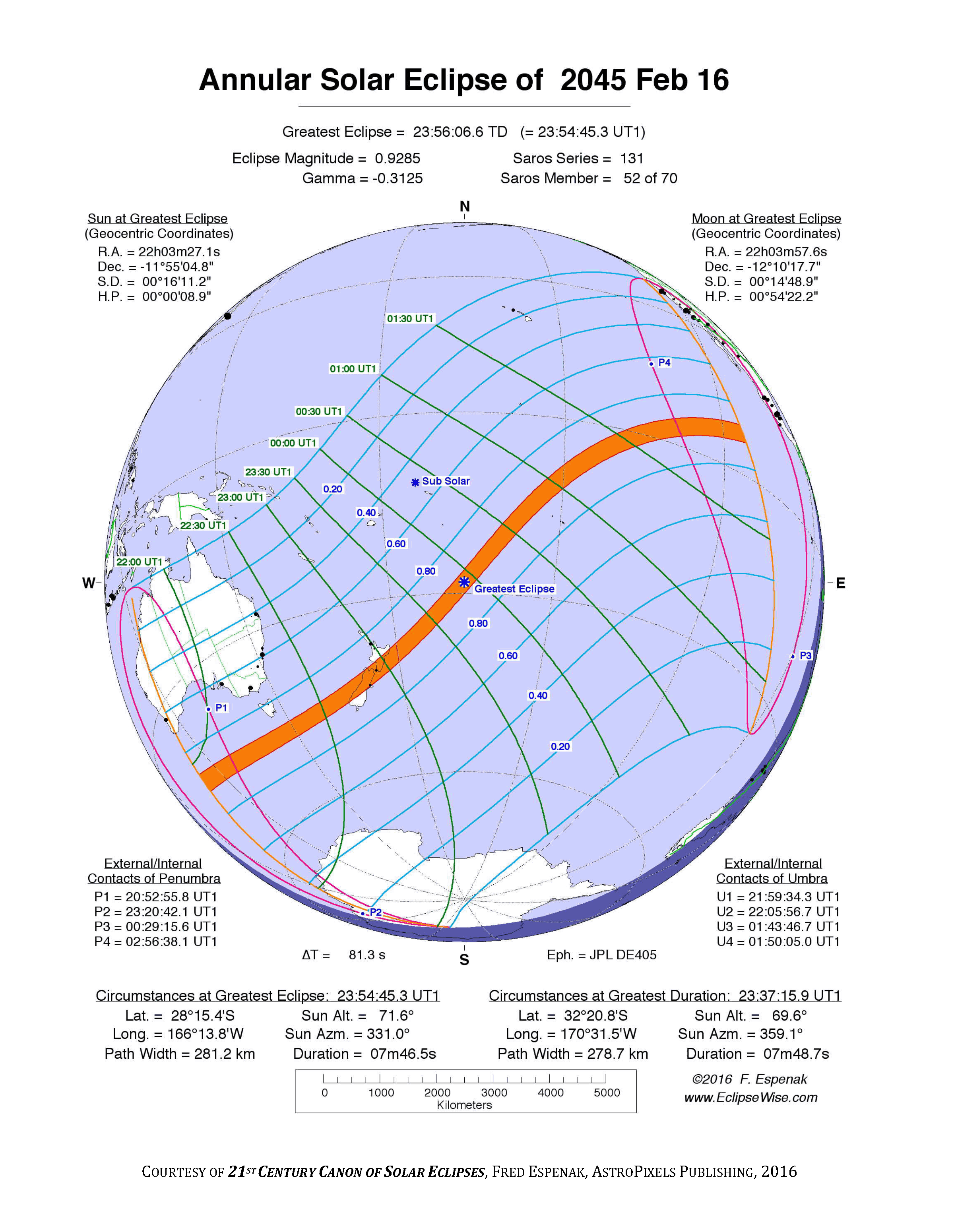 - Path Table: Annular Solar Eclipse of 2045 Feb 16 - coordinates of the central line and path limits