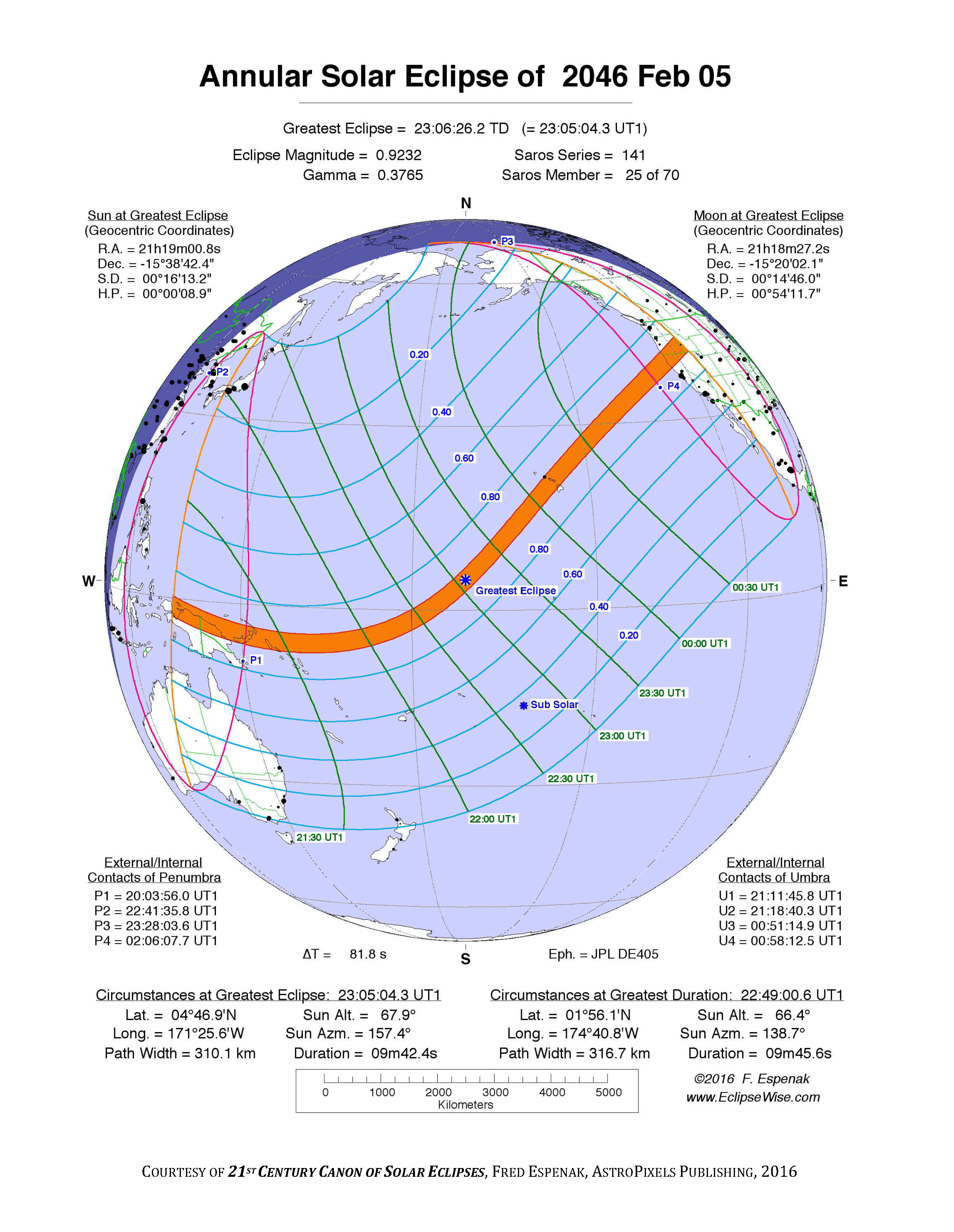 - Orthographic Map: Annular Solar Eclipse of 2046 Feb 05 - detailed global map of eclipse visibility (Key to Figure)