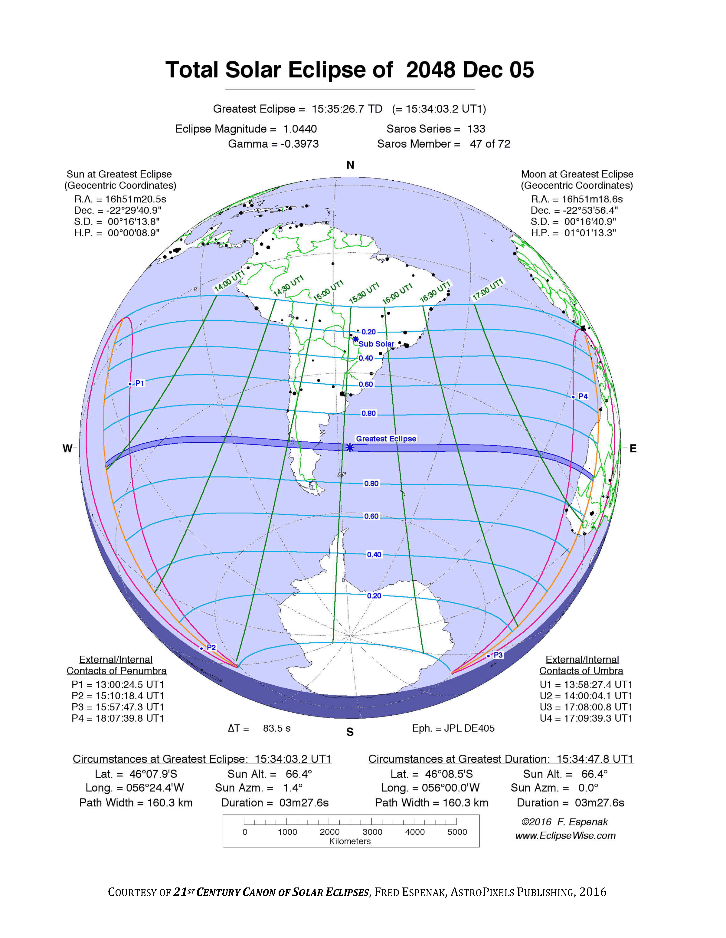 - Orthographic Map: Total Solar Eclipse of 2048 Dec 05 - detailed global map of eclipse visibility (Key to Figure)