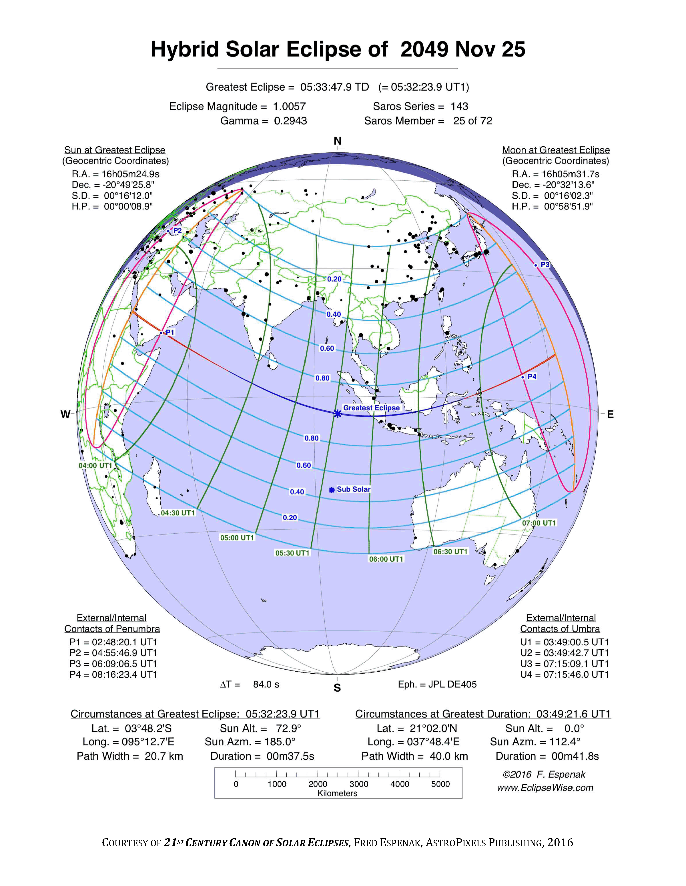 - Orthographic Map: Hybrid Solar Eclipse of 2049 Nov 25 - detailed global map of eclipse visibility (Key to Figure)