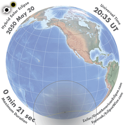 The solar eclipse of 2050 May 20 is one of the rare hybrid solar eclipses. In this particular case the eclipse path starts out as annular. Further down the track it changes to total and then back to annular before the path ends. It is a very short hybrid eclipse with a duration at greatest eclipse of 00m21s. The eclipse magnitude is 1.0038, while Gamma has a value of -0.8688.
