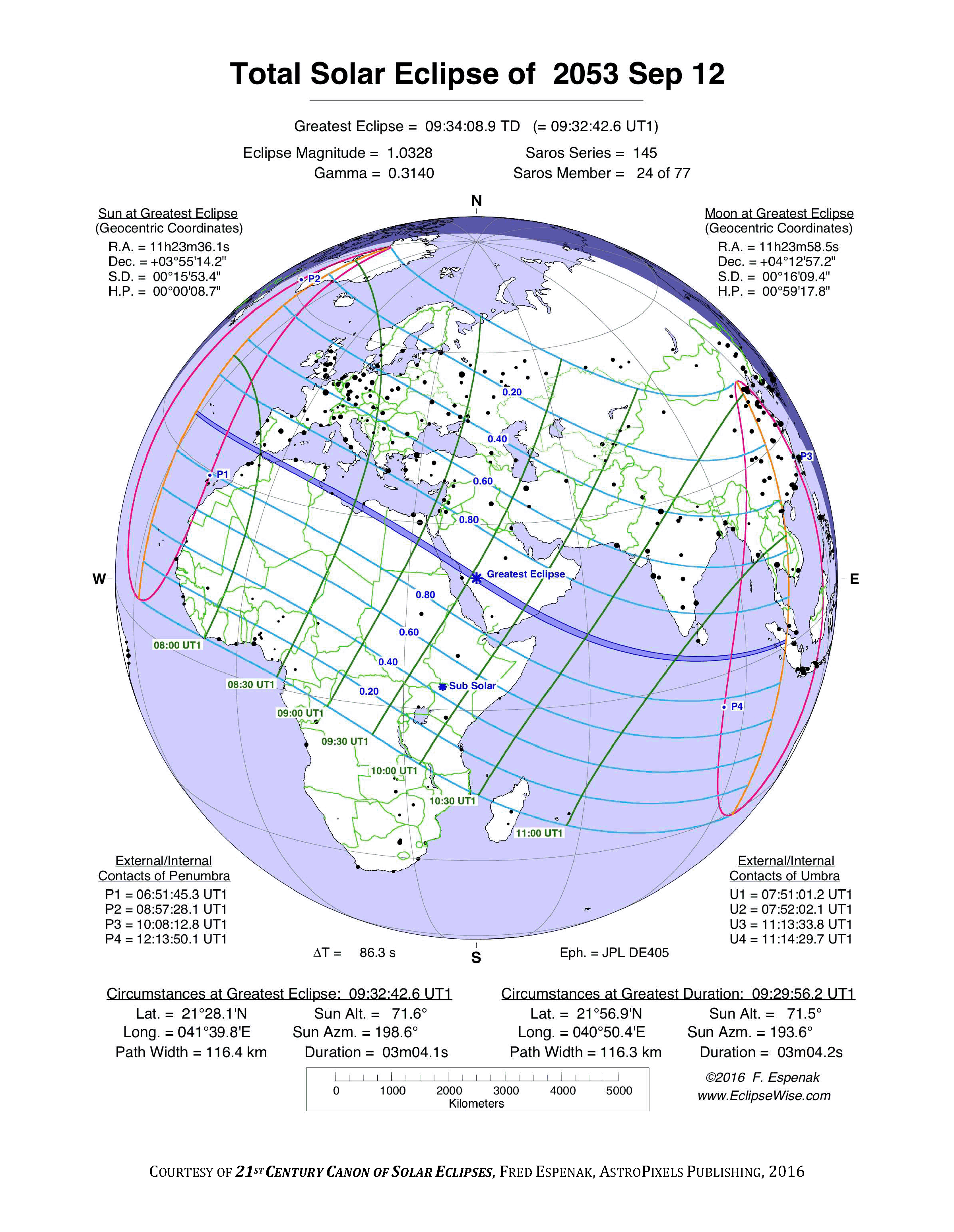 - Orthographic Map: Total Solar Eclipse of 2053 Sep 12 - detailed global map of eclipse visibility (Key to Figure)