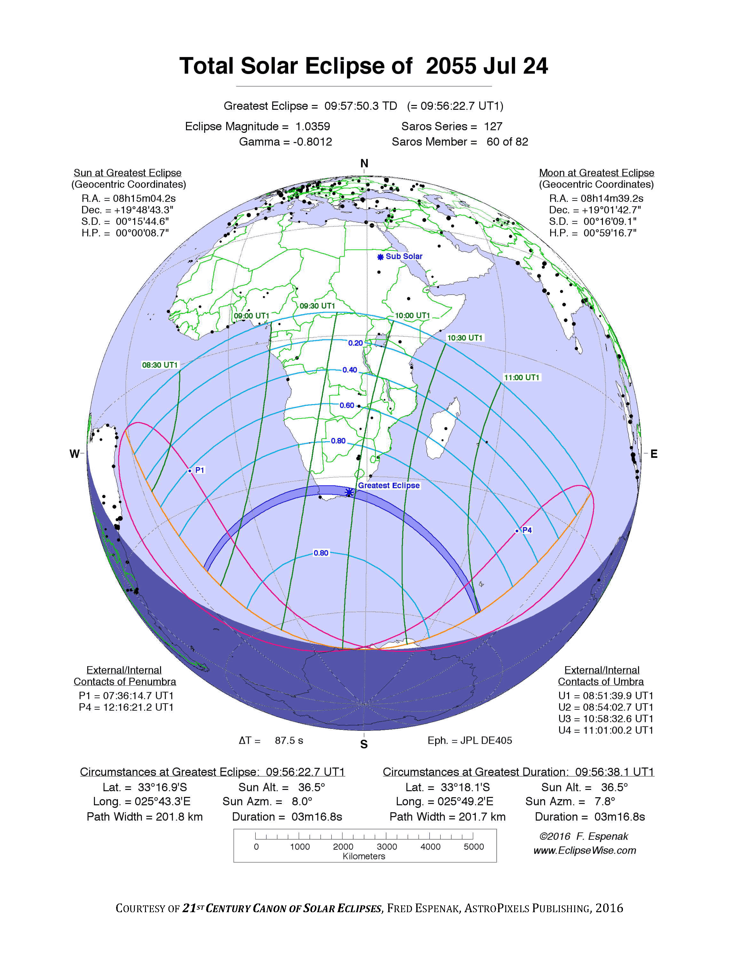 - Orthographic Map: Total Solar Eclipse of 2055 Jul 24 - detailed global map of eclipse visibility (Key to Figure)