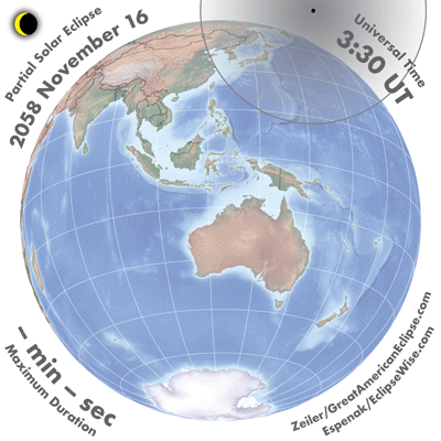 - Orthographic Map: Partial Solar Eclipse of 2058 Nov 16 - detailed global map of eclipse visibility (Key to Figure)