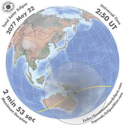 - Orthographic Map: Total Solar Eclipse of 2077 May 22 - detailed global map of eclipse visibility (Key to Figure)