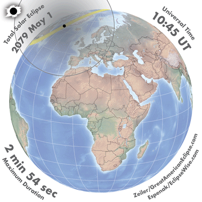 - Orthographic Map: Total Solar Eclipse of 2079 May 01 - detailed global map of eclipse visibility (Key to Figure)