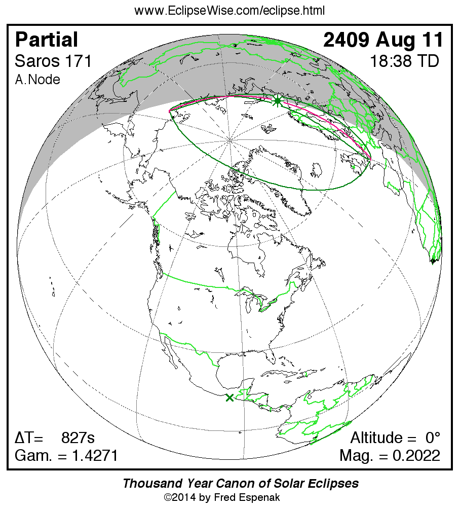 The partial solar eclipse of 2409 Aug 11 is preceded two weeks earlier by a total lunar eclipse on 2409 Jul 27.