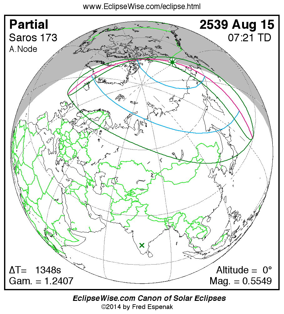 The instant of greatest eclipse takes place on 2539 Aug 15 at 07:20:60 TD (06:58:32 UT1).