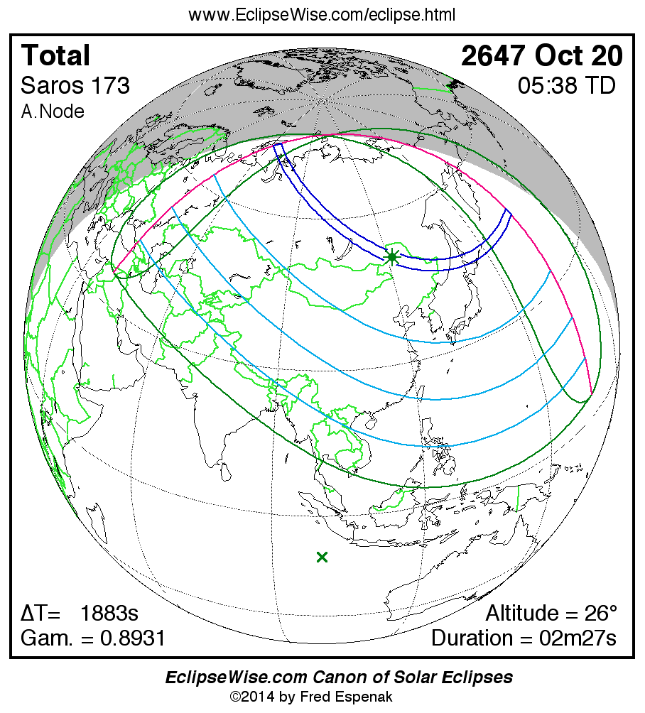The instant of greatest eclipse takes place on 2647 Oct 20 at 05:38:00 TD (05:06:38 UT1).