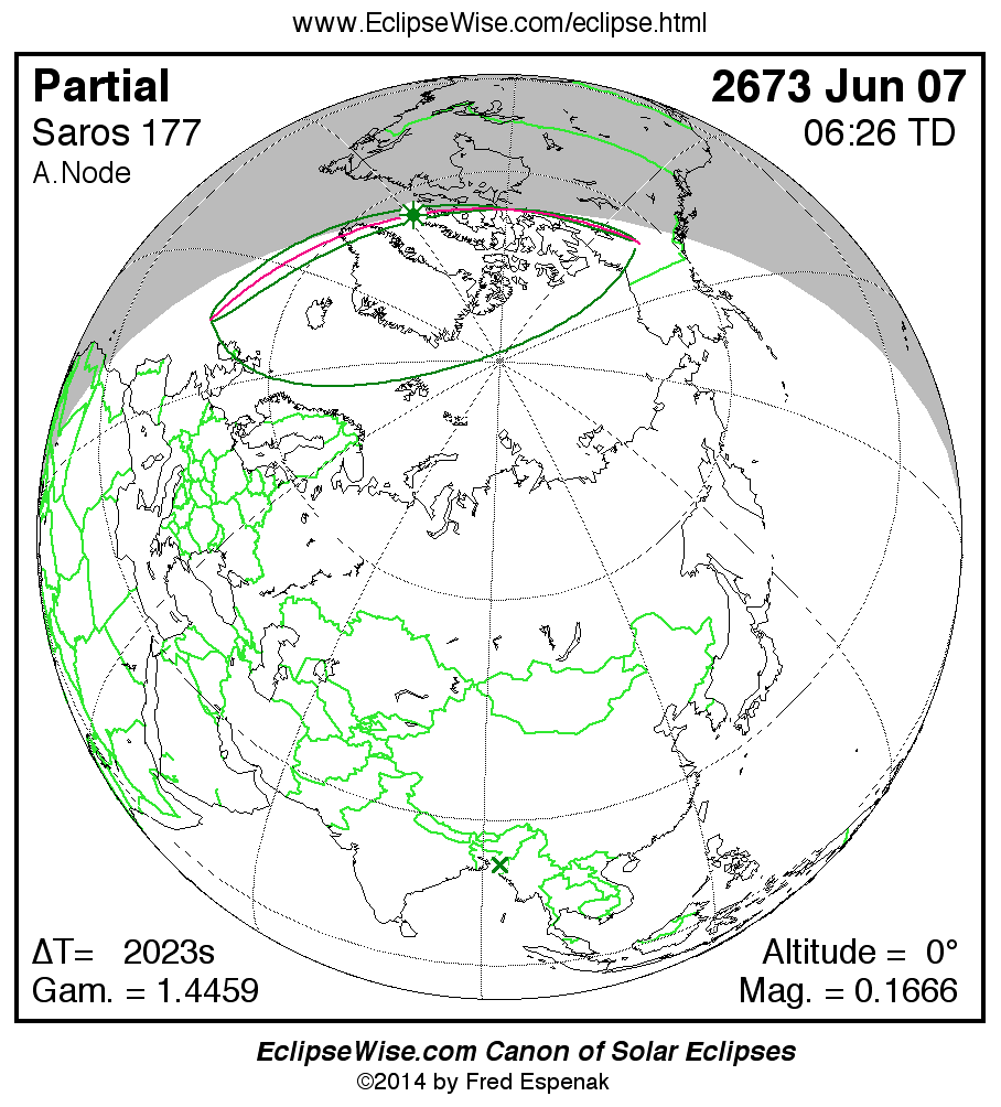 The instant of greatest eclipse takes place on 2673 Jun 07 at 06:25:43 TD (05:52:00 UT1).