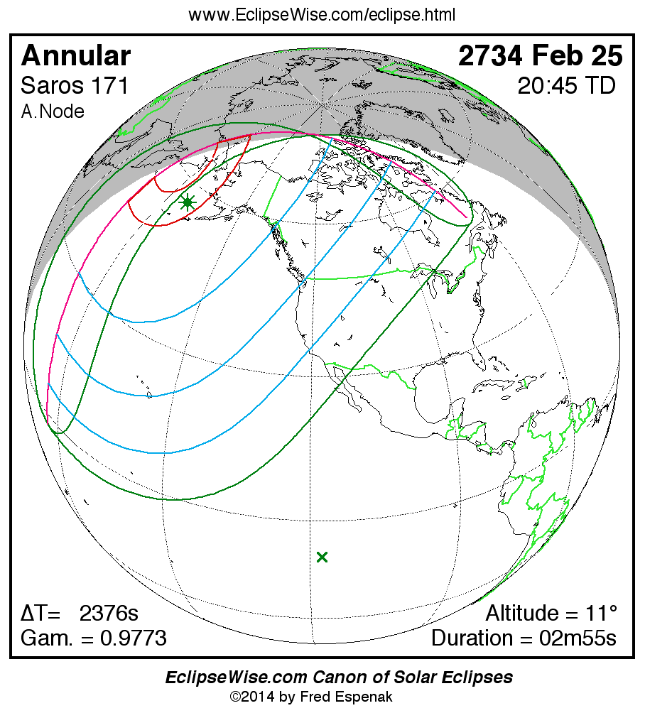 The instant of greatest eclipse takes place on 2734 Feb 25 at 20:45:23 TD (20:05:47 UT1).