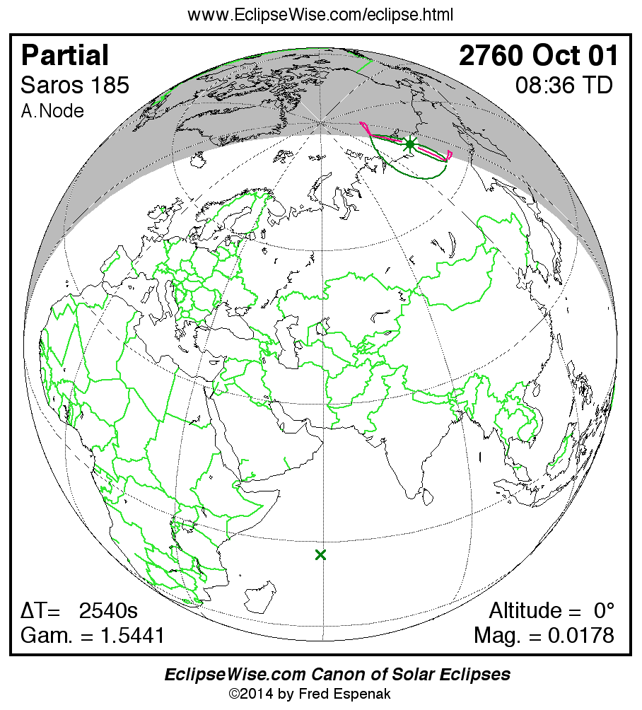 The eclipse belongs to Saros 185 and is number 1 of 73 eclipses in the series. Thus, the 2760 Oct 01 event is the very first eclipse of the series . All eclipses in this series occur at the Moons ascending node. The Moon moves southward with respect to the node with each succeeding eclipse in the series and gamma decreases.