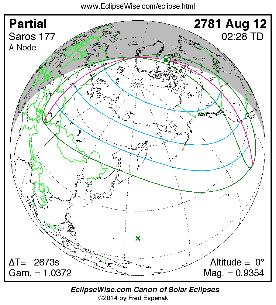 The instant of greatest eclipse takes place on 2781 Aug 12 at 02:27:36 TD (01:43:03 UT1).