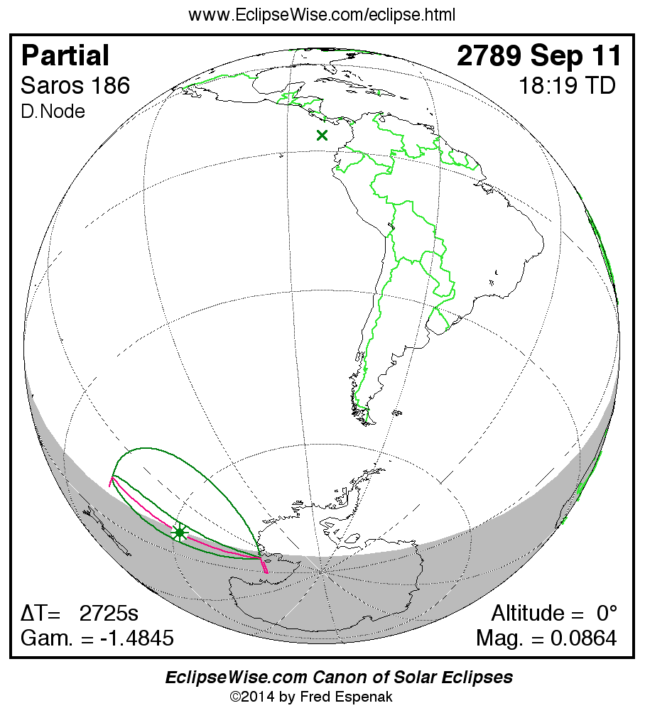 The instant of greatest eclipse takes place on 2789 Sep 11 at 18:18:47 TD (17:33:22 UT1).