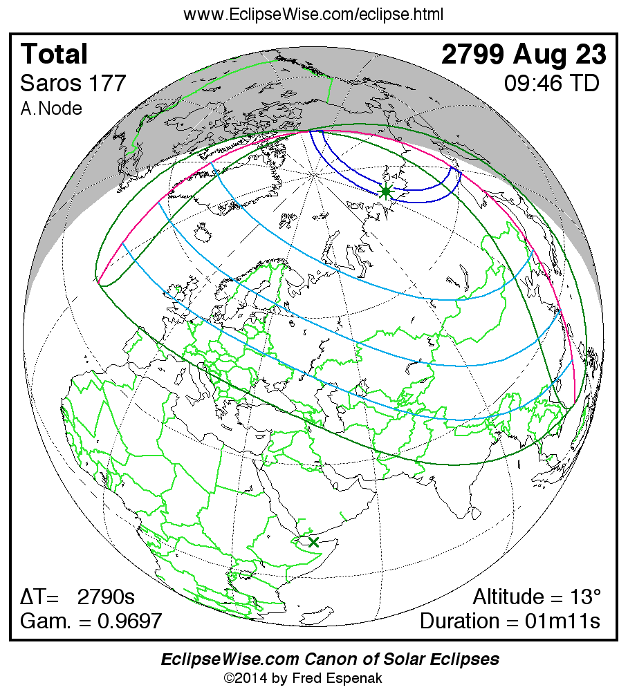 The instant of greatest eclipse takes place on 2799 Aug 23 at 09:46:29 TD (08:59:59 UT1).