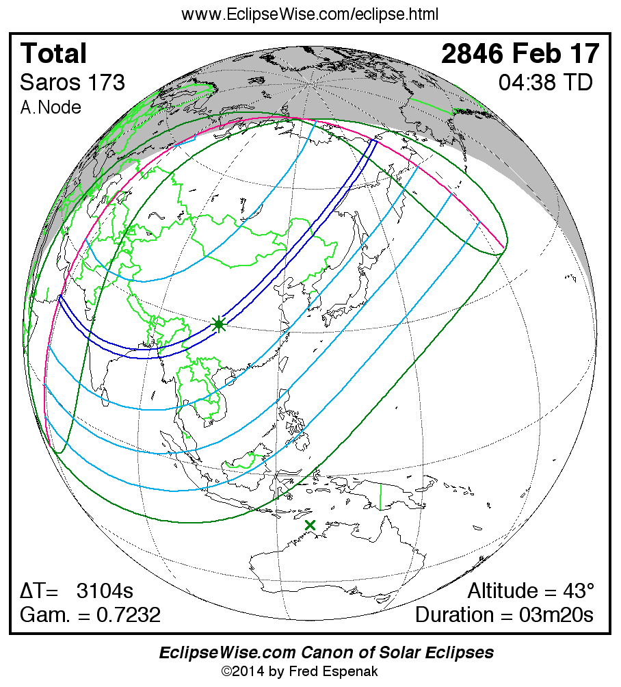 The instant of greatest eclipse takes place on 2846 Feb 17 at 04:37:34 TD (03:45:50 UT1).