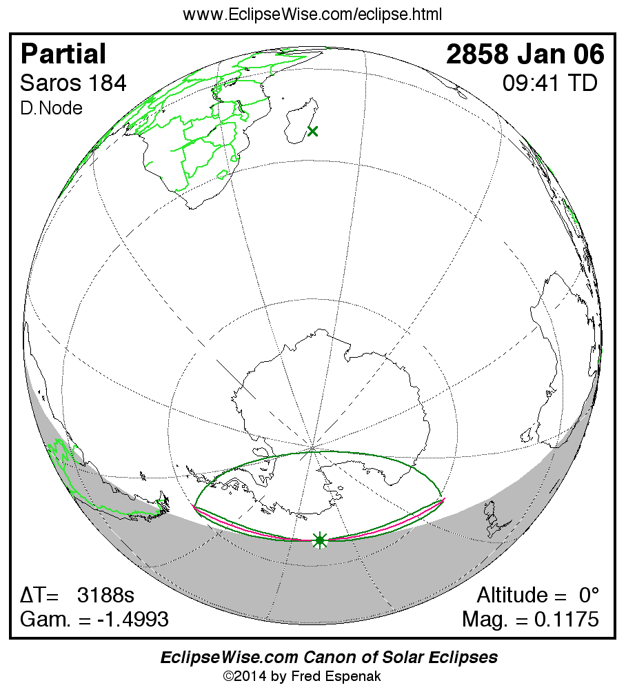 The instant of greatest eclipse takes place on 2858 Jan 06 at 09:41:19 TD (08:48:11 UT1).
