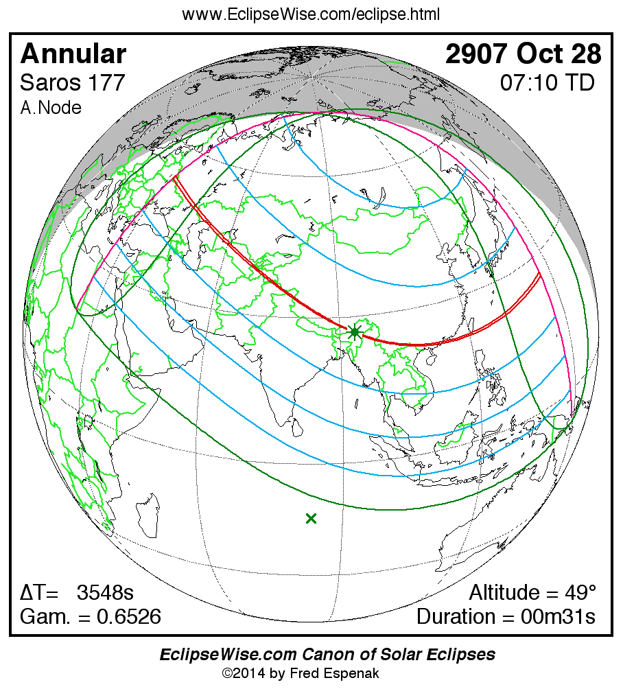 The instant of greatest eclipse takes place on 2907 Oct 28 at 07:09:43 TD (06:10:35 UT1).