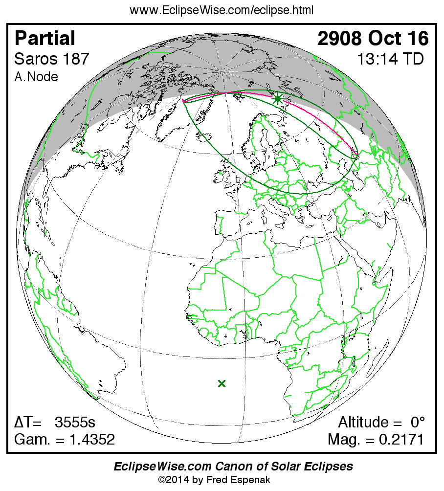 The instant of greatest eclipse takes place on 2908 Oct 16 at 13:13:40 TD (12:14:25 UT1).