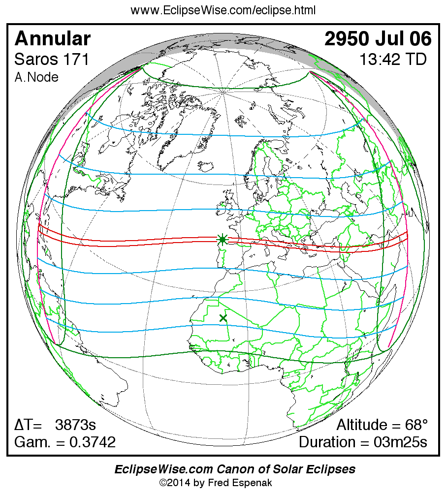 The instant of greatest eclipse takes place on 2950 Jul 06 at 13:42:09 TD (12:37:36 UT1).