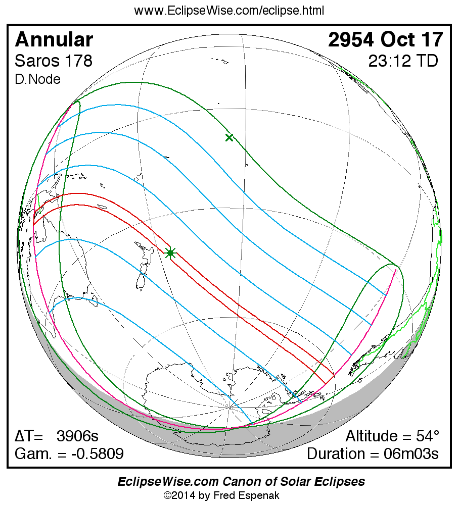 - Orthographic Map: Annular Solar Eclipse of 2954 Oct 17 - global map of eclipse visibility