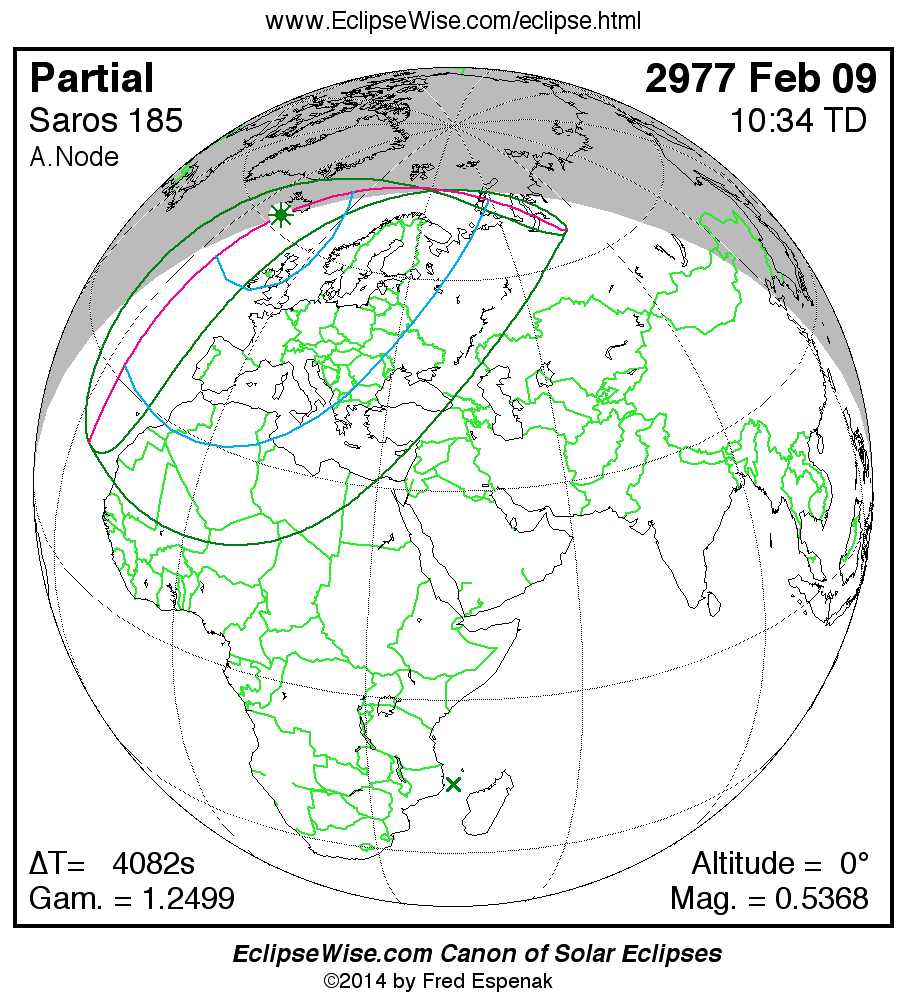 The instant of greatest eclipse takes place on 2977 Feb 09 at 10:33:41 TD (09:25:39 UT1).