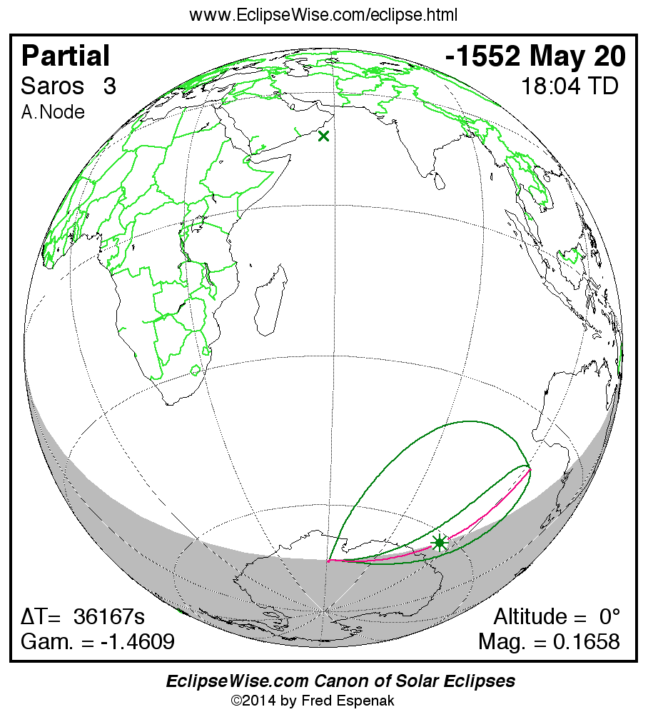 The Saros panorama below is arranged in horizontal rows of 3 eclipses. So one eclipse to the left or right is a difference of 1 Saros cycle, and one eclipse above or below is a difference of 1 exeligmos. By scanning a column of the table, it reveals how the geographic visibility of eclipses separated by an exeligmos slowly changes.