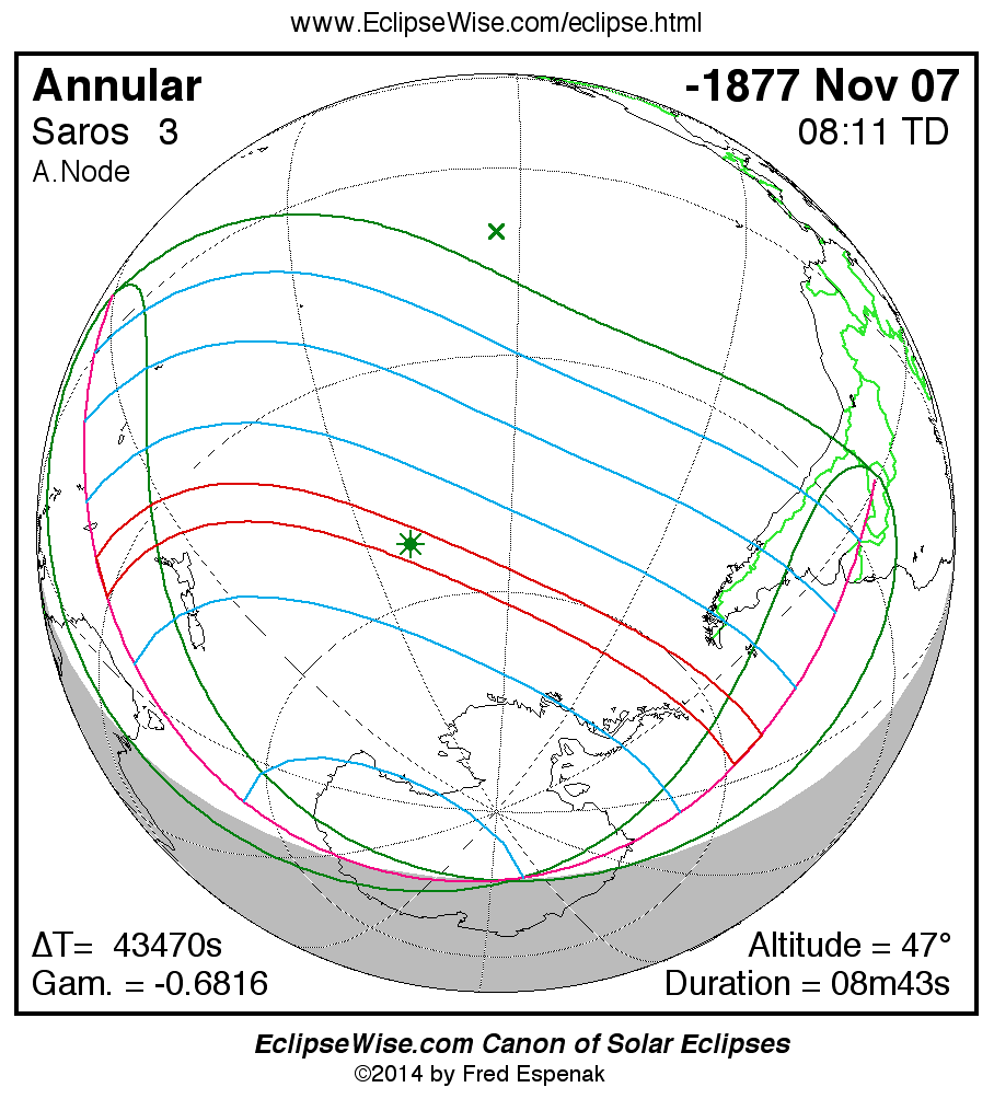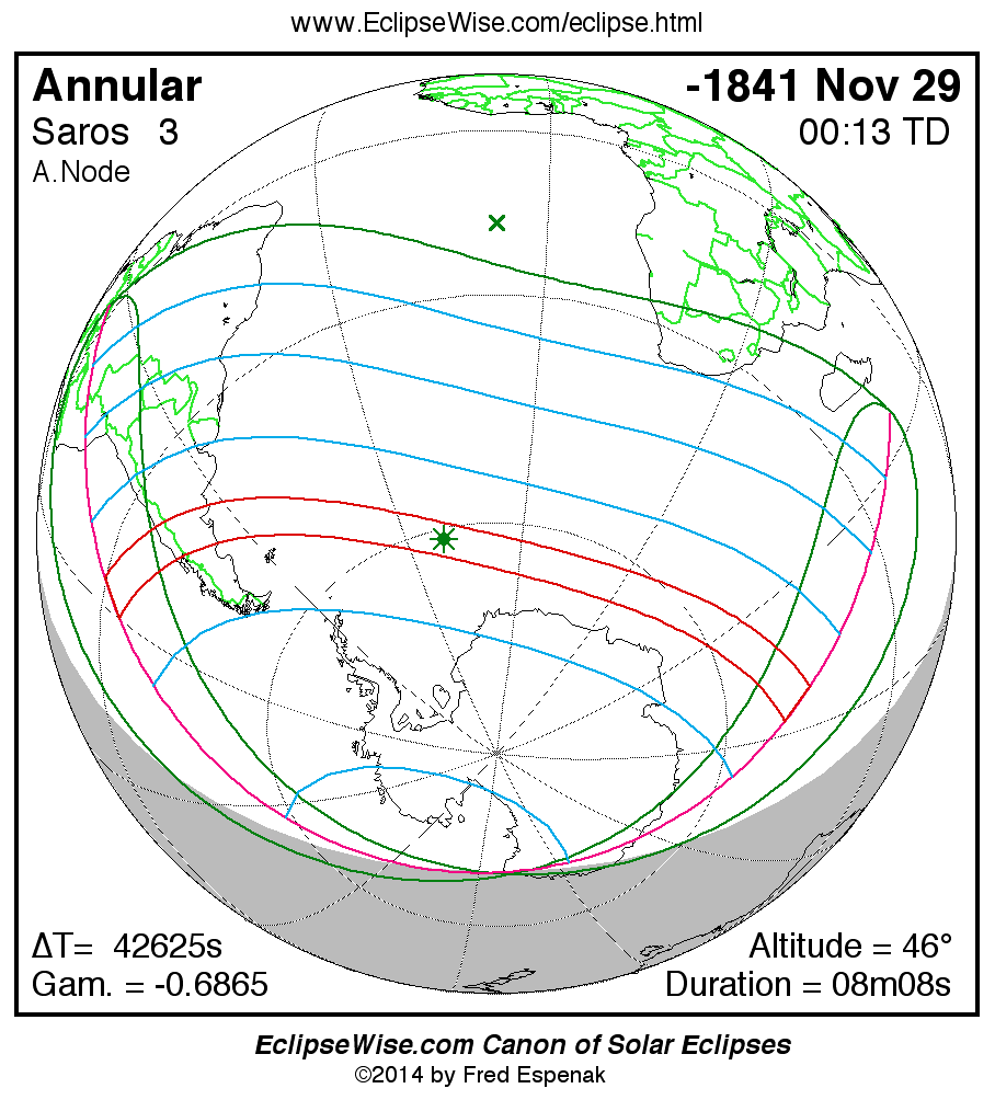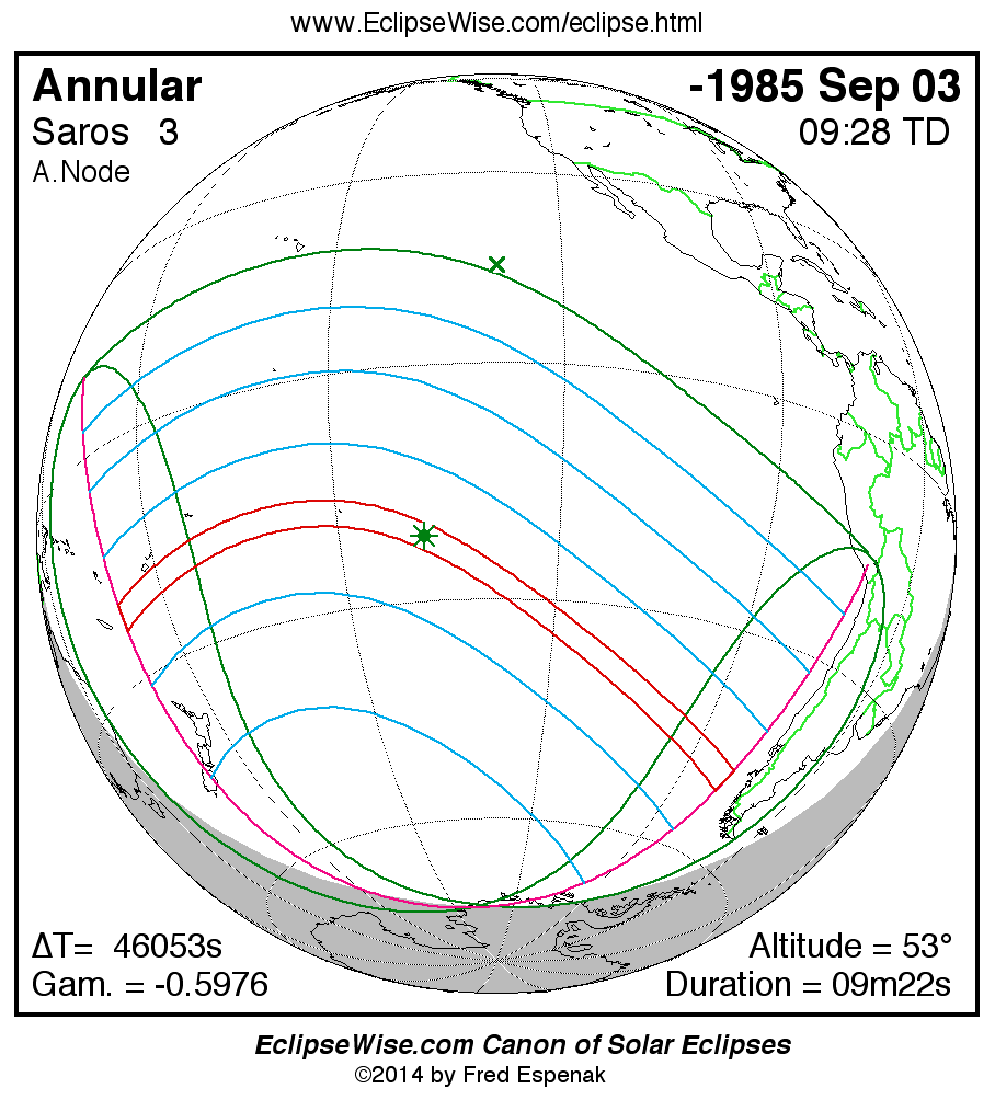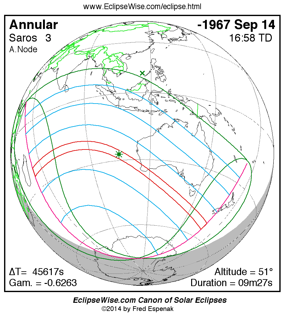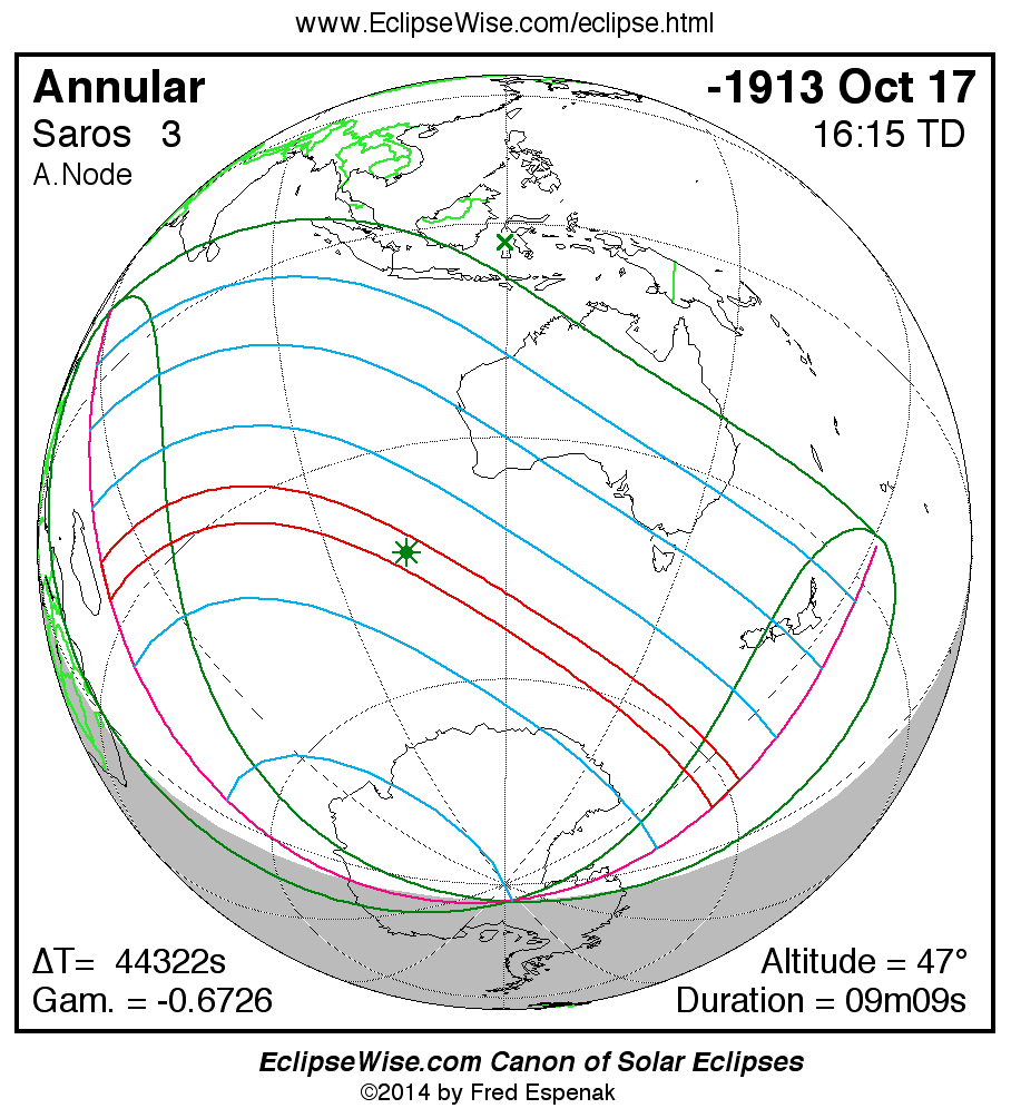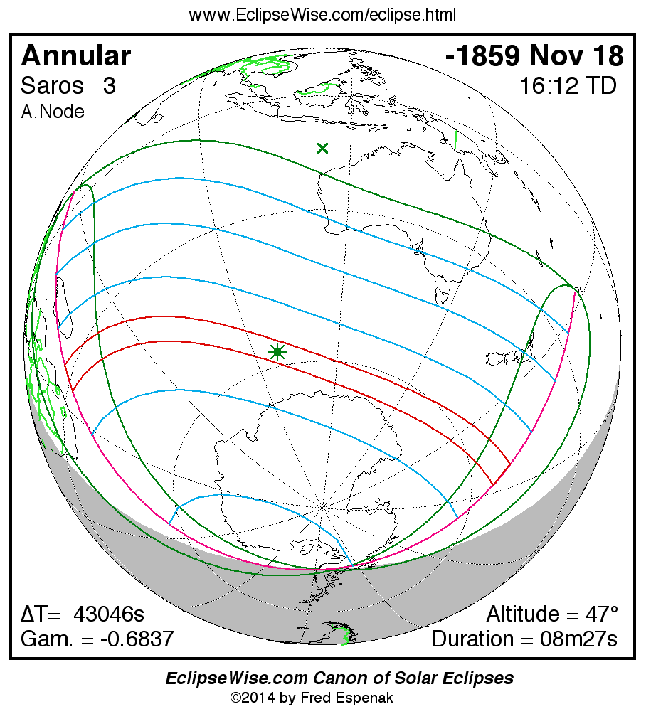 A panorama of all solar eclipses belonging to Saros 3 is presented here. Each map depicts the geographic region of visibility for a single eclipse. For central eclipses, the total or annular path is plotted in either blue (total) or red (annular). The date and time is given for the instant of Greatest Eclipse. Every map serves as a hyperlink to the EclipseWise Prime page for that eclipse where a larger map and complete details for the eclipse can be found. Visit the Key to Solar Eclipse Maps for a detailed explanation of these maps. Near the bottom of the page are a series of hyperlinks for more on solar eclipses.