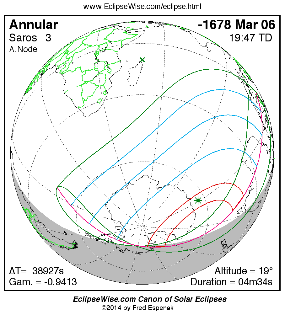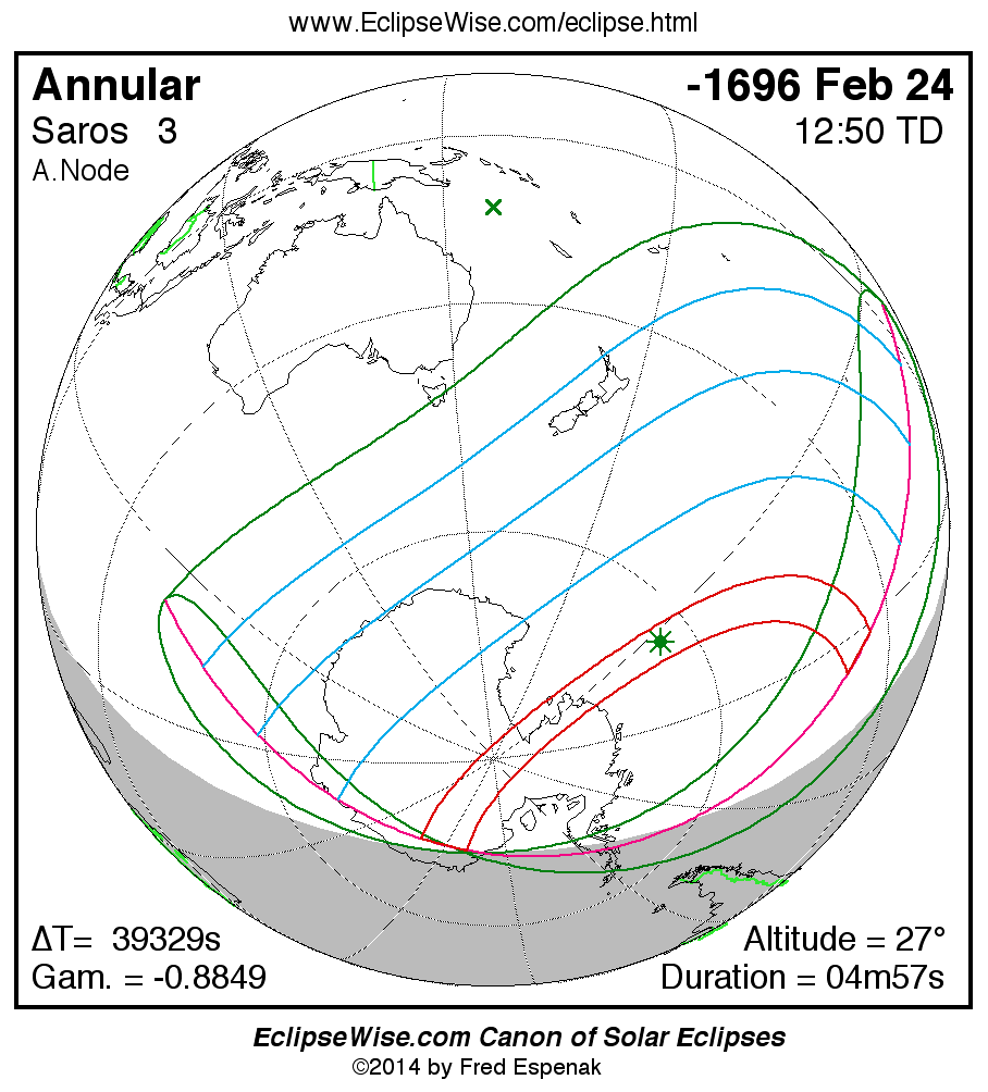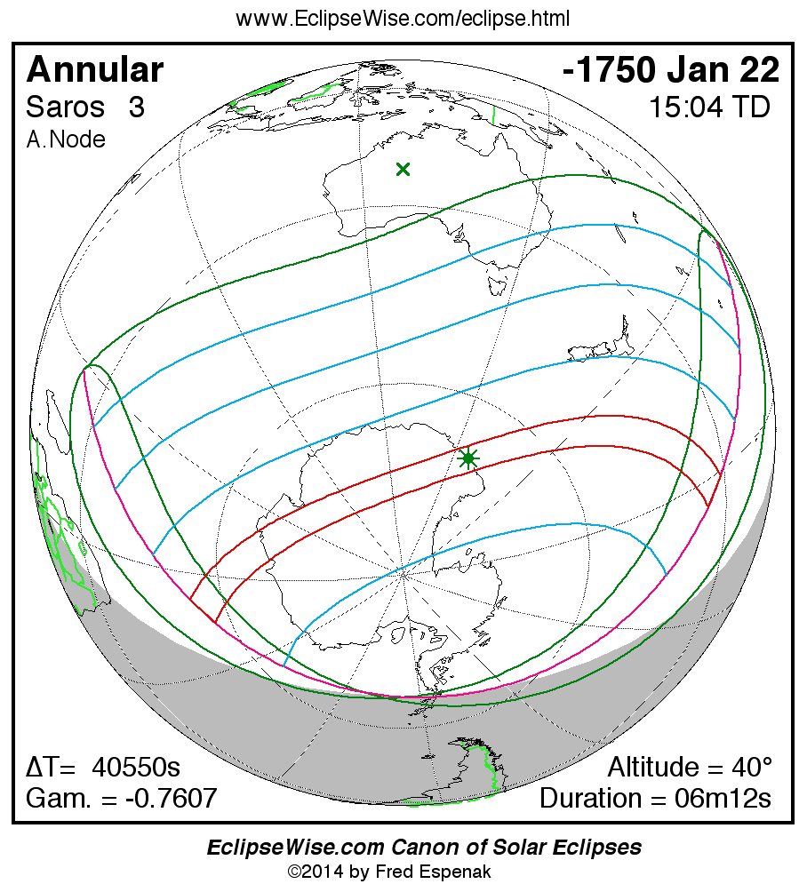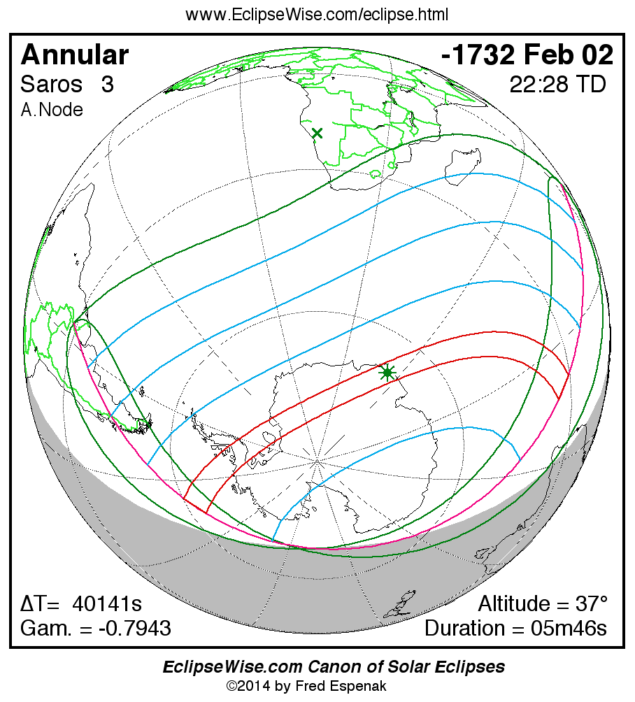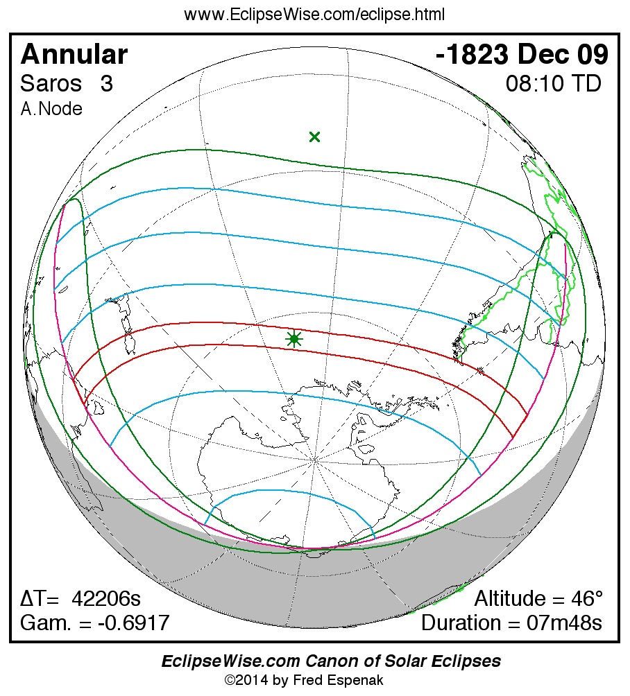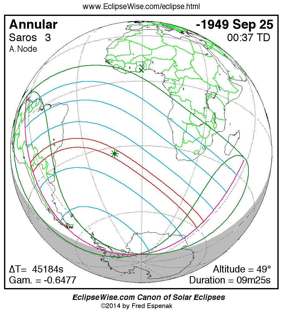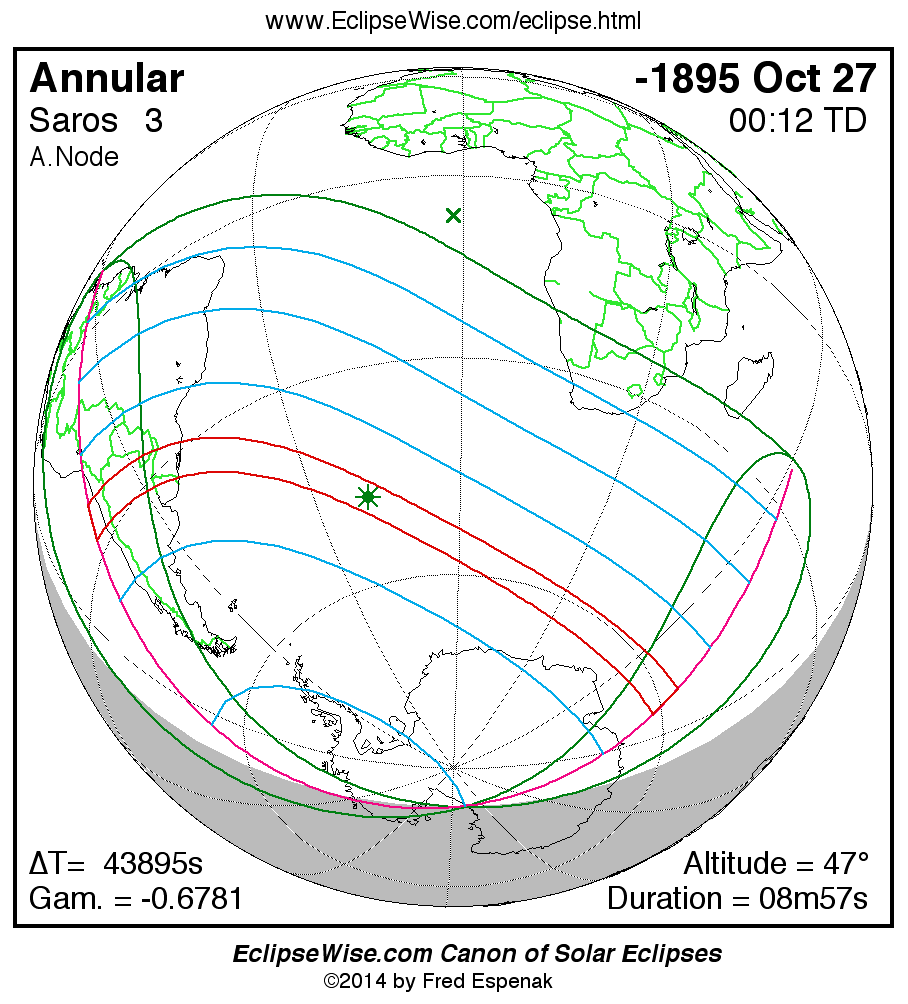 A panorama of all solar eclipses belonging to Saros 3 is presented here. Each map depicts the geographic region of visibility for a single eclipse. For central eclipses, the total or annular path is plotted in either blue (total) or red (annular). The date and time is given for the instant of Greatest Eclipse. Every map serves as a hyperlink to the EclipseWise Prime page for that eclipse where a larger map and complete details for the eclipse can be found. Visit the Key to Solar Eclipse Maps for a detailed explanation of these maps. Near the bottom of the page are a series of hyperlinks for more on solar eclipses.