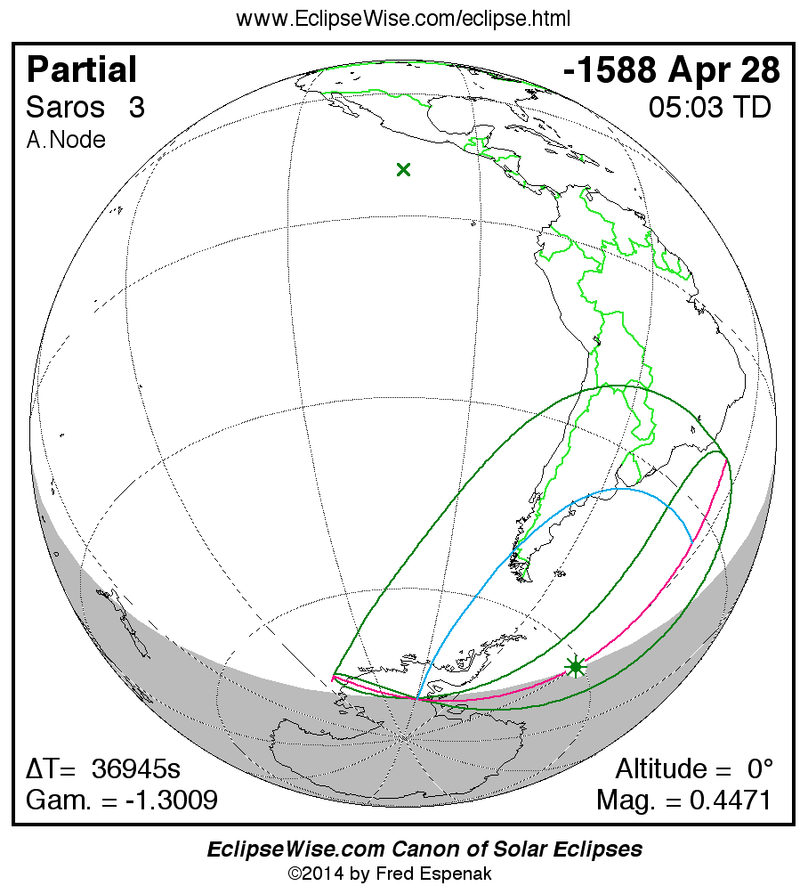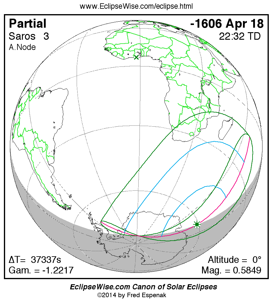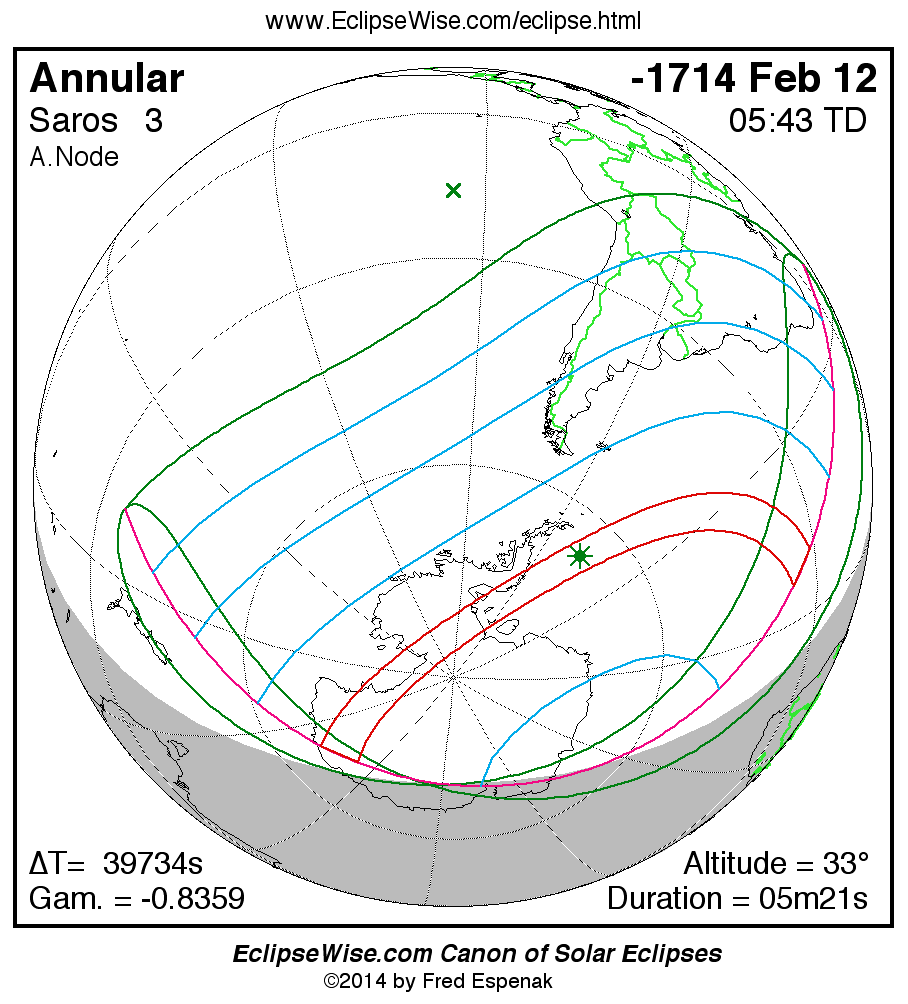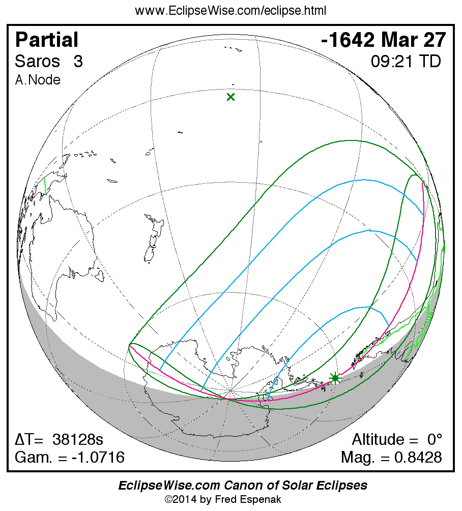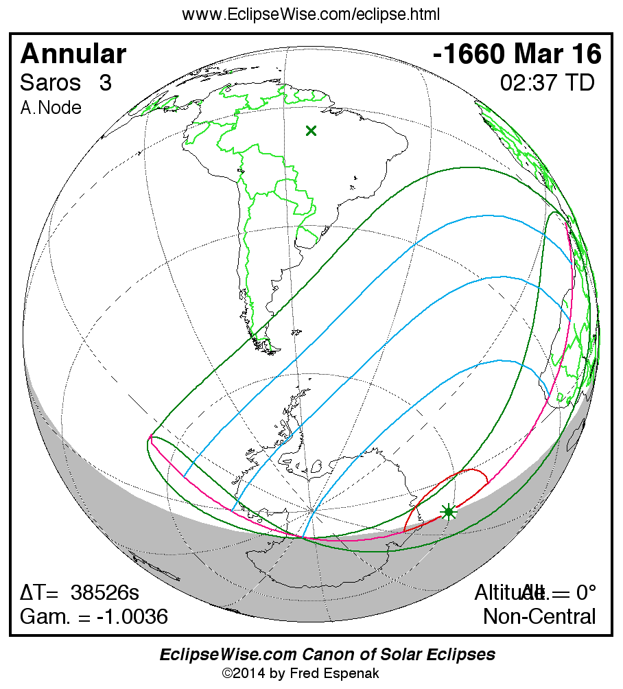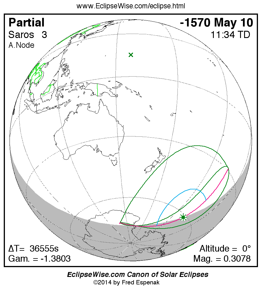A panorama of all solar eclipses belonging to Saros 3 is presented here. Each map depicts the geographic region of visibility for a single eclipse. For central eclipses, the total or annular path is plotted in either blue (total) or red (annular). The date and time is given for the instant of Greatest Eclipse. Every map serves as a hyperlink to the EclipseWise Prime page for that eclipse where a larger map and complete details for the eclipse can be found. Visit the Key to Solar Eclipse Maps for a detailed explanation of these maps. Near the bottom of the page are a series of hyperlinks for more on solar eclipses.