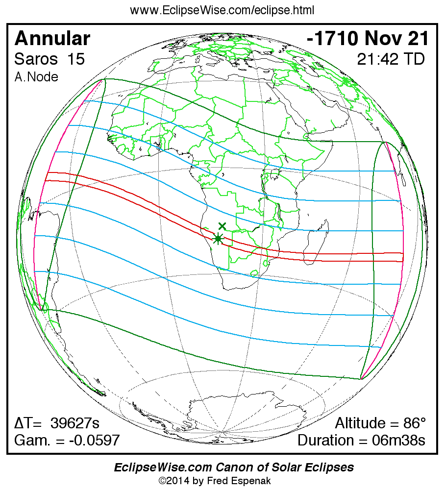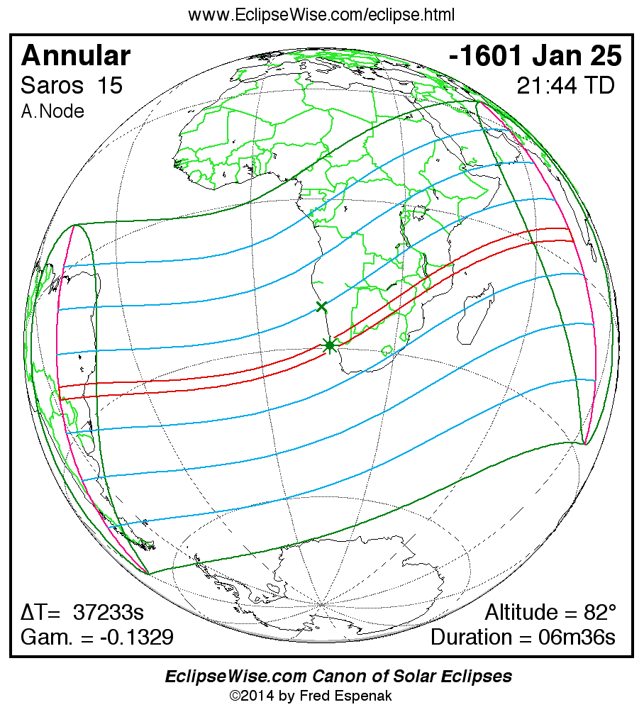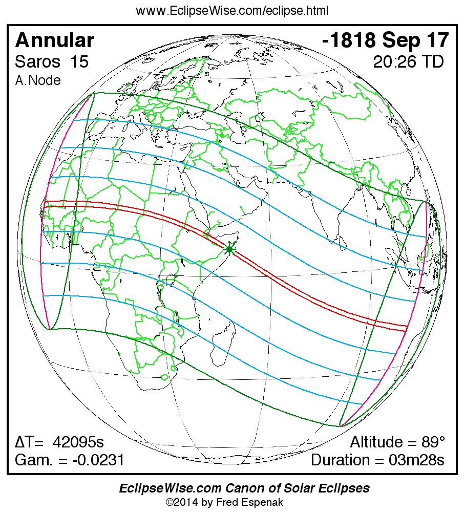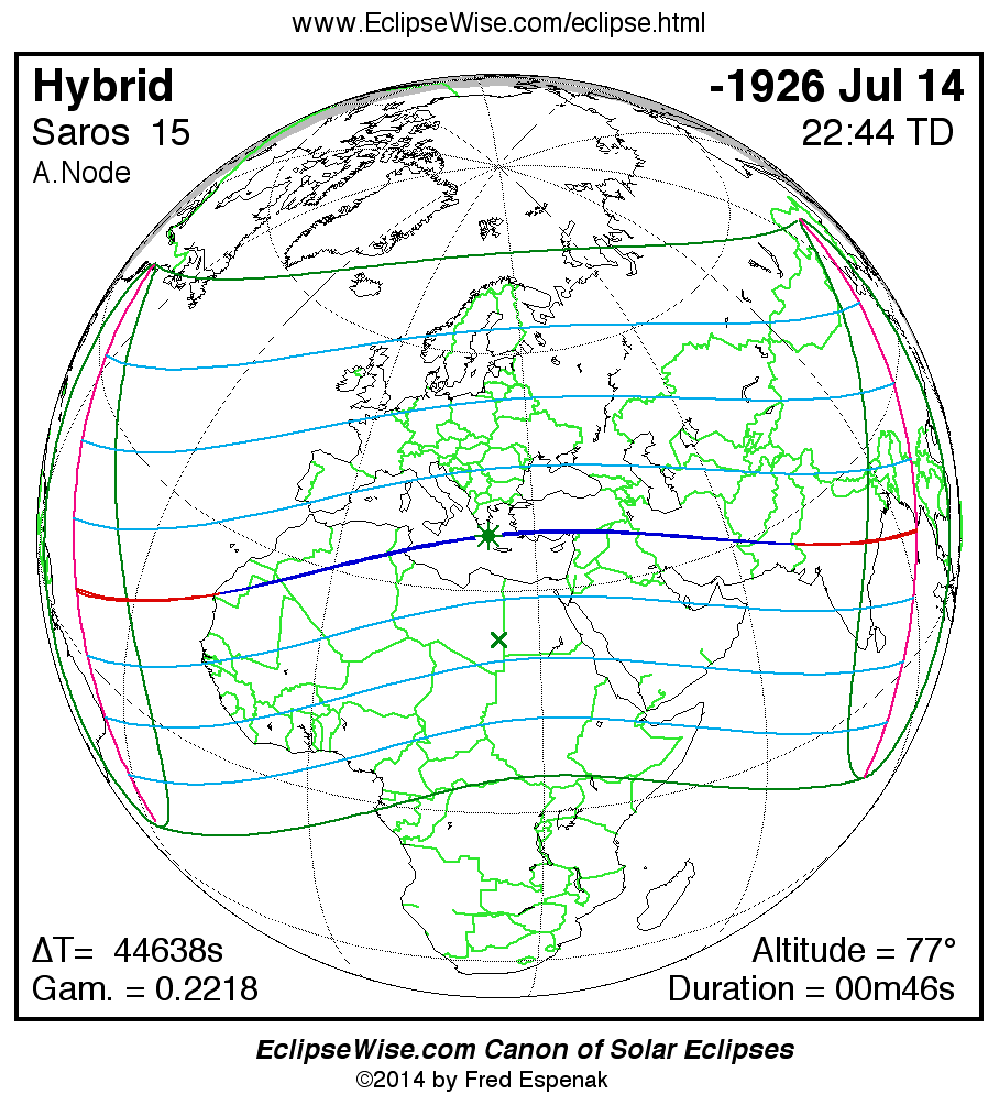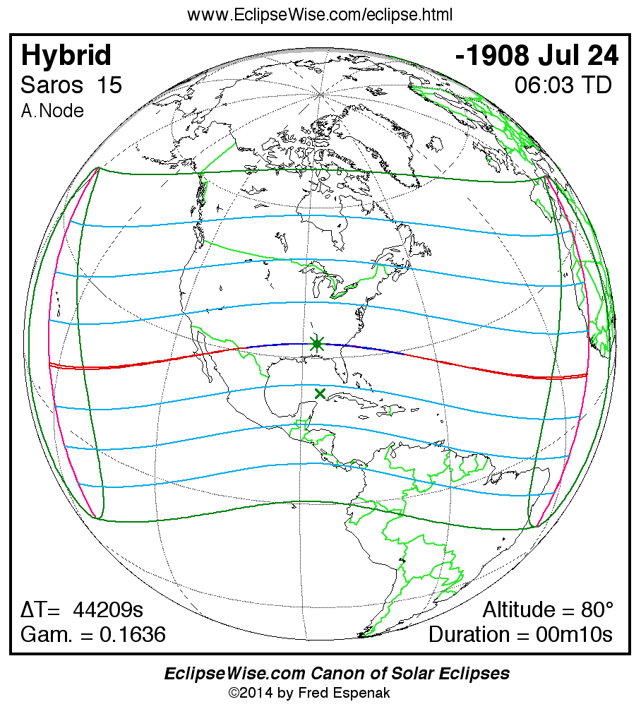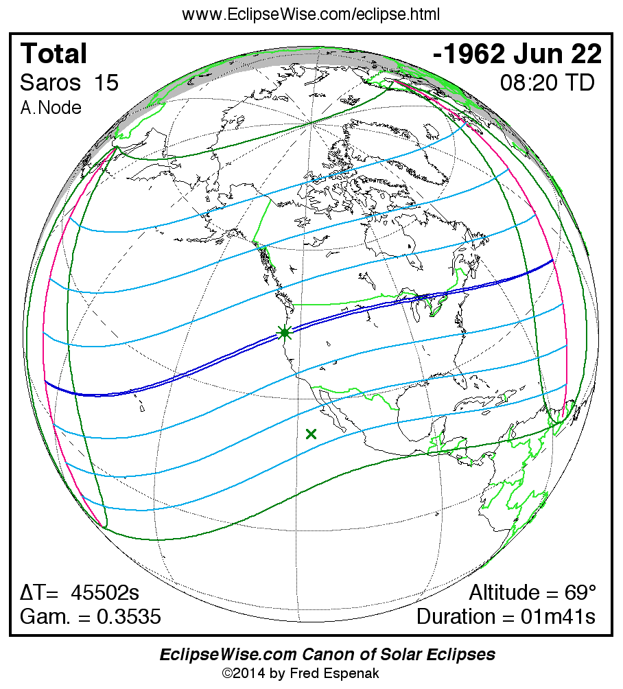 A panorama of all solar eclipses belonging to Saros 15 is presented here. Each map depicts the geographic region of visibility for a single eclipse. For central eclipses, the total or annular path is plotted in either blue (total) or red (annular). The date and time is given for the instant of Greatest Eclipse. Every map serves as a hyperlink to the EclipseWise Prime page for that eclipse where a larger map and complete details for the eclipse can be found. Visit the Key to Solar Eclipse Maps for a detailed explanation of these maps. Near the bottom of the page are a series of hyperlinks for more on solar eclipses.