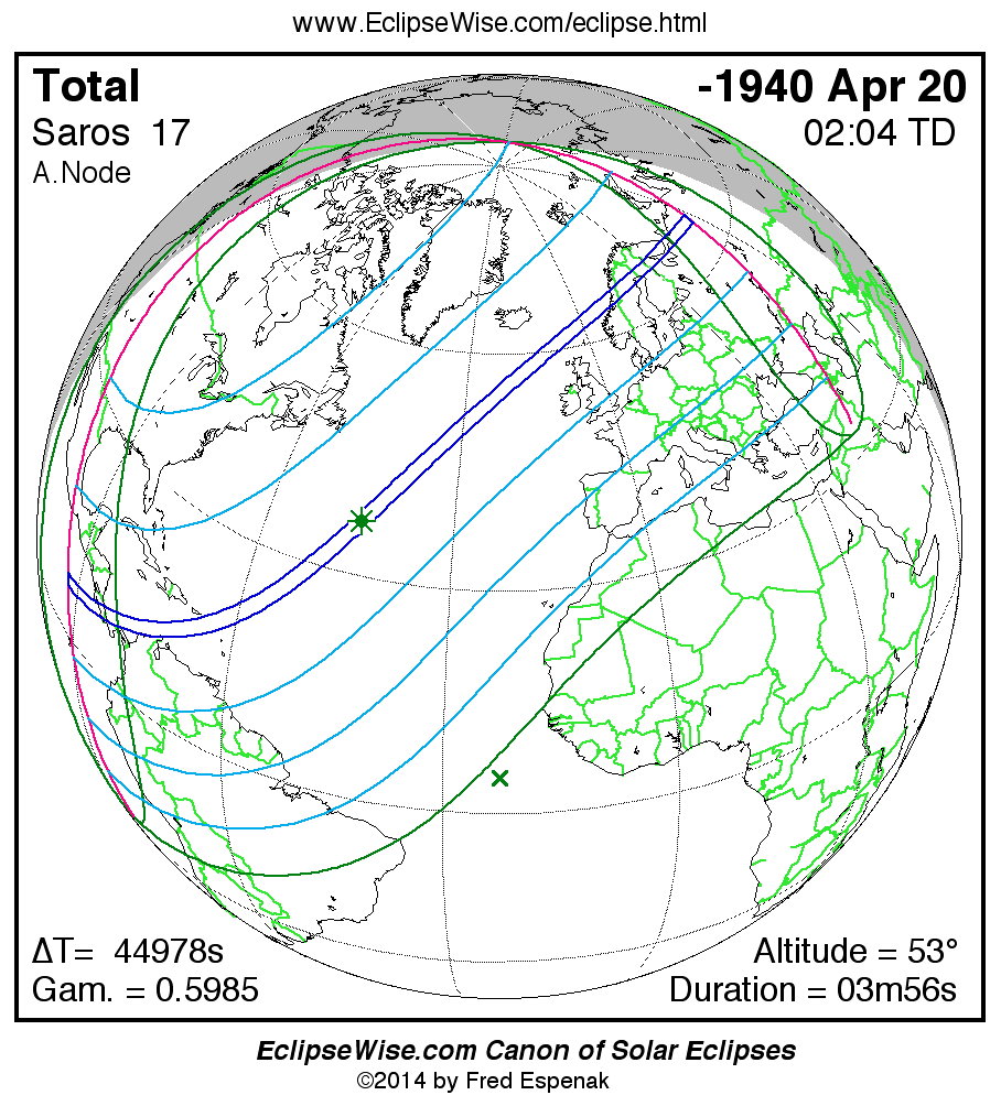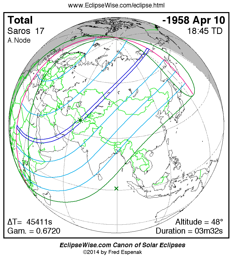 A panorama of all solar eclipses belonging to Saros 17 is presented here. Each map depicts the geographic region of visibility for a single eclipse. For central eclipses, the total or annular path is plotted in either blue (total) or red (annular). The date and time is given for the instant of Greatest Eclipse. Every map serves as a hyperlink to the EclipseWise Prime page for that eclipse where a larger map and complete details for the eclipse can be found. Visit the Key to Solar Eclipse Maps for a detailed explanation of these maps. Near the bottom of the page are a series of hyperlinks for more on solar eclipses.