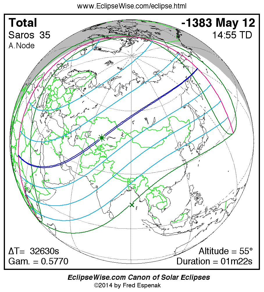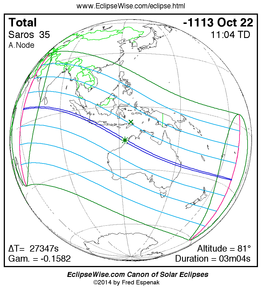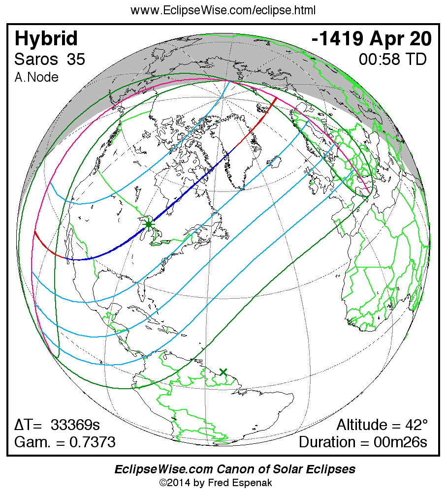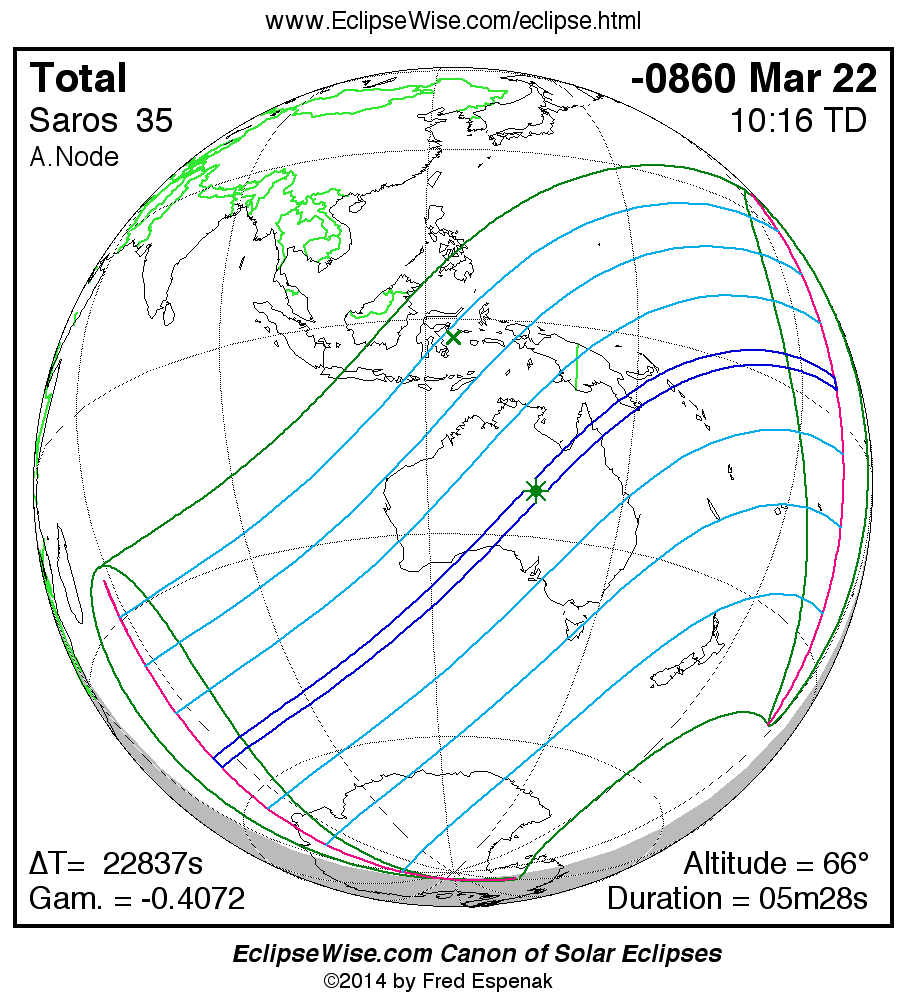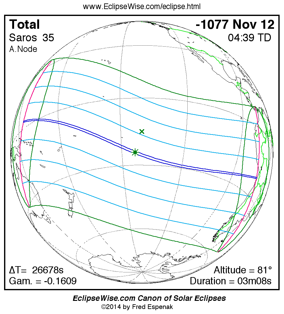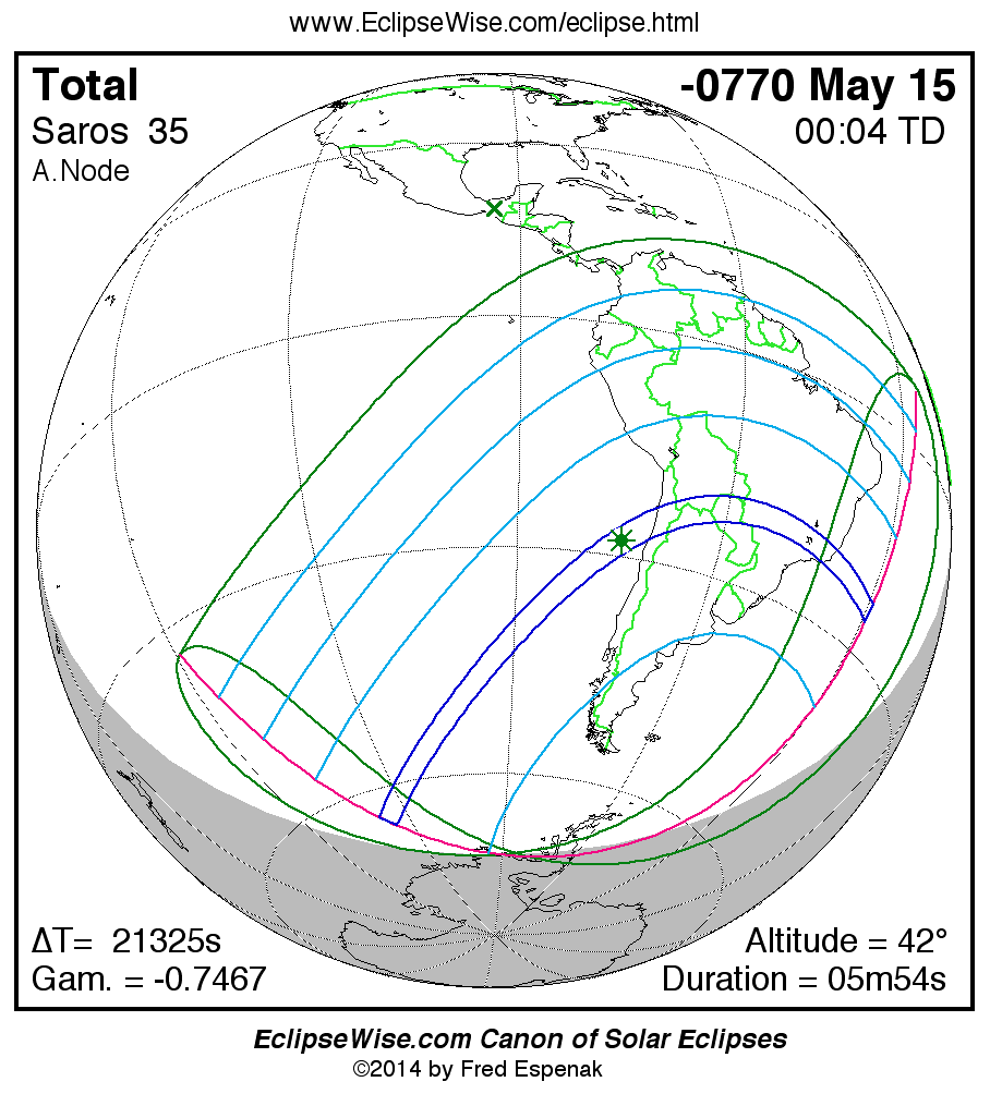 A panorama of all solar eclipses belonging to Saros 35 is presented here. Each map depicts the geographic region of visibility for a single eclipse. For central eclipses, the total or annular path is plotted in either blue (total) or red (annular). The date and time is given for the instant of Greatest Eclipse. Every map serves as a hyperlink to the EclipseWise Prime page for that eclipse where a larger map and complete details for the eclipse can be found. Visit the Key to Solar Eclipse Maps for a detailed explanation of these maps. Near the bottom of the page are a series of hyperlinks for more on solar eclipses.