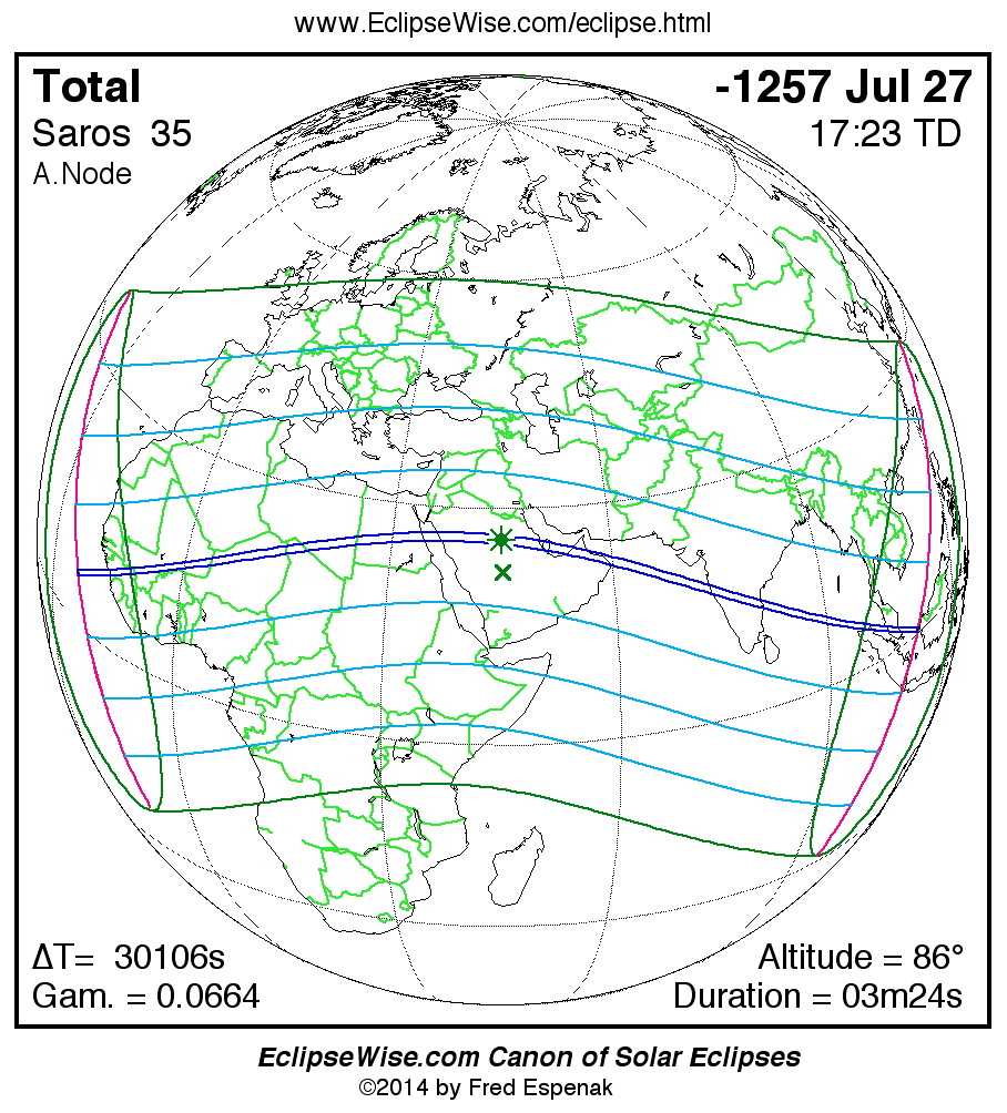 The Saros panorama below is arranged in horizontal rows of 3 eclipses. So one eclipse to the left or right is a difference of 1 Saros cycle, and one eclipse above or below is a difference of 1 exeligmos. By scanning a column of the table, it reveals how the geographic visibility of eclipses separated by an exeligmos slowly changes.