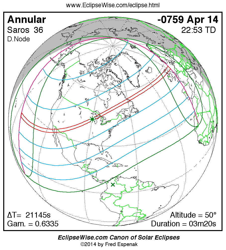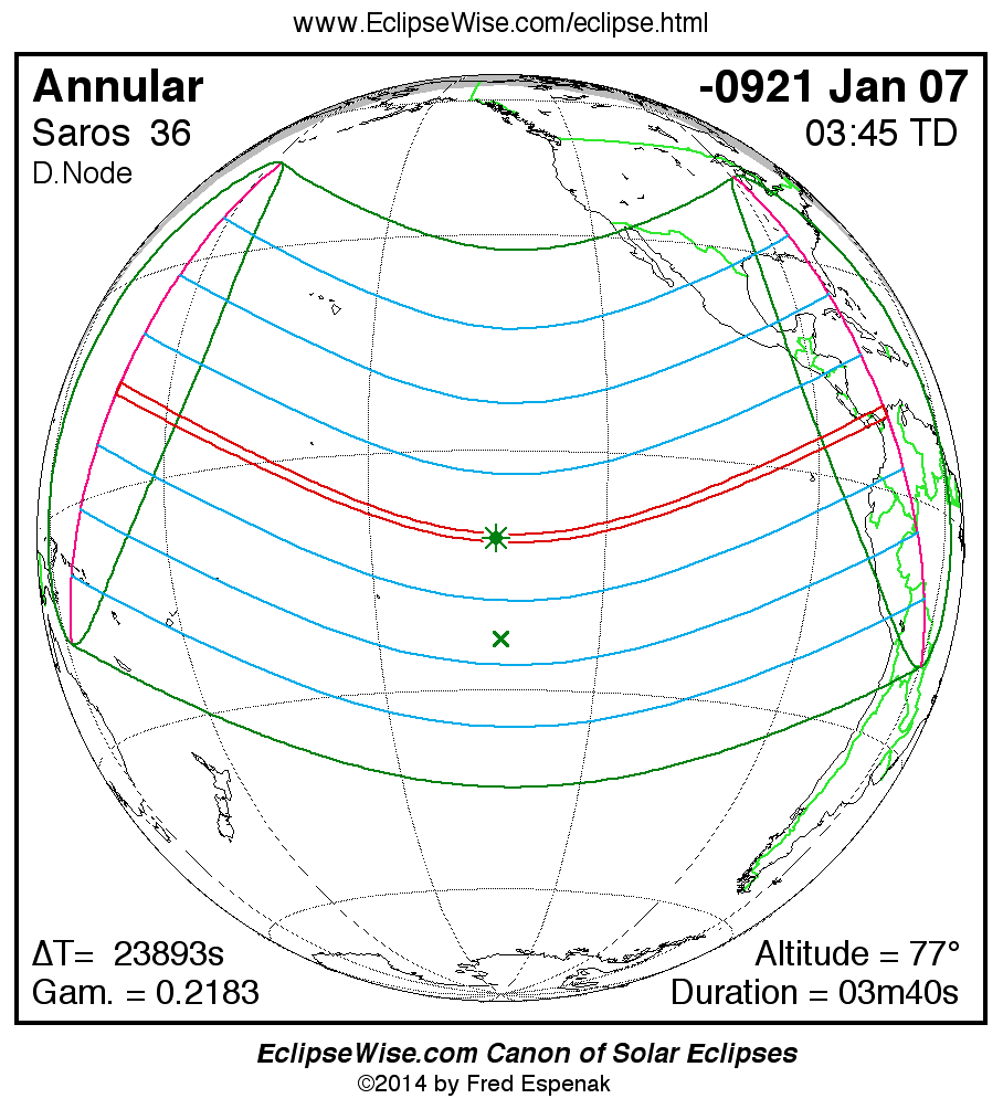 A panorama of all solar eclipses belonging to Saros 36 is presented here. Each map depicts the geographic region of visibility for a single eclipse. For central eclipses, the total or annular path is plotted in either blue (total) or red (annular). The date and time is given for the instant of Greatest Eclipse. Every map serves as a hyperlink to the EclipseWise Prime page for that eclipse where a larger map and complete details for the eclipse can be found. Visit the Key to Solar Eclipse Maps for a detailed explanation of these maps. Near the bottom of the page are a series of hyperlinks for more on solar eclipses.