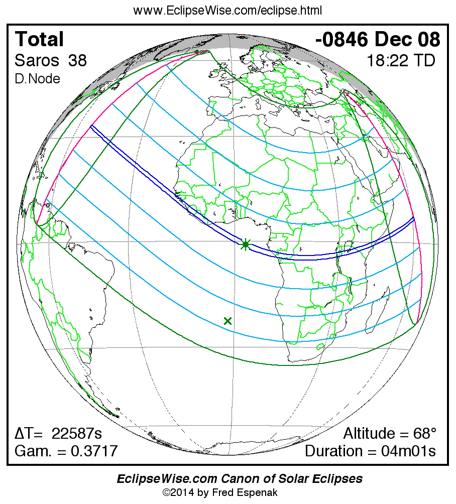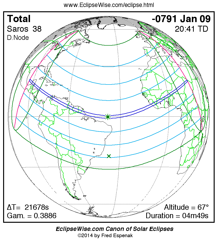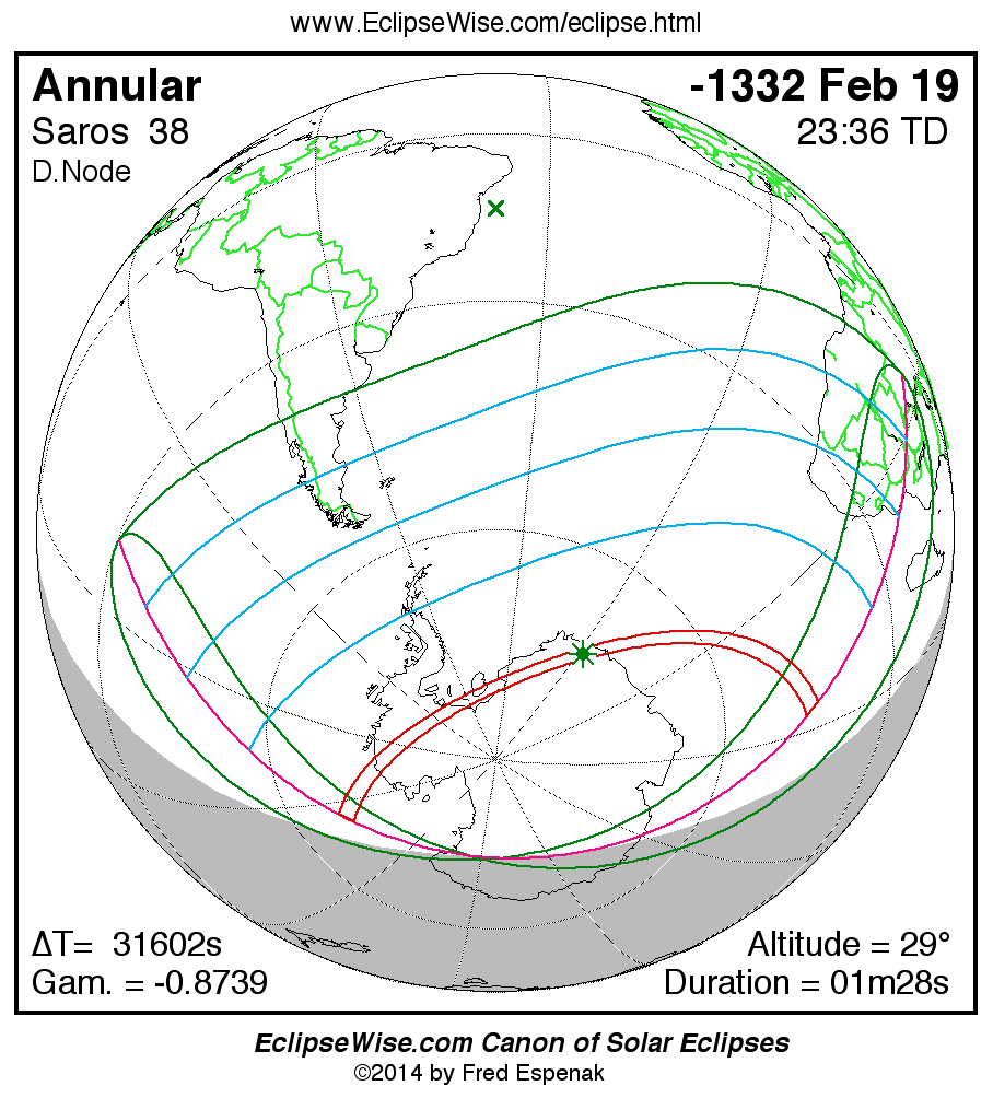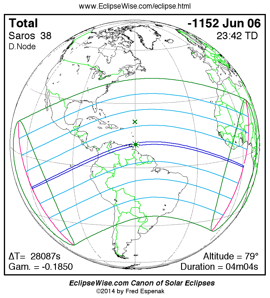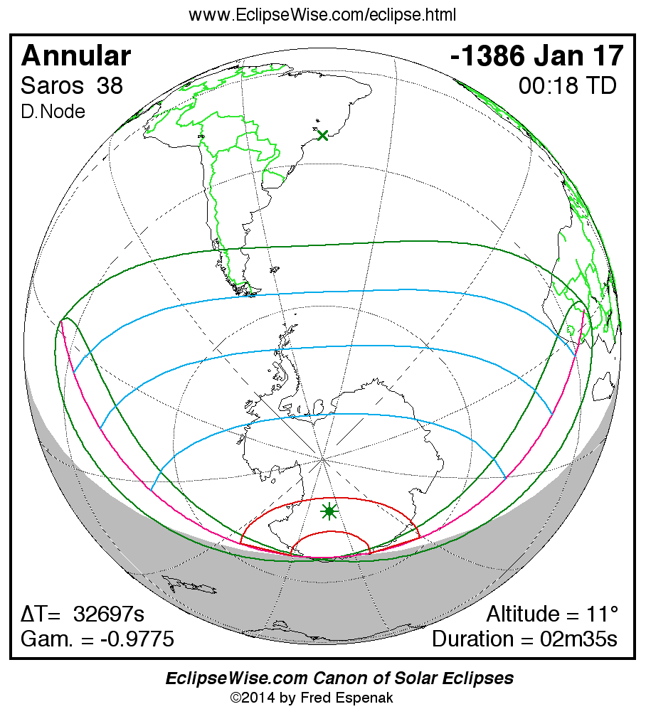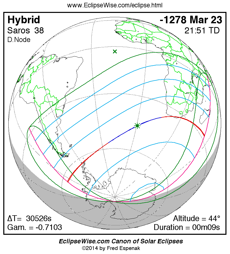 A panorama of all solar eclipses belonging to Saros 38 is presented here. Each map depicts the geographic region of visibility for a single eclipse. For central eclipses, the total or annular path is plotted in either blue (total) or red (annular). The date and time is given for the instant of Greatest Eclipse. Every map serves as a hyperlink to the EclipseWise Prime page for that eclipse where a larger map and complete details for the eclipse can be found. Visit the Key to Solar Eclipse Maps for a detailed explanation of these maps. Near the bottom of the page are a series of hyperlinks for more on solar eclipses.