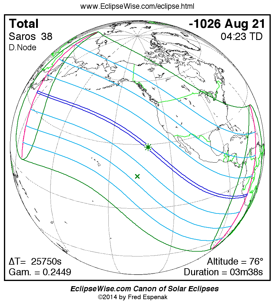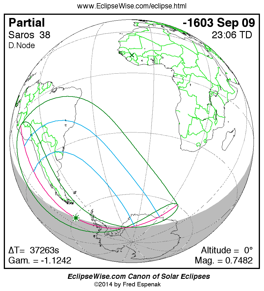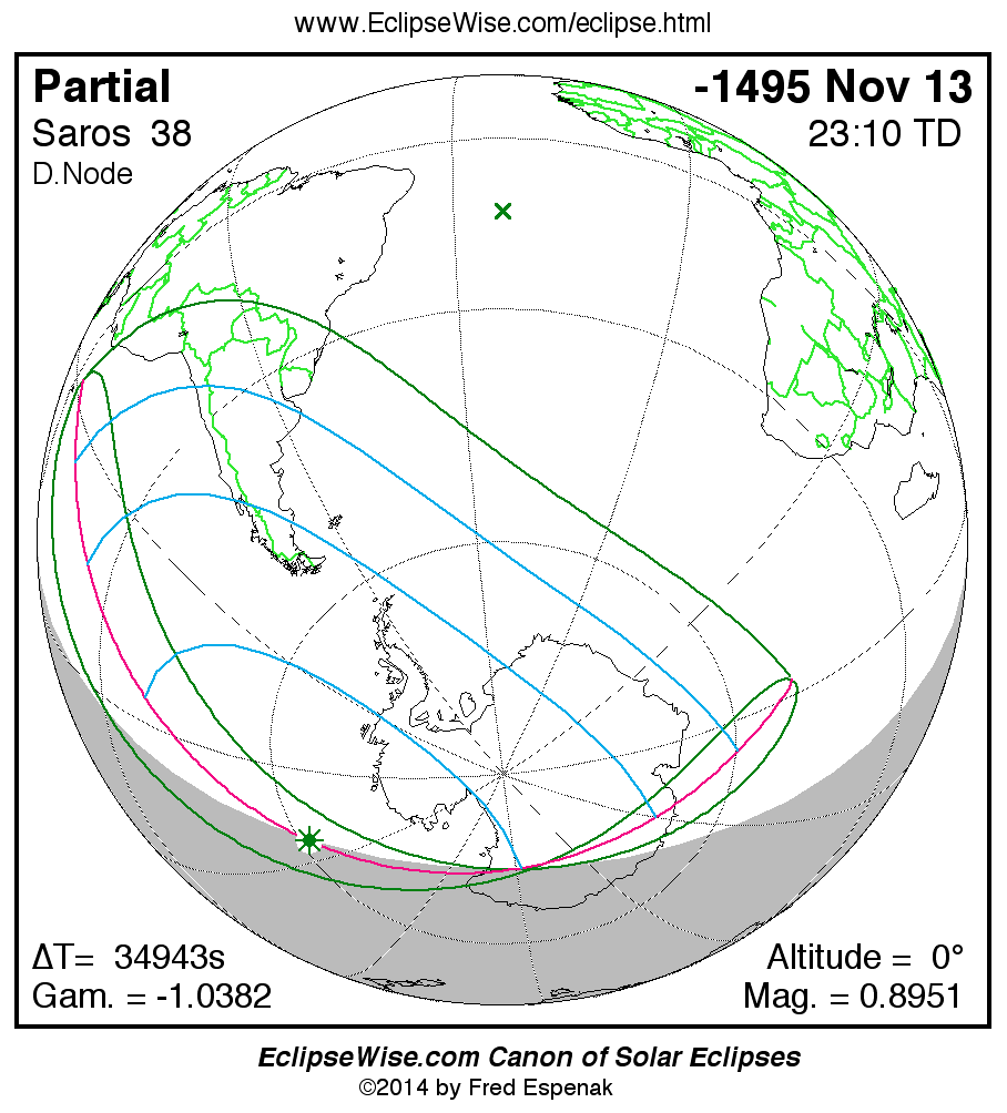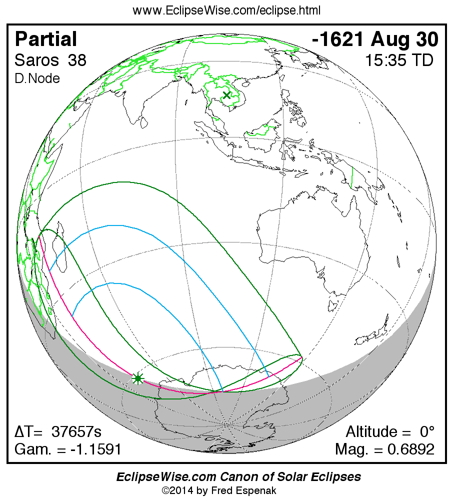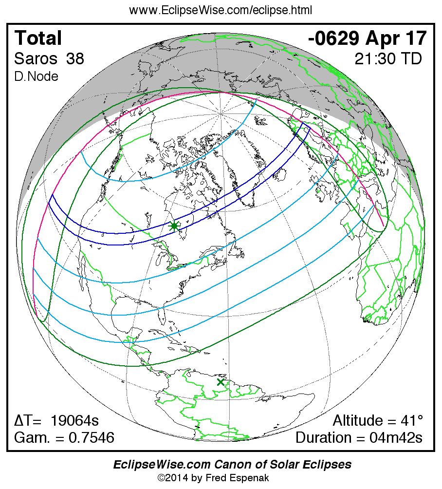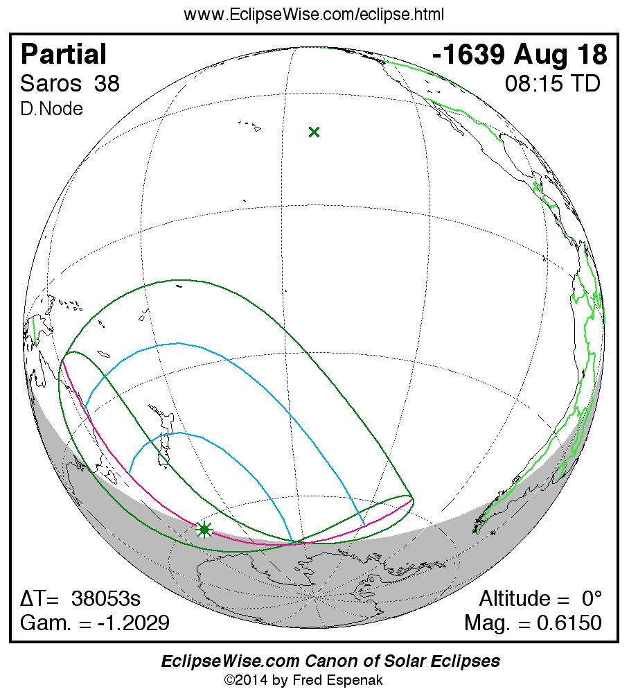 A panorama of all solar eclipses belonging to Saros 38 is presented here. Each map depicts the geographic region of visibility for a single eclipse. For central eclipses, the total or annular path is plotted in either blue (total) or red (annular). The date and time is given for the instant of Greatest Eclipse. Every map serves as a hyperlink to the EclipseWise Prime page for that eclipse where a larger map and complete details for the eclipse can be found. Visit the Key to Solar Eclipse Maps for a detailed explanation of these maps. Near the bottom of the page are a series of hyperlinks for more on solar eclipses.
