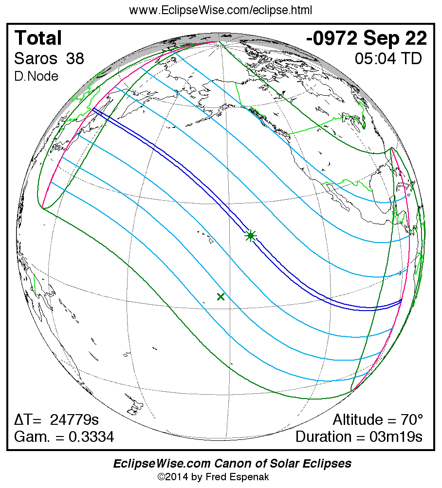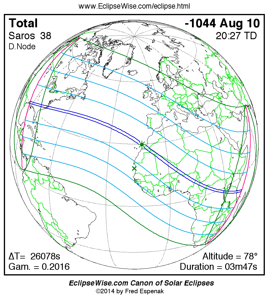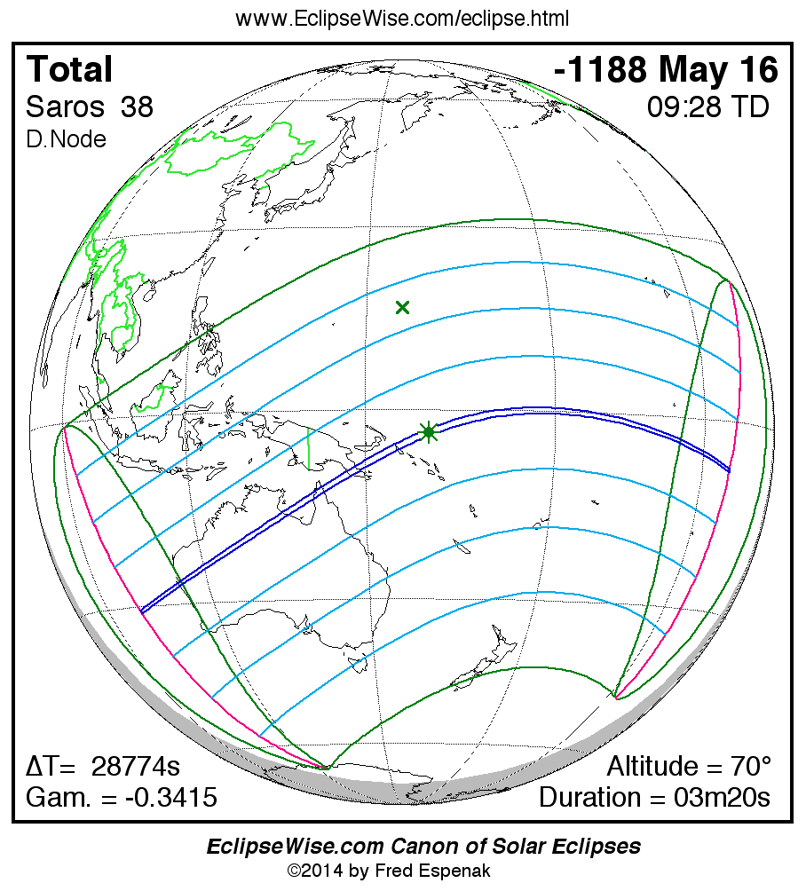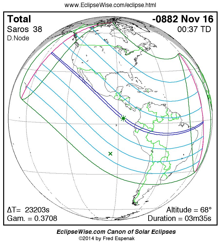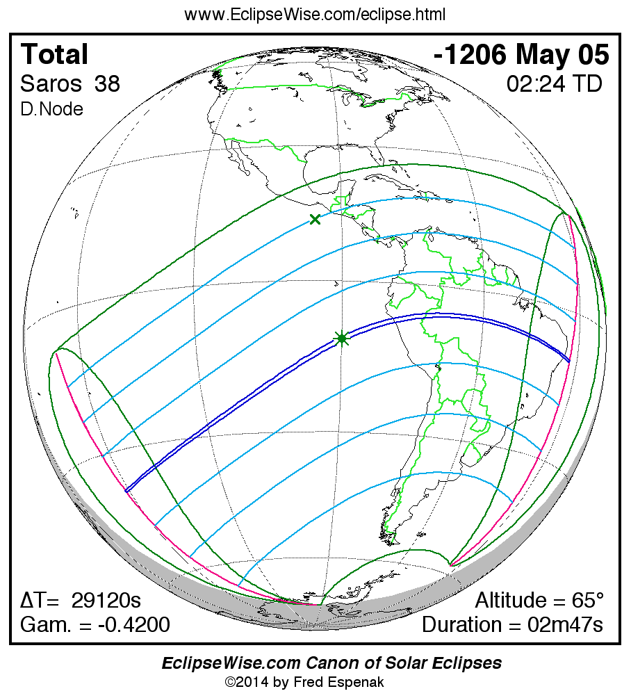 A panorama of all solar eclipses belonging to Saros 38 is presented here. Each map depicts the geographic region of visibility for a single eclipse. For central eclipses, the total or annular path is plotted in either blue (total) or red (annular). The date and time is given for the instant of Greatest Eclipse. Every map serves as a hyperlink to the EclipseWise Prime page for that eclipse where a larger map and complete details for the eclipse can be found. Visit the Key to Solar Eclipse Maps for a detailed explanation of these maps. Near the bottom of the page are a series of hyperlinks for more on solar eclipses.