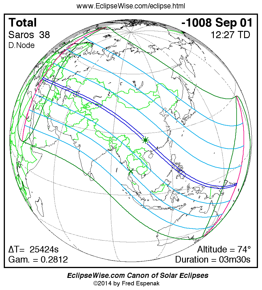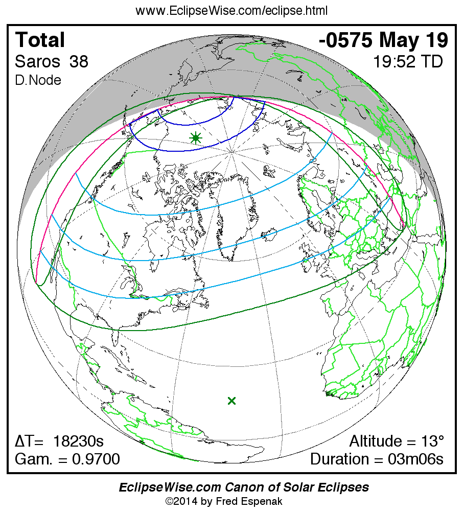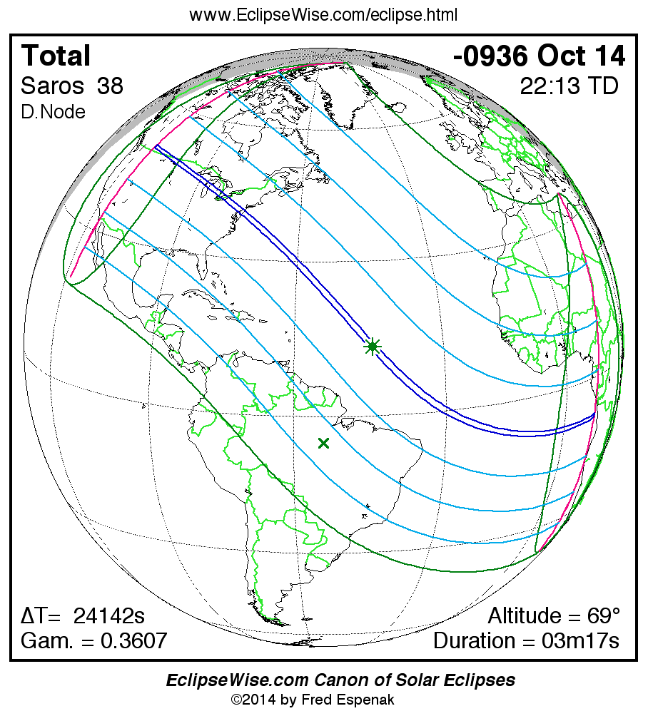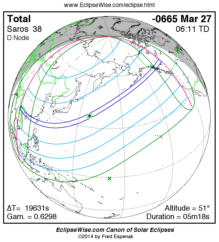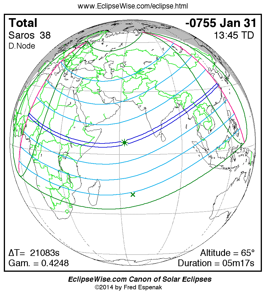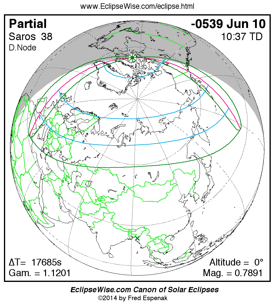 A panorama of all solar eclipses belonging to Saros 38 is presented here. Each map depicts the geographic region of visibility for a single eclipse. For central eclipses, the total or annular path is plotted in either blue (total) or red (annular). The date and time is given for the instant of Greatest Eclipse. Every map serves as a hyperlink to the EclipseWise Prime page for that eclipse where a larger map and complete details for the eclipse can be found. Visit the Key to Solar Eclipse Maps for a detailed explanation of these maps. Near the bottom of the page are a series of hyperlinks for more on solar eclipses.