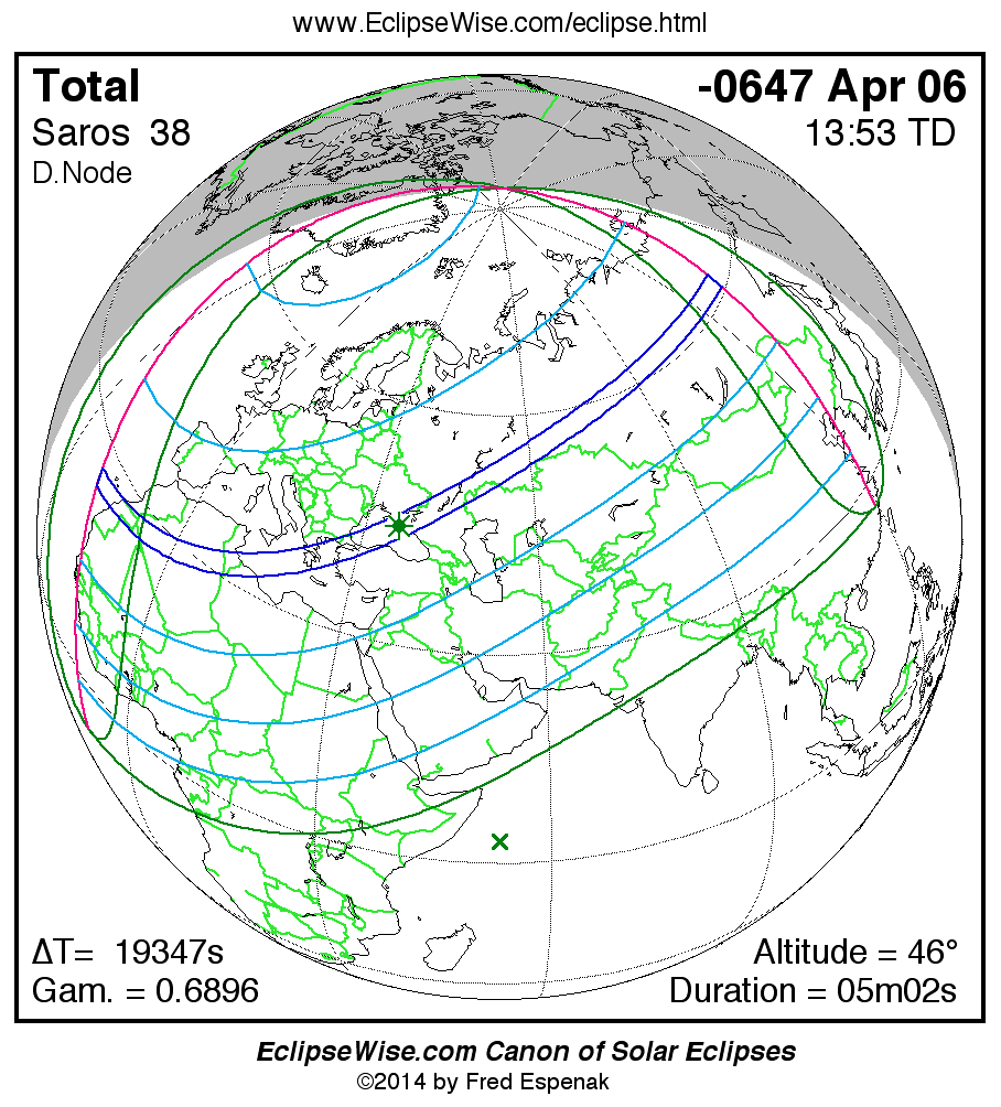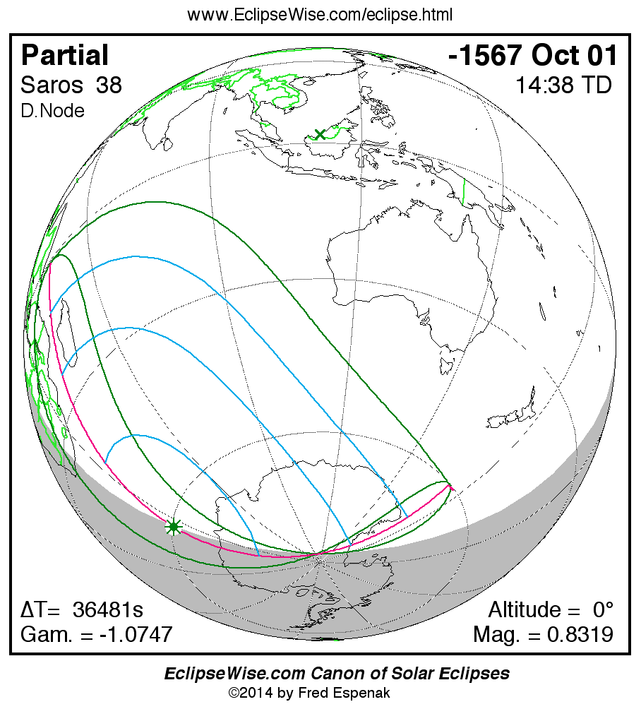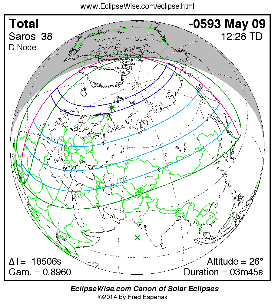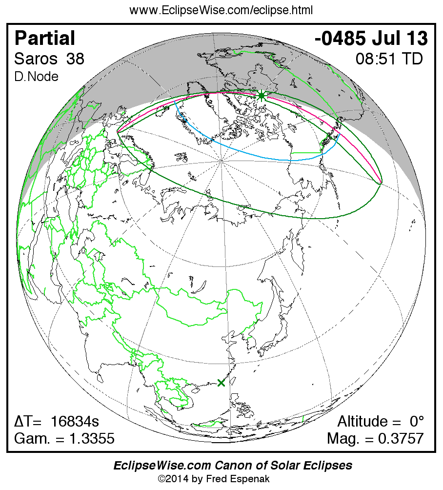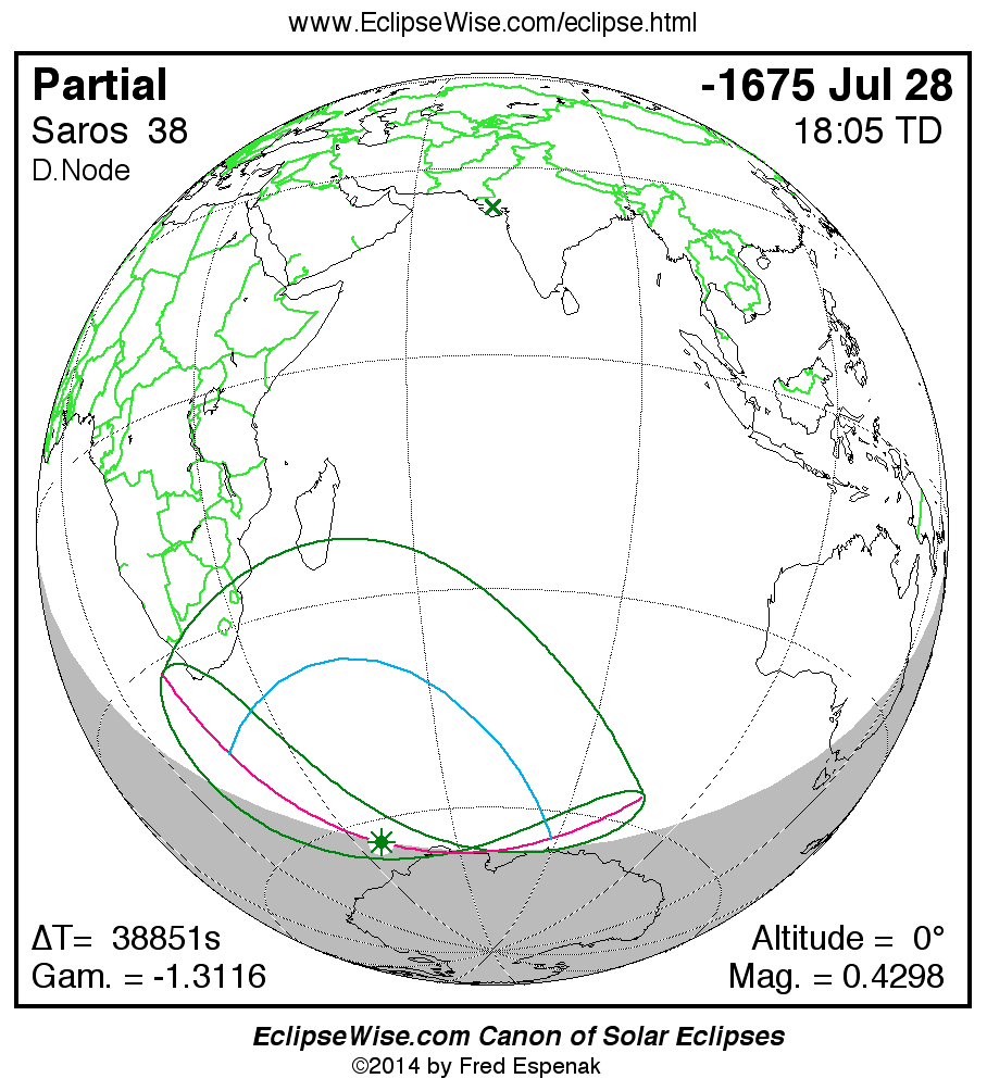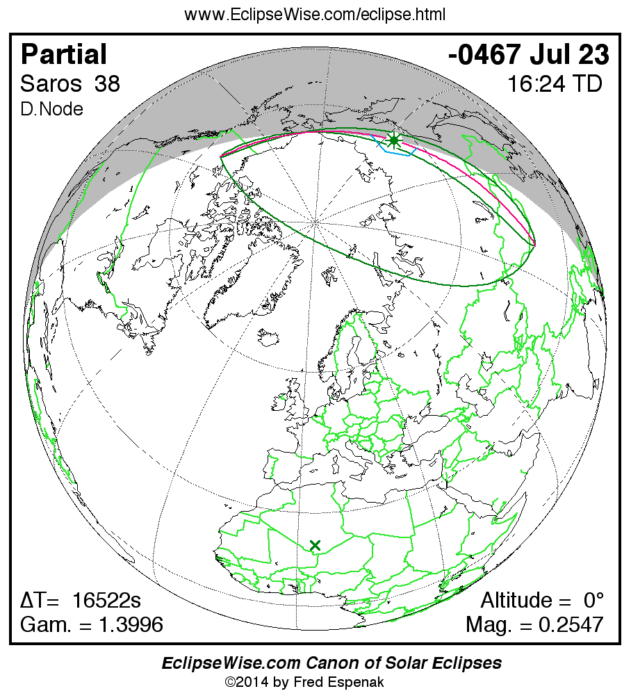 A panorama of all solar eclipses belonging to Saros 38 is presented here. Each map depicts the geographic region of visibility for a single eclipse. For central eclipses, the total or annular path is plotted in either blue (total) or red (annular). The date and time is given for the instant of Greatest Eclipse. Every map serves as a hyperlink to the EclipseWise Prime page for that eclipse where a larger map and complete details for the eclipse can be found. Visit the Key to Solar Eclipse Maps for a detailed explanation of these maps. Near the bottom of the page are a series of hyperlinks for more on solar eclipses.