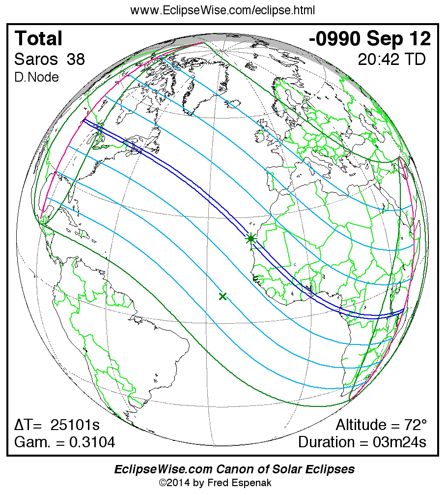 The Saros panorama below is arranged in horizontal rows of 3 eclipses. So one eclipse to the left or right is a difference of 1 Saros cycle, and one eclipse above or below is a difference of 1 exeligmos. By scanning a column of the table, it reveals how the geographic visibility of eclipses separated by an exeligmos slowly changes.