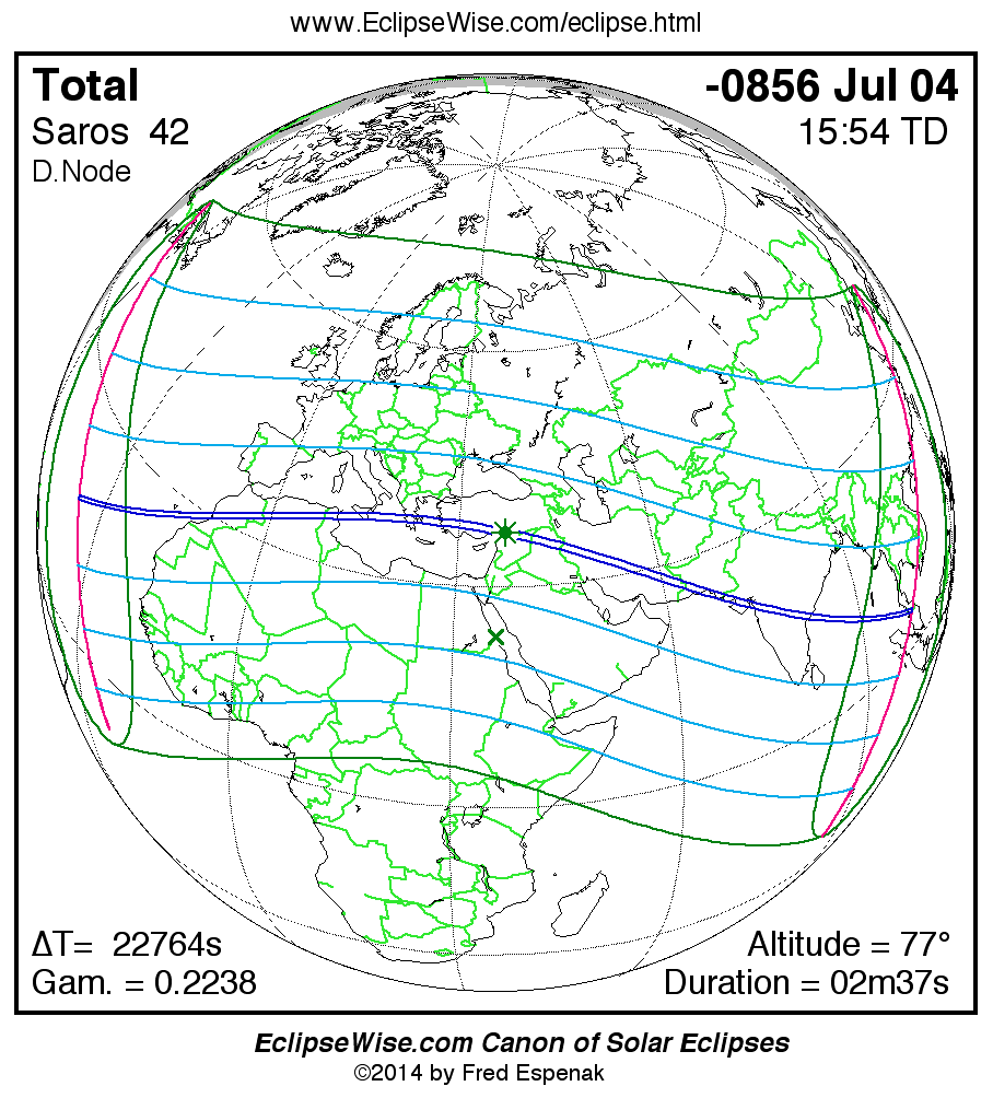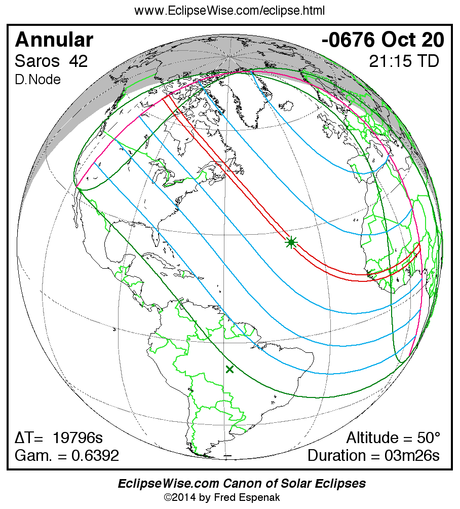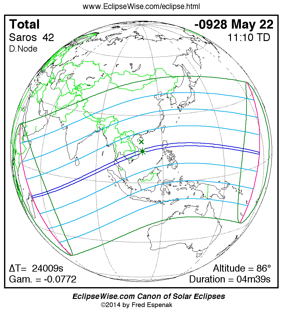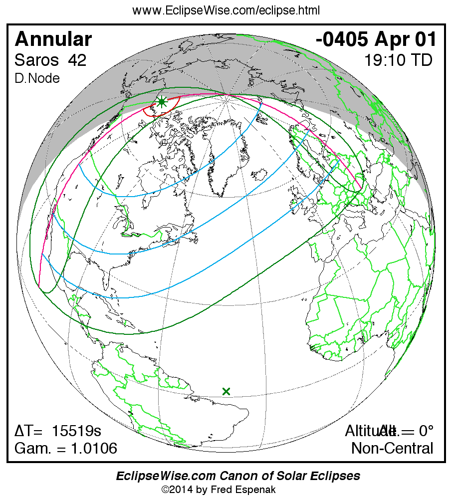A panorama of all solar eclipses belonging to Saros 42 is presented here. Each map depicts the geographic region of visibility for a single eclipse. For central eclipses, the total or annular path is plotted in either blue (total) or red (annular). The date and time is given for the instant of Greatest Eclipse. Every map serves as a hyperlink to the EclipseWise Prime page for that eclipse where a larger map and complete details for the eclipse can be found. Visit the Key to Solar Eclipse Maps for a detailed explanation of these maps. Near the bottom of the page are a series of hyperlinks for more on solar eclipses.