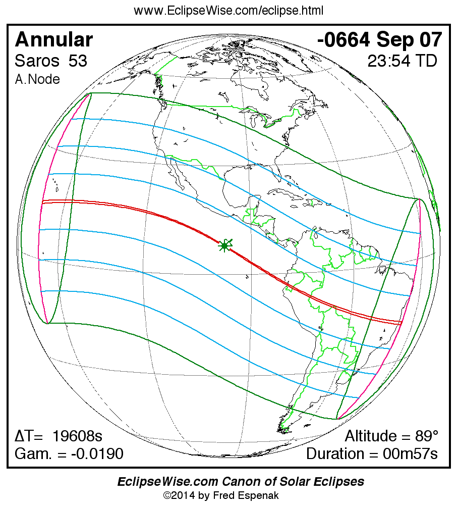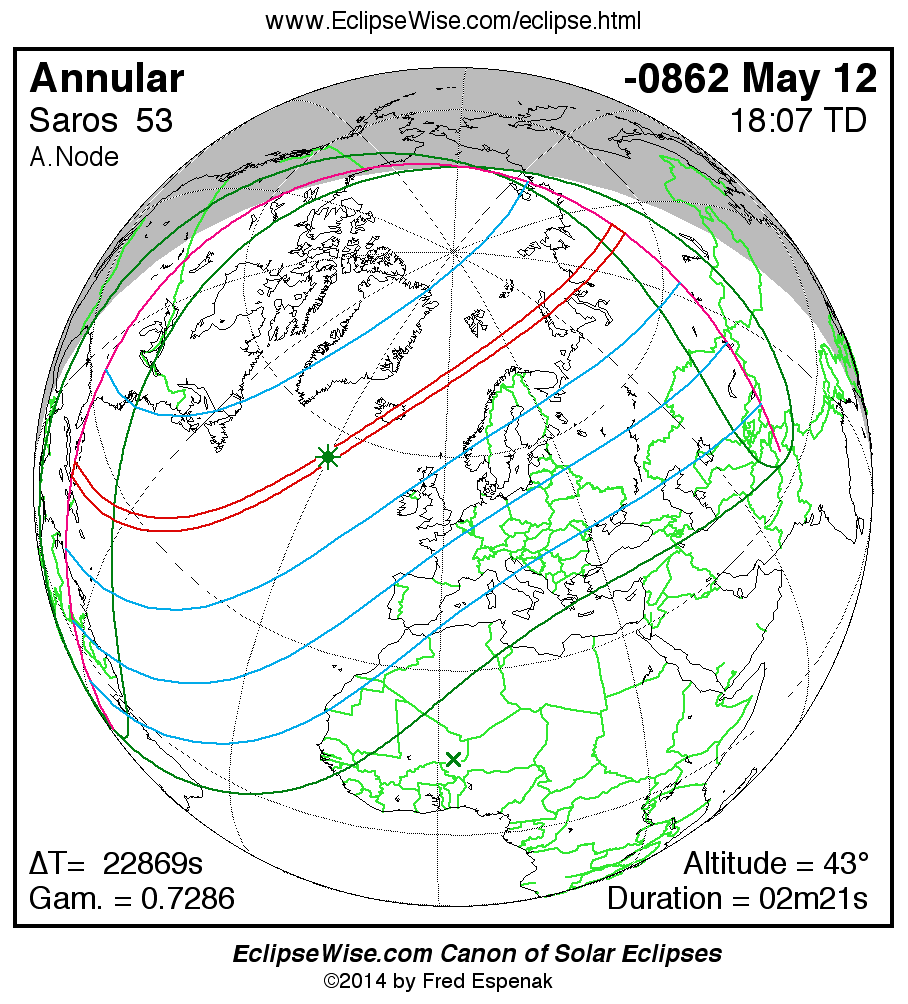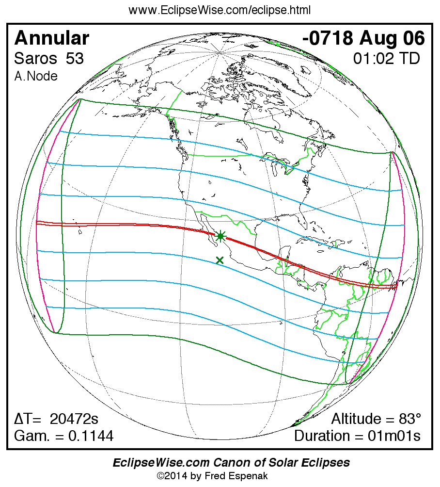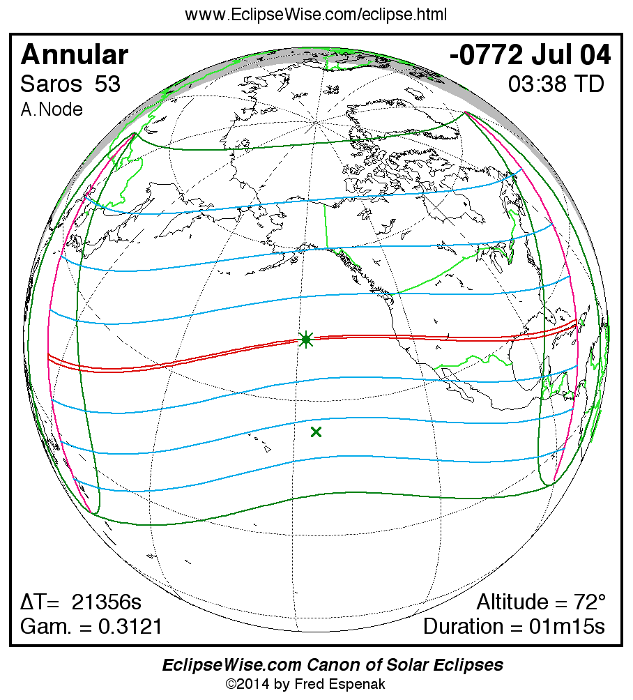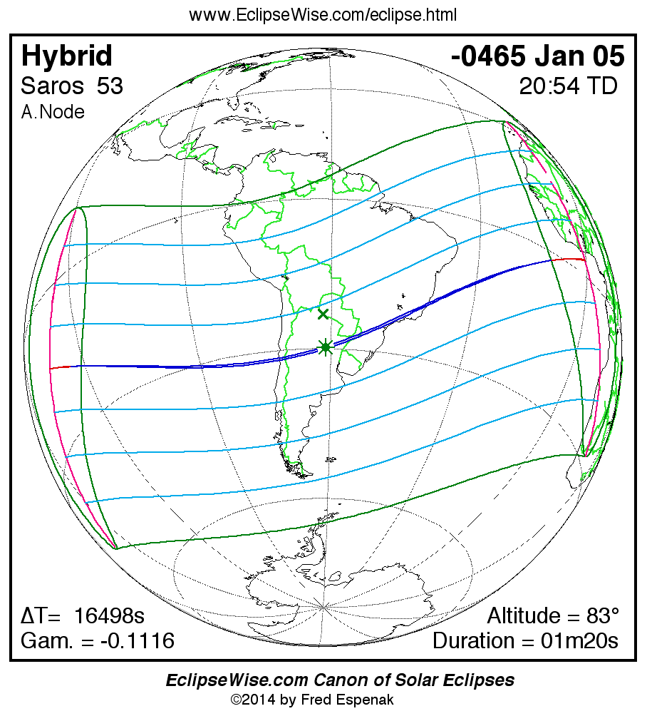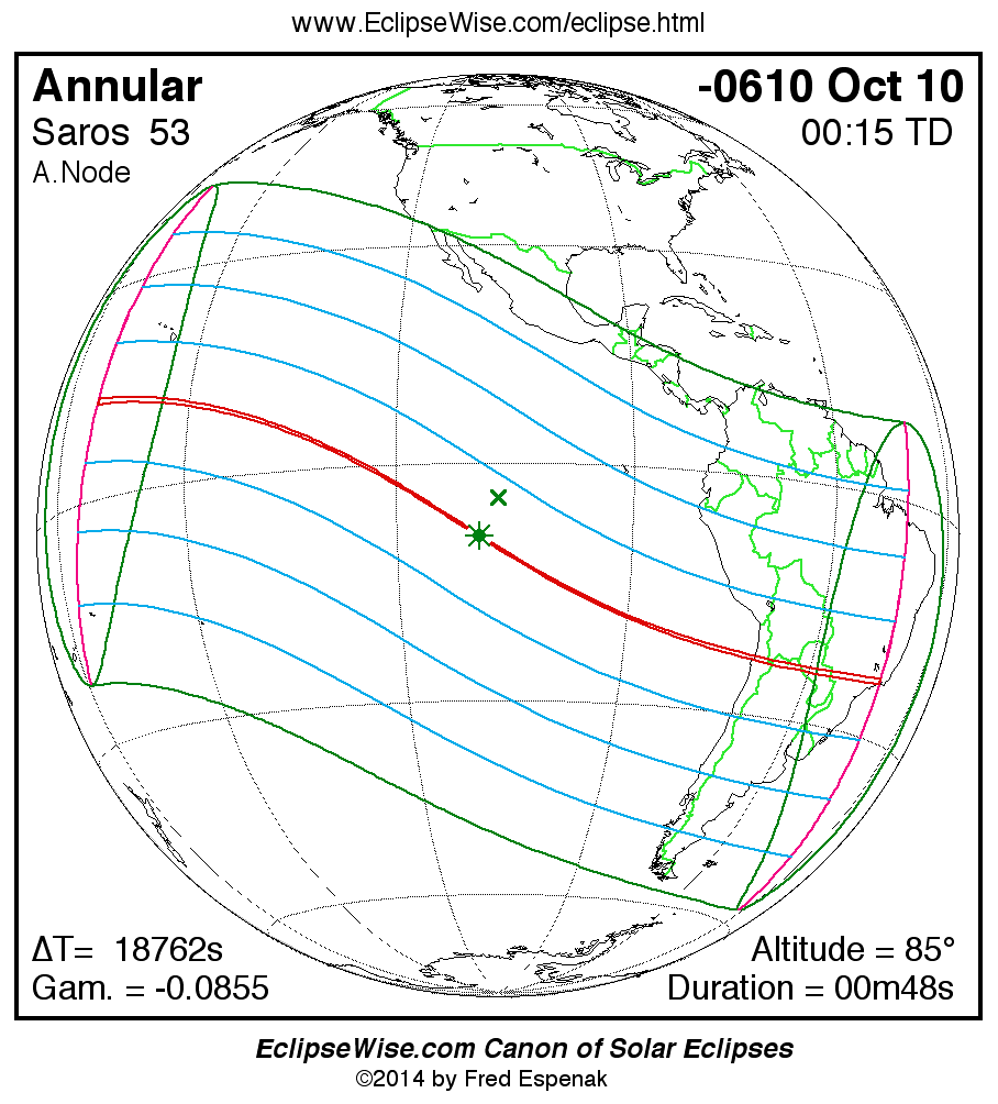 A panorama of all solar eclipses belonging to Saros 53 is presented here. Each map depicts the geographic region of visibility for a single eclipse. For central eclipses, the total or annular path is plotted in either blue (total) or red (annular). The date and time is given for the instant of Greatest Eclipse. Every map serves as a hyperlink to the EclipseWise Prime page for that eclipse where a larger map and complete details for the eclipse can be found. Visit the Key to Solar Eclipse Maps for a detailed explanation of these maps. Near the bottom of the page are a series of hyperlinks for more on solar eclipses.