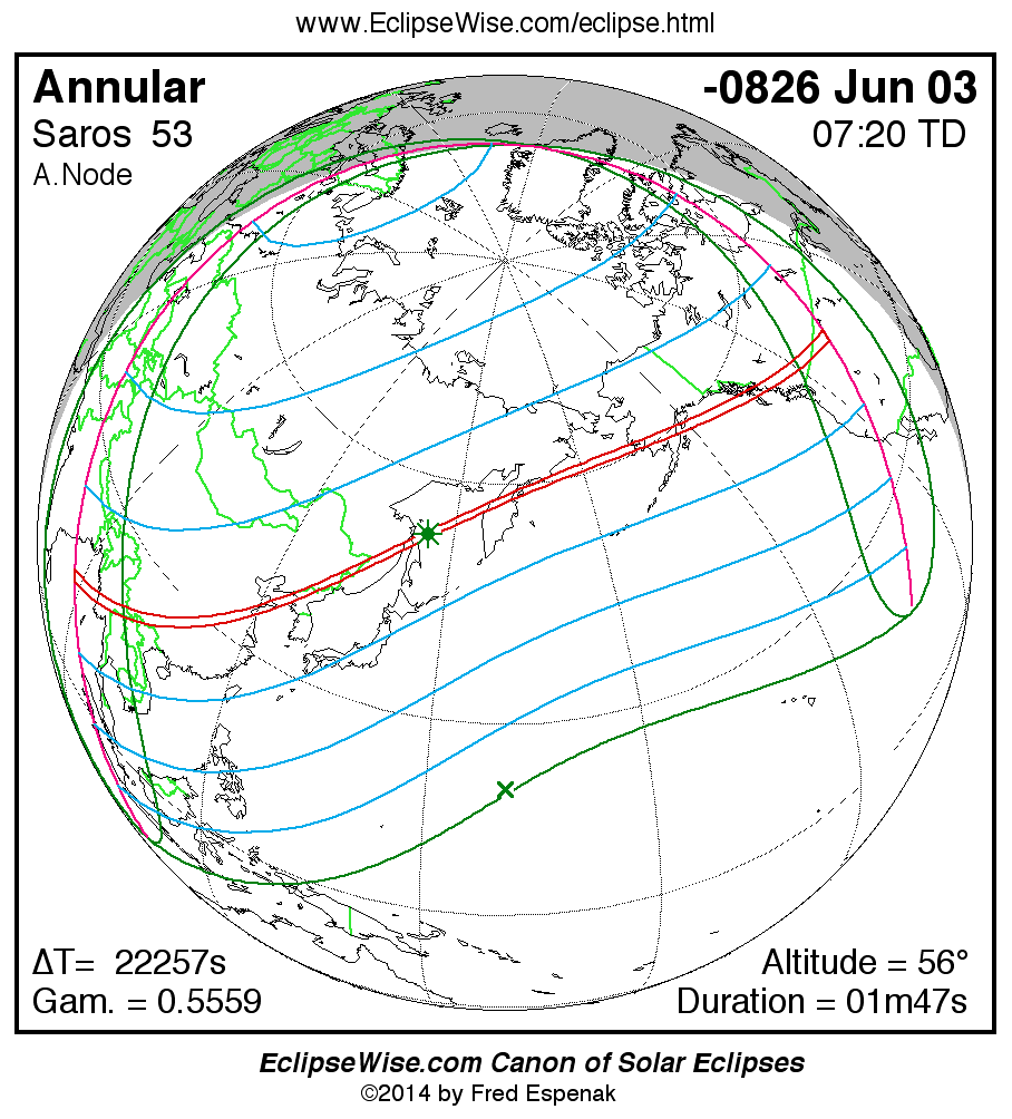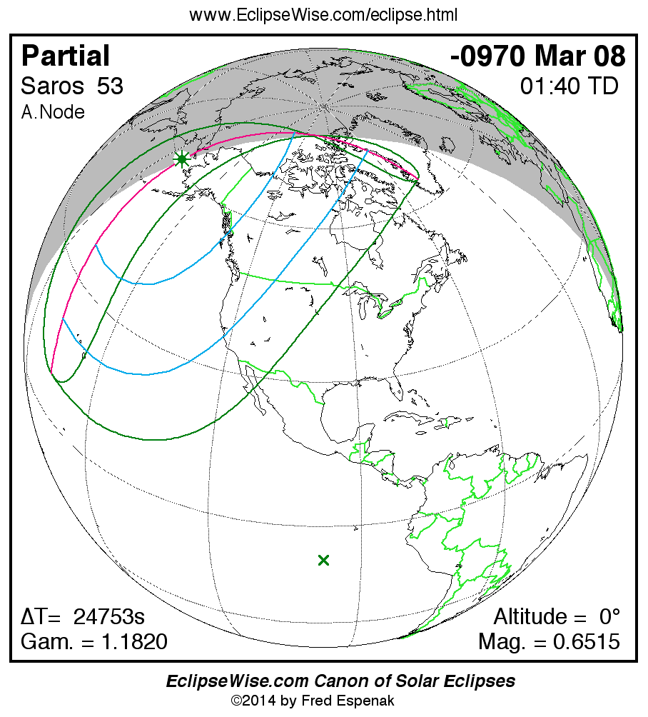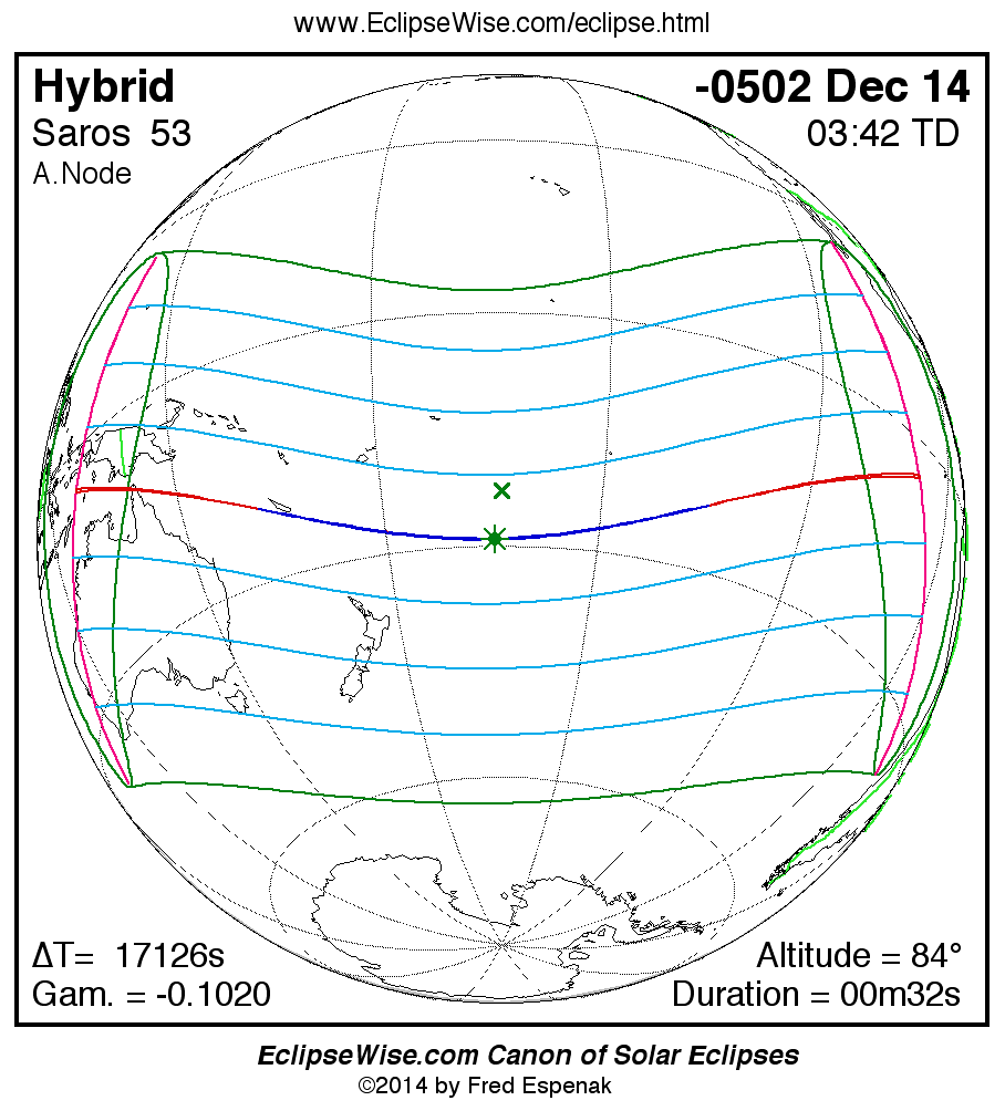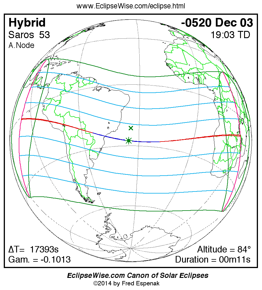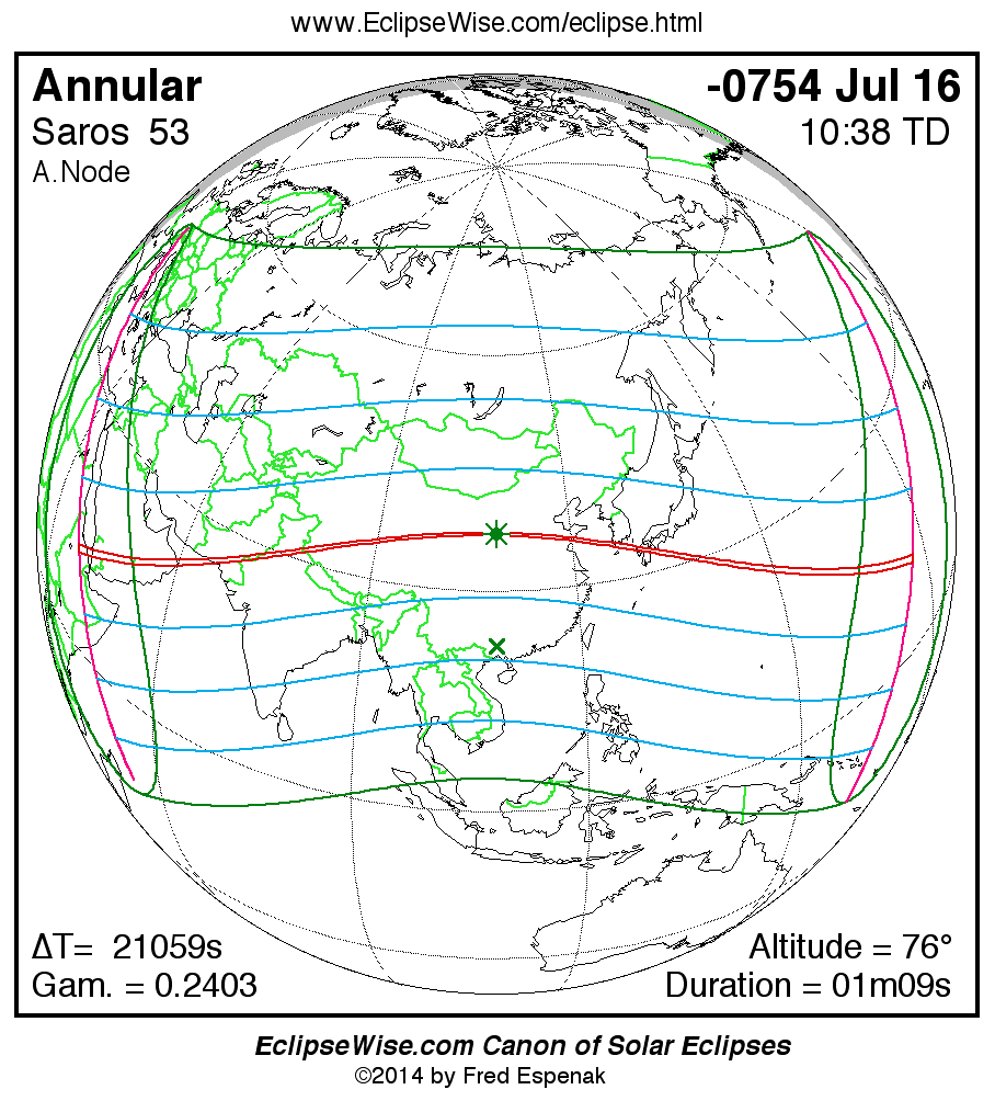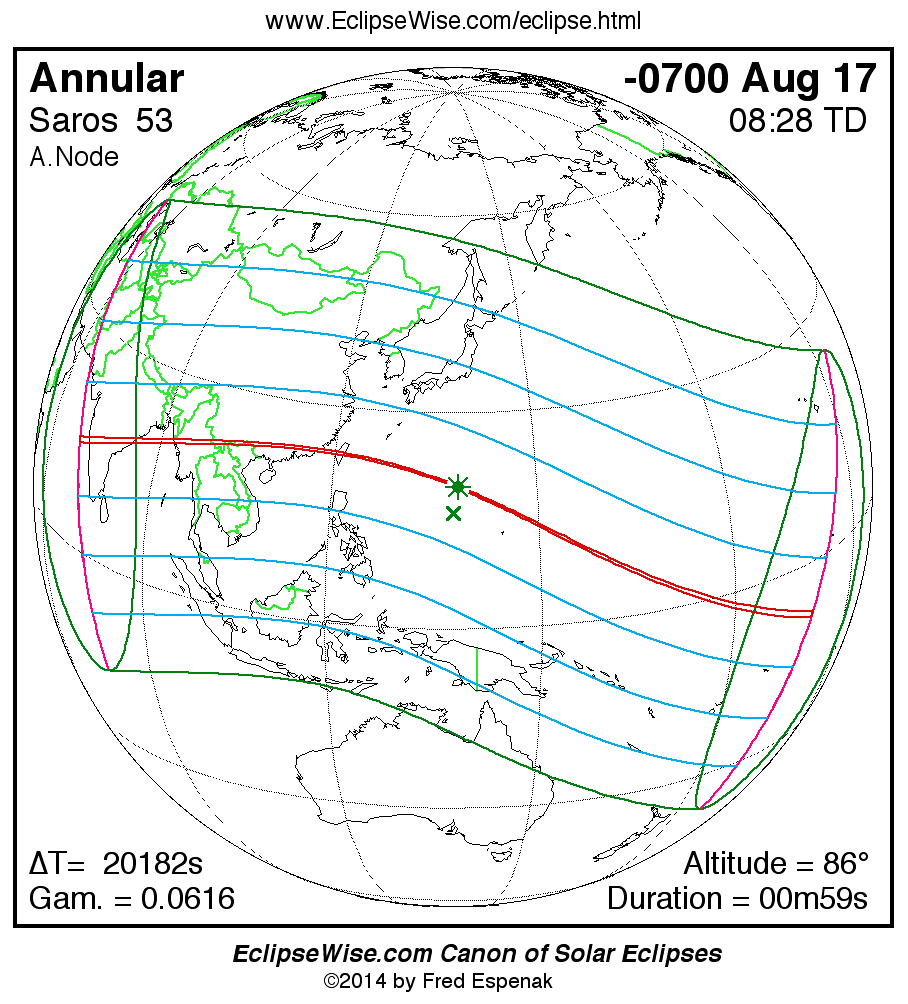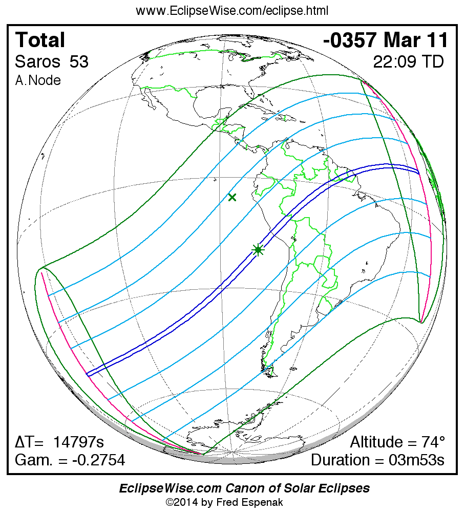 A panorama of all solar eclipses belonging to Saros 53 is presented here. Each map depicts the geographic region of visibility for a single eclipse. For central eclipses, the total or annular path is plotted in either blue (total) or red (annular). The date and time is given for the instant of Greatest Eclipse. Every map serves as a hyperlink to the EclipseWise Prime page for that eclipse where a larger map and complete details for the eclipse can be found. Visit the Key to Solar Eclipse Maps for a detailed explanation of these maps. Near the bottom of the page are a series of hyperlinks for more on solar eclipses.