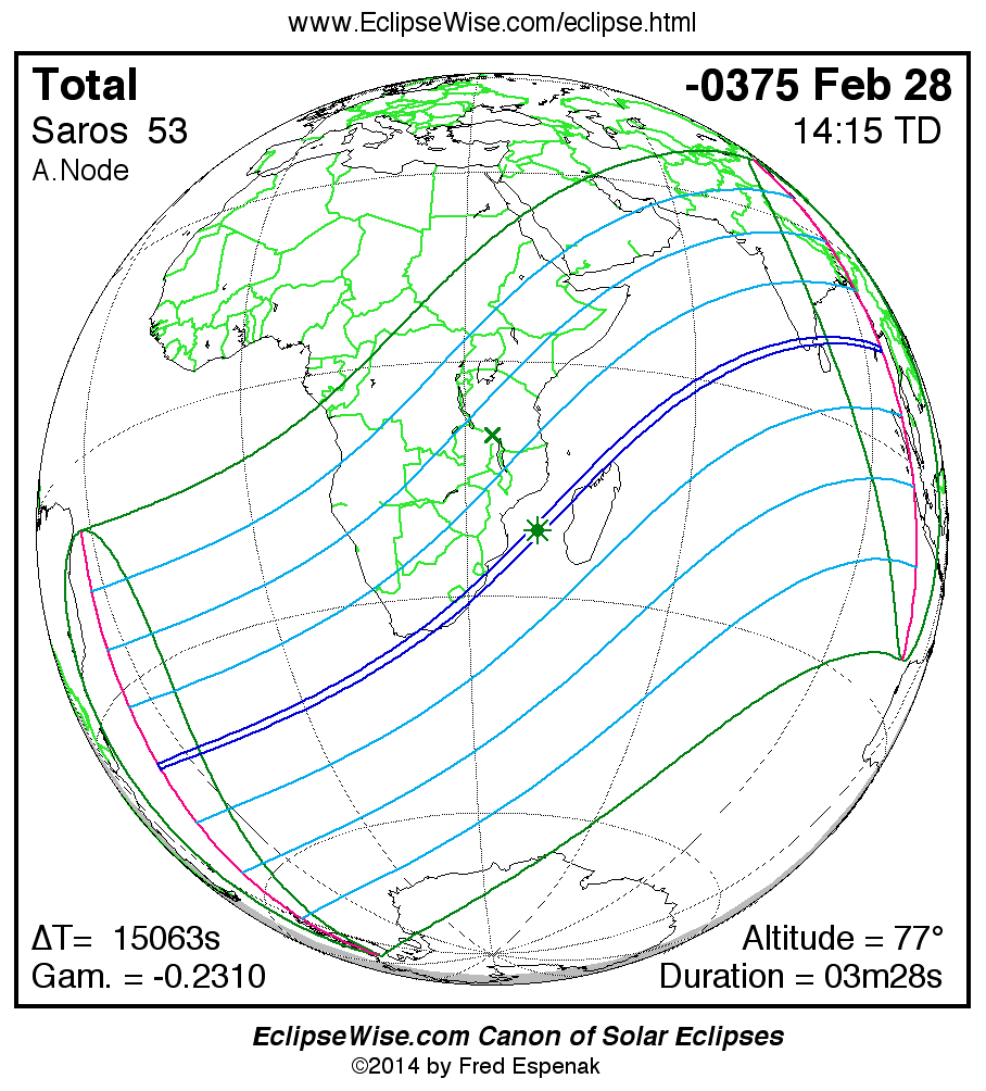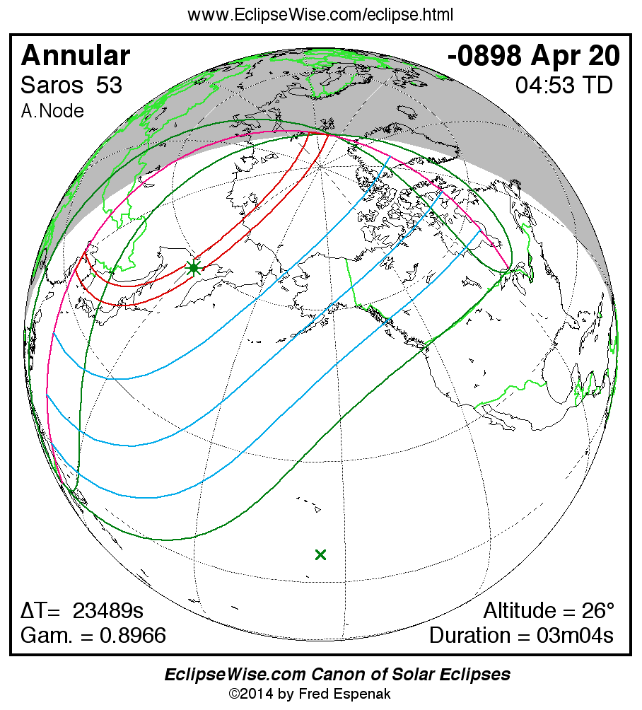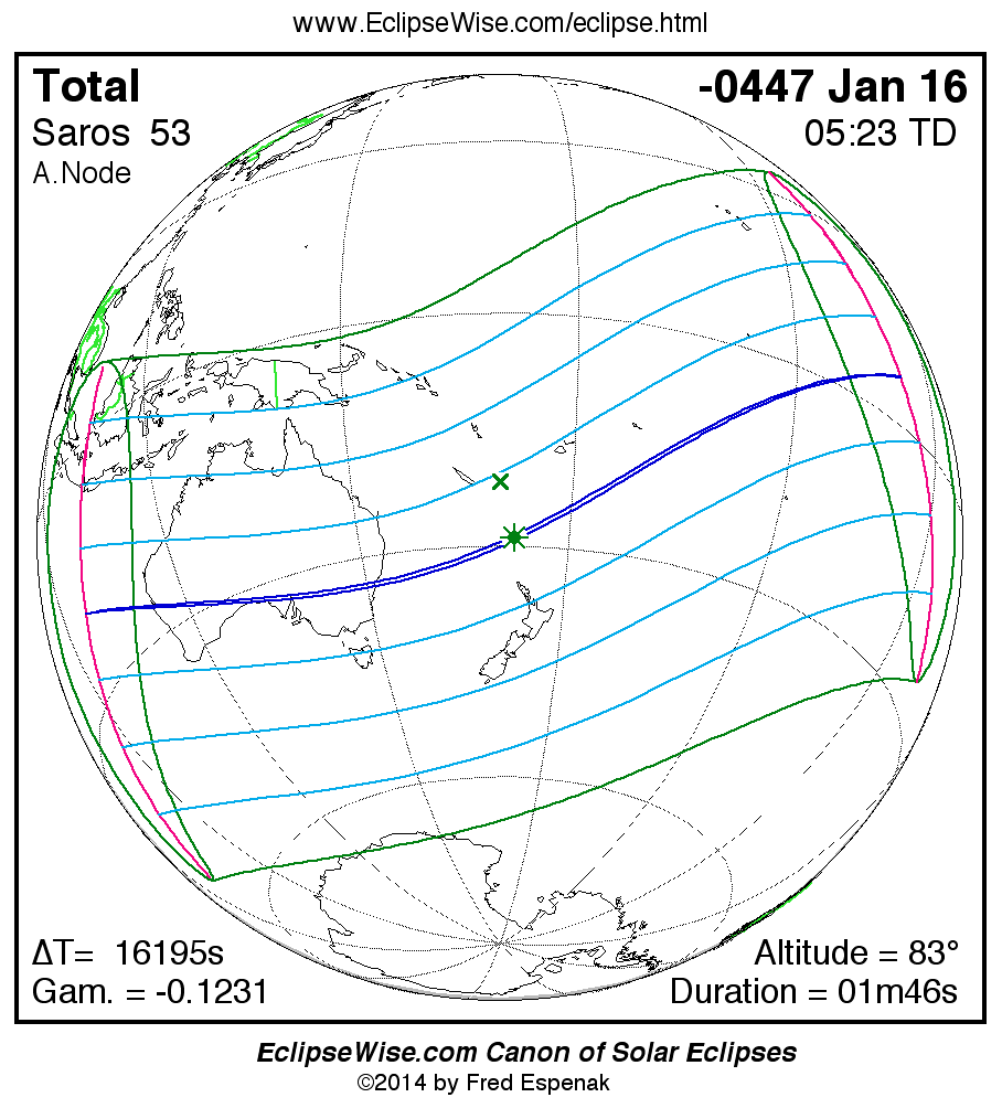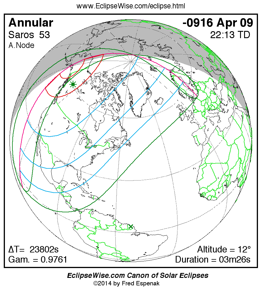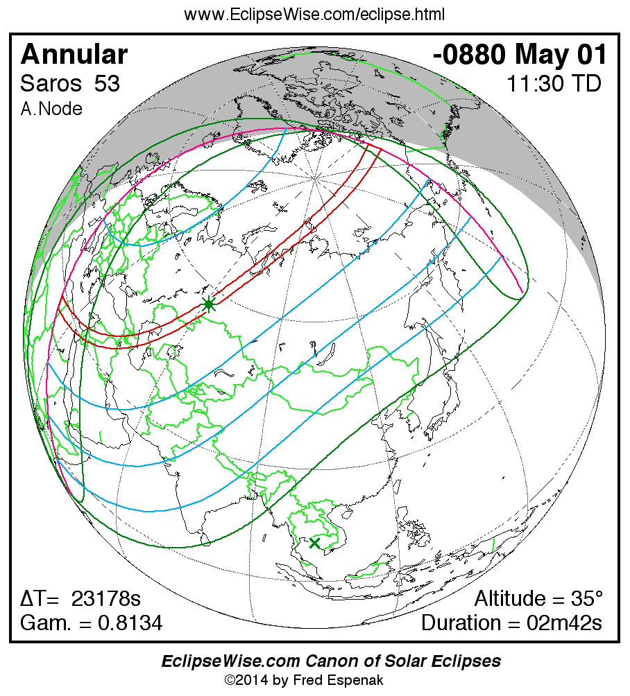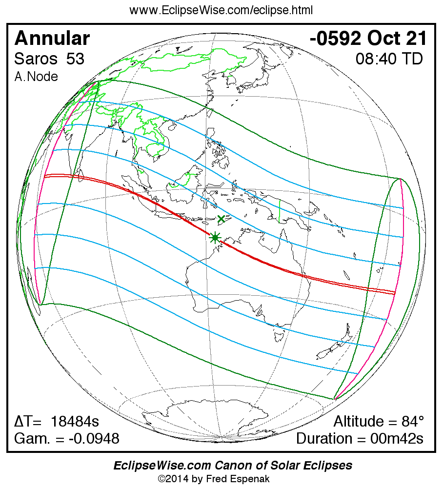 A panorama of all solar eclipses belonging to Saros 53 is presented here. Each map depicts the geographic region of visibility for a single eclipse. For central eclipses, the total or annular path is plotted in either blue (total) or red (annular). The date and time is given for the instant of Greatest Eclipse. Every map serves as a hyperlink to the EclipseWise Prime page for that eclipse where a larger map and complete details for the eclipse can be found. Visit the Key to Solar Eclipse Maps for a detailed explanation of these maps. Near the bottom of the page are a series of hyperlinks for more on solar eclipses.