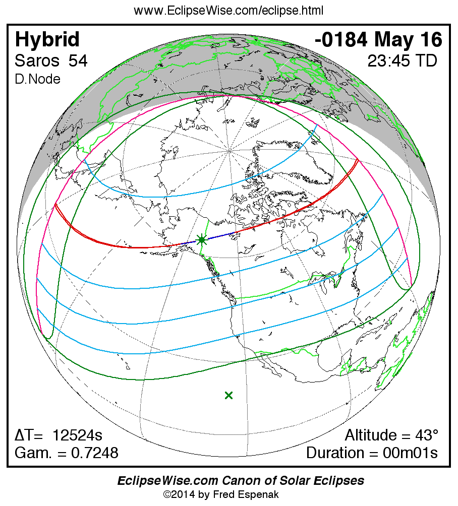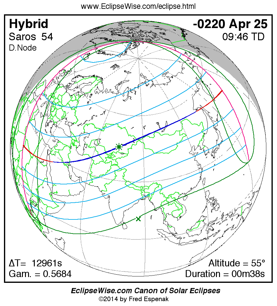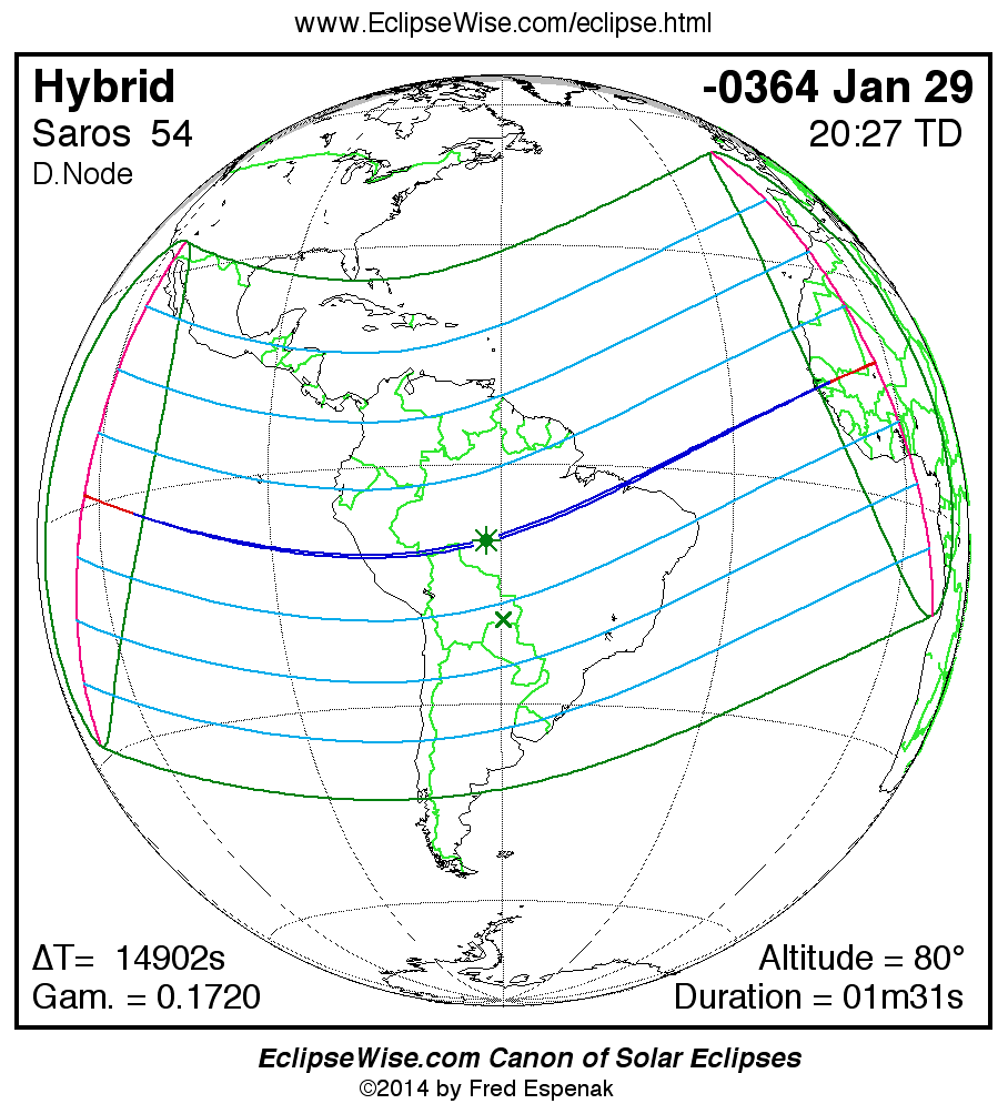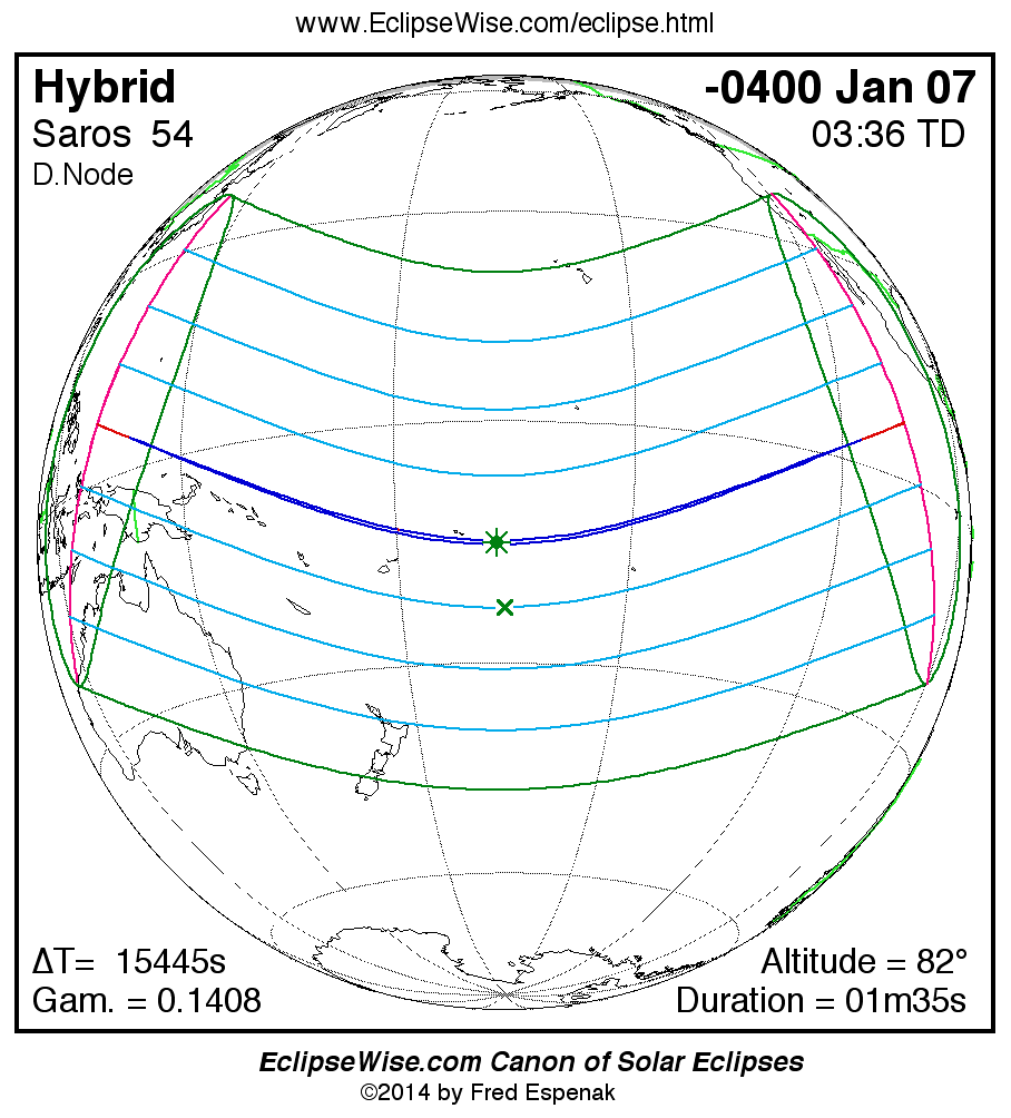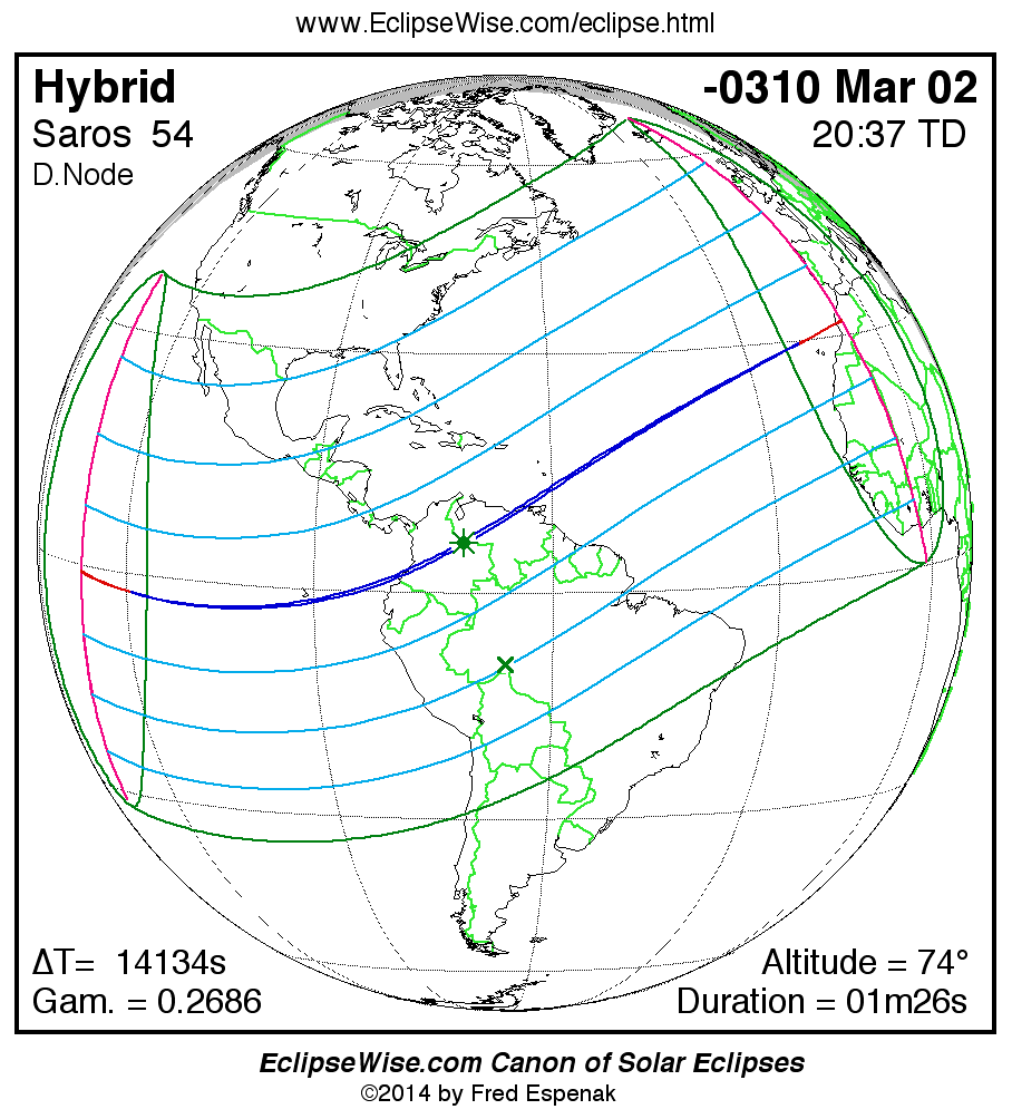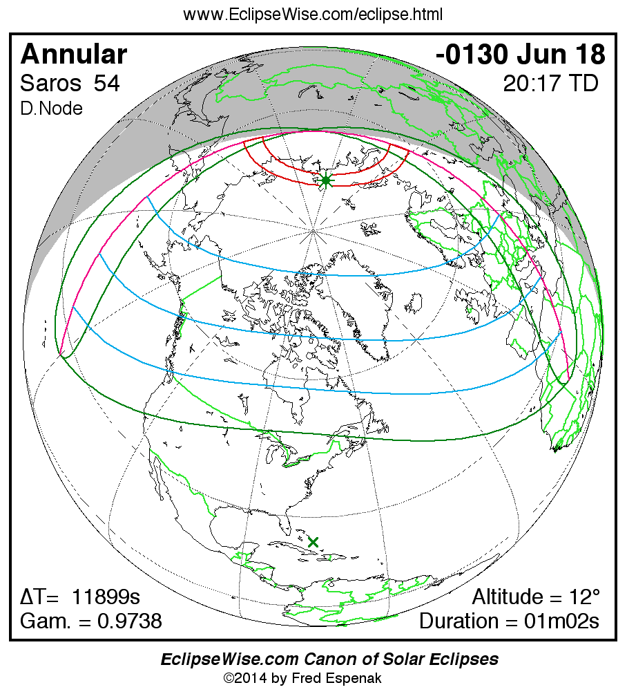 A panorama of all solar eclipses belonging to Saros 54 is presented here. Each map depicts the geographic region of visibility for a single eclipse. For central eclipses, the total or annular path is plotted in either blue (total) or red (annular). The date and time is given for the instant of Greatest Eclipse. Every map serves as a hyperlink to the EclipseWise Prime page for that eclipse where a larger map and complete details for the eclipse can be found. Visit the Key to Solar Eclipse Maps for a detailed explanation of these maps. Near the bottom of the page are a series of hyperlinks for more on solar eclipses.