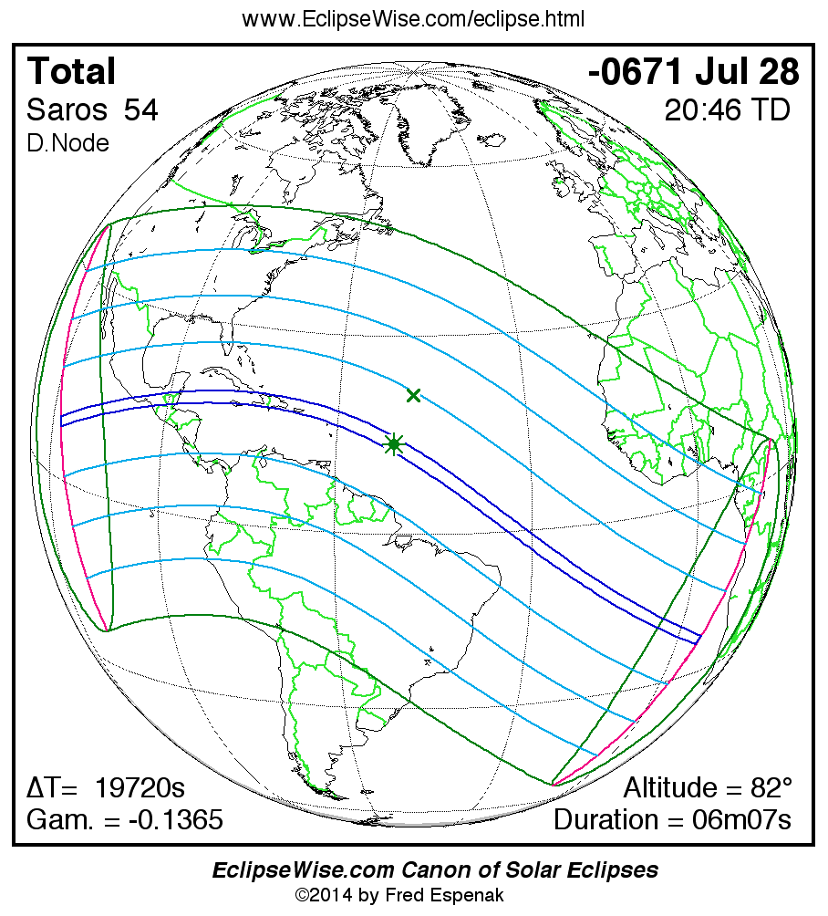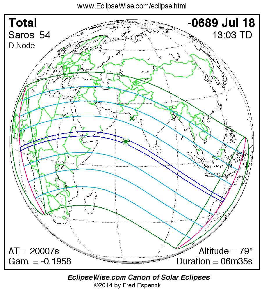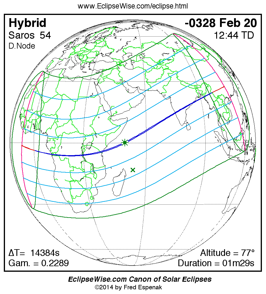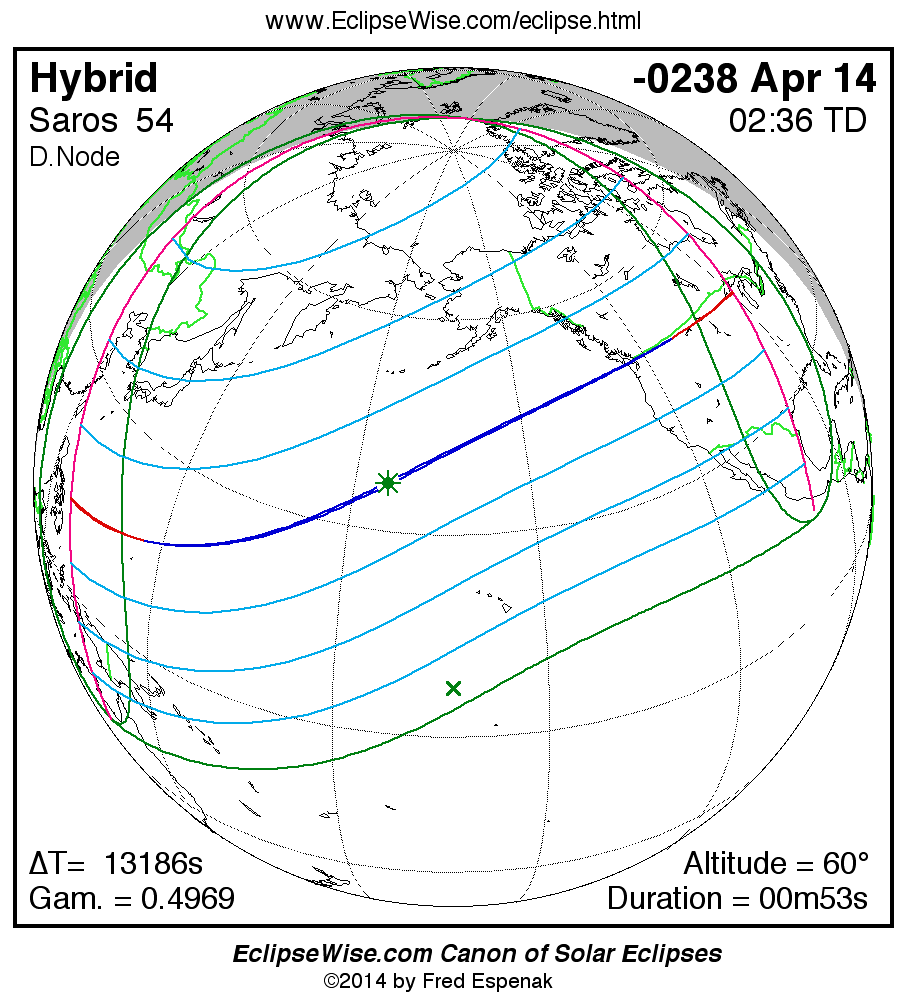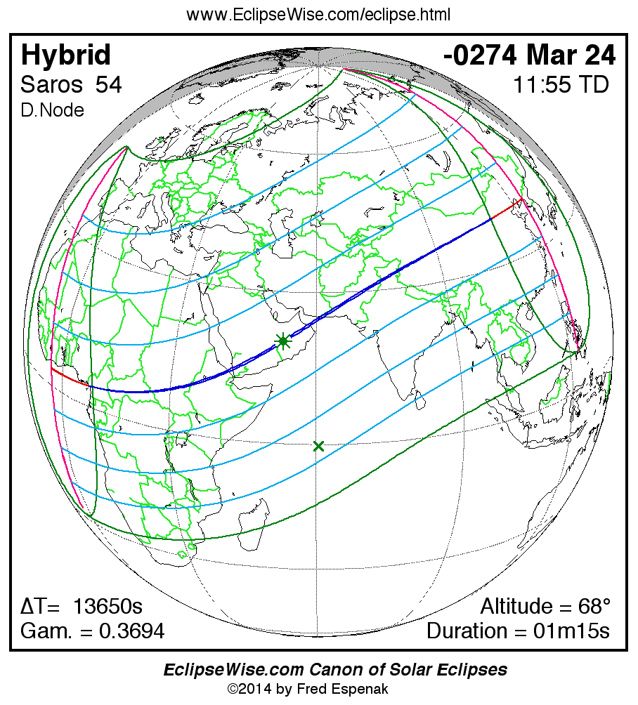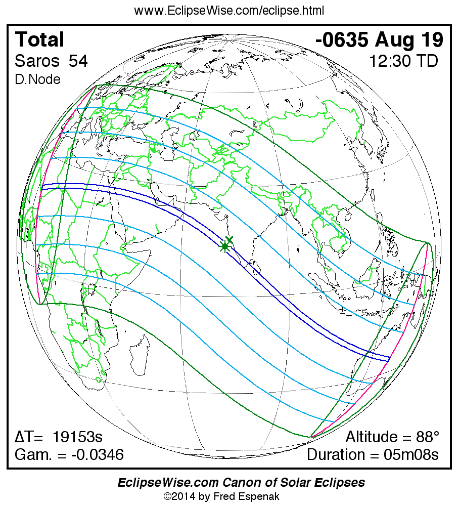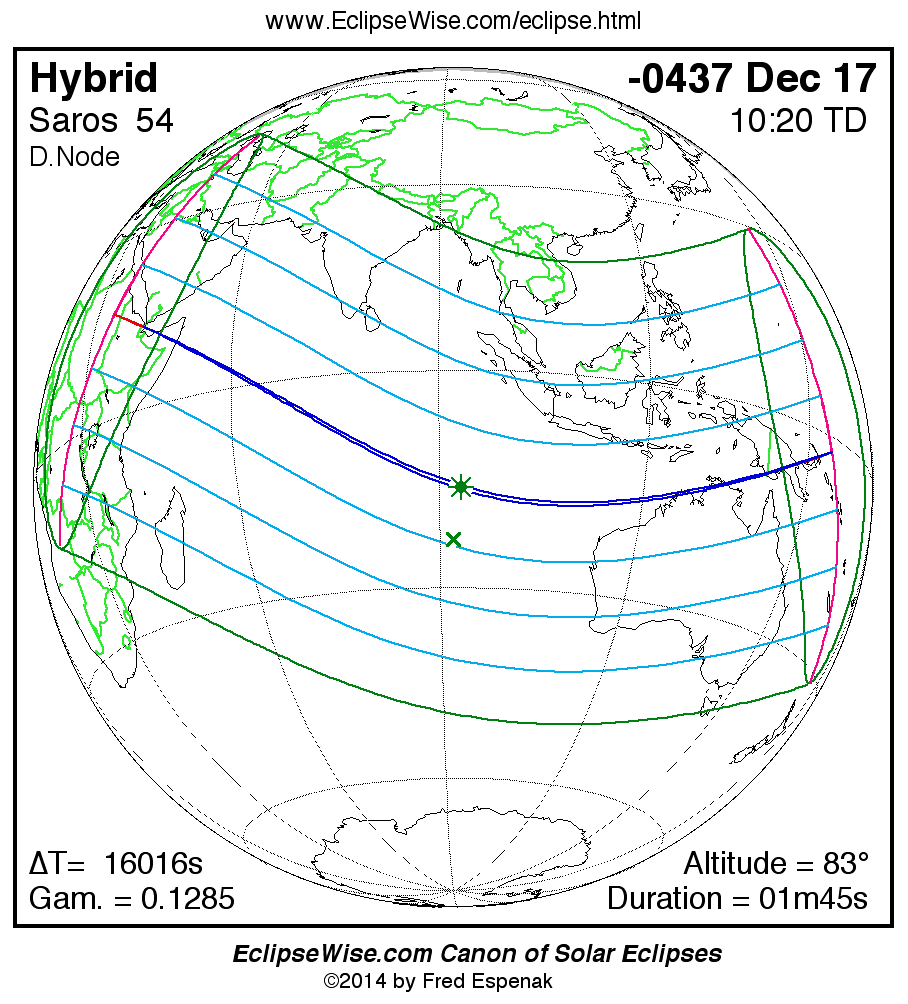 A panorama of all solar eclipses belonging to Saros 54 is presented here. Each map depicts the geographic region of visibility for a single eclipse. For central eclipses, the total or annular path is plotted in either blue (total) or red (annular). The date and time is given for the instant of Greatest Eclipse. Every map serves as a hyperlink to the EclipseWise Prime page for that eclipse where a larger map and complete details for the eclipse can be found. Visit the Key to Solar Eclipse Maps for a detailed explanation of these maps. Near the bottom of the page are a series of hyperlinks for more on solar eclipses.