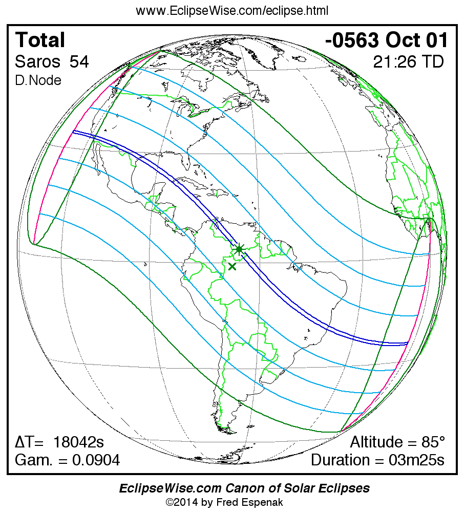 The Saros panorama below is arranged in horizontal rows of 3 eclipses. So one eclipse to the left or right is a difference of 1 Saros cycle, and one eclipse above or below is a difference of 1 exeligmos. By scanning a column of the table, it reveals how the geographic visibility of eclipses separated by an exeligmos slowly changes.