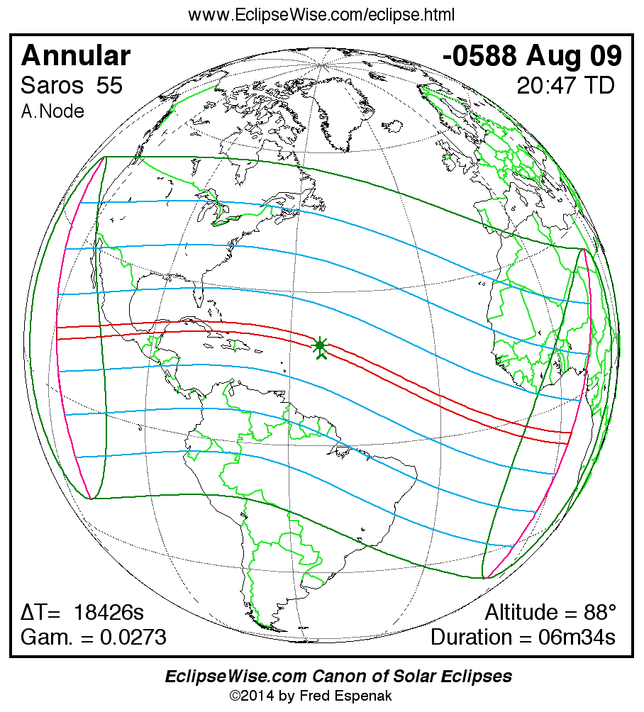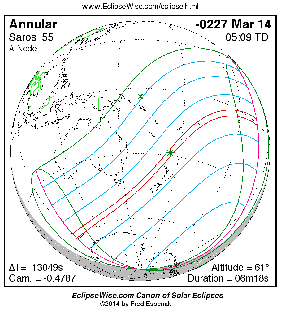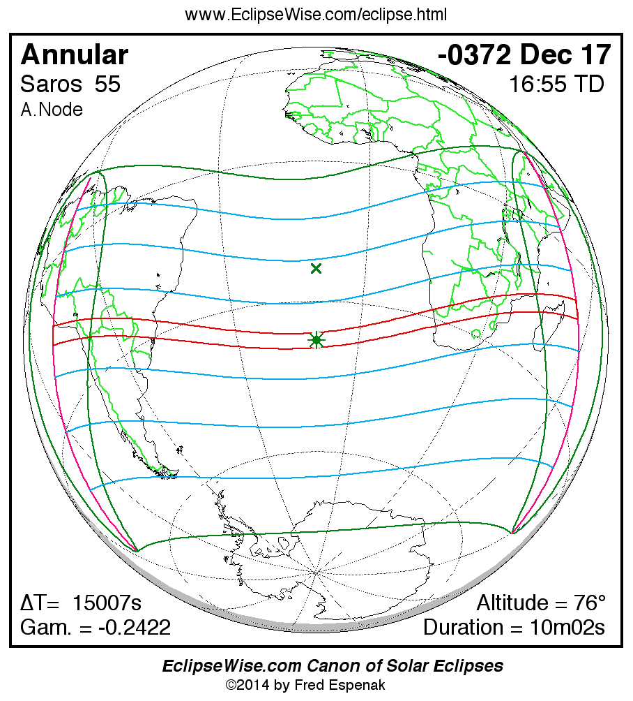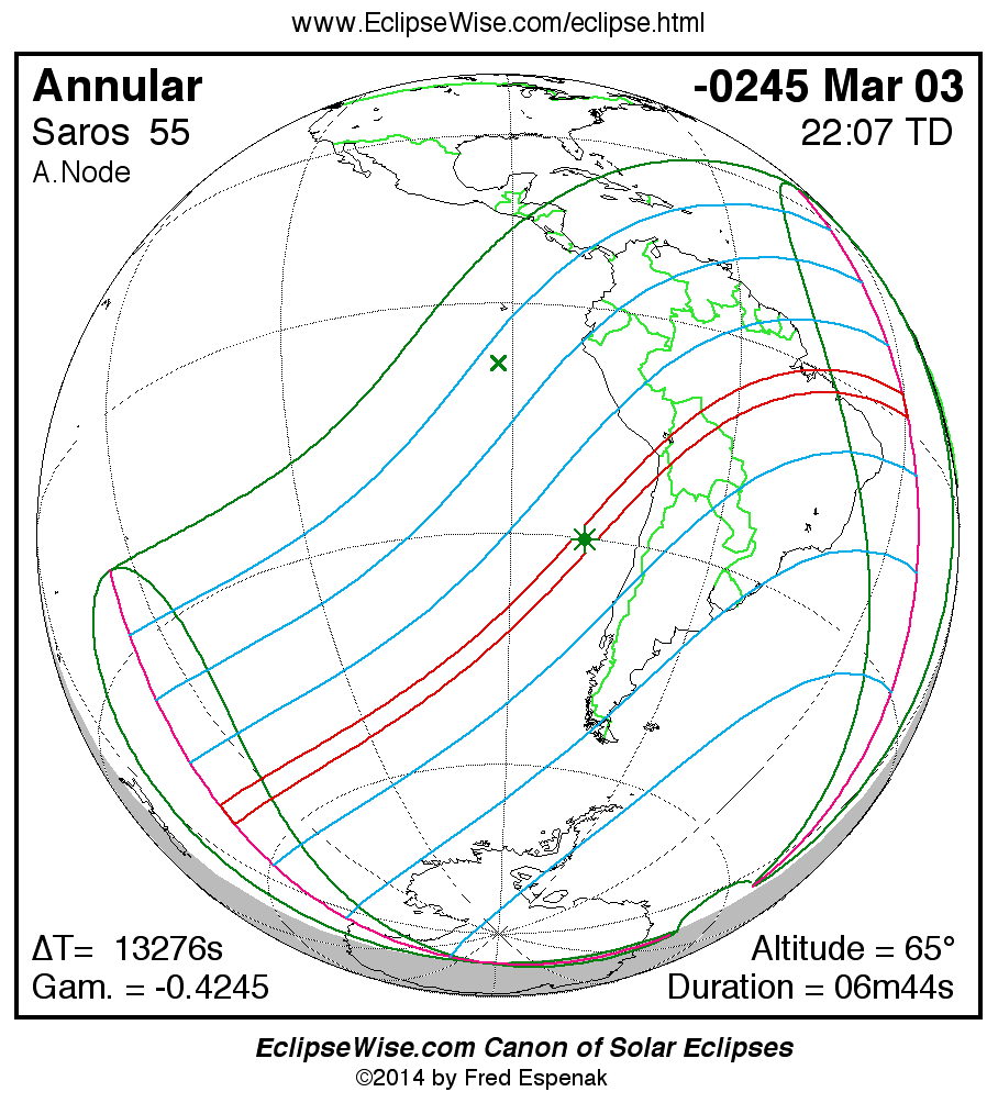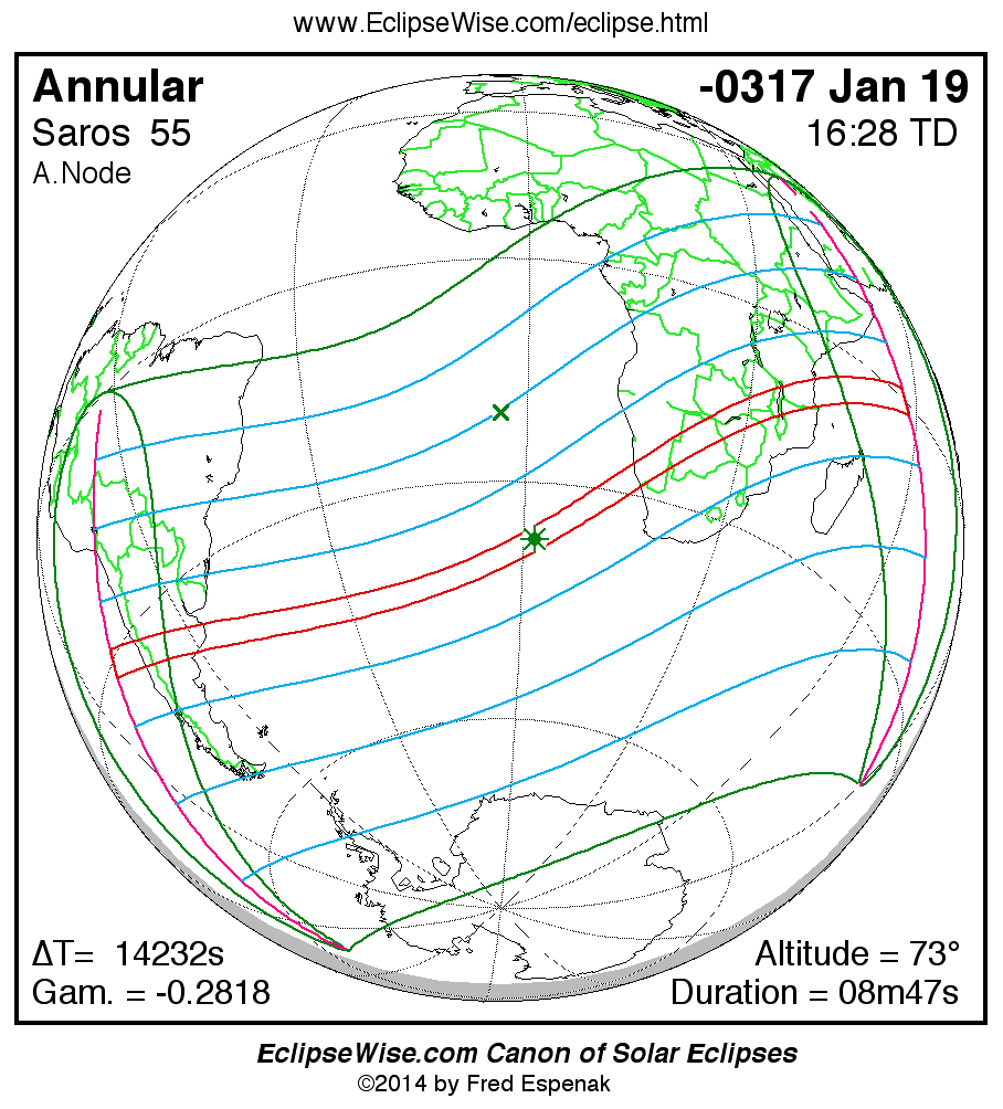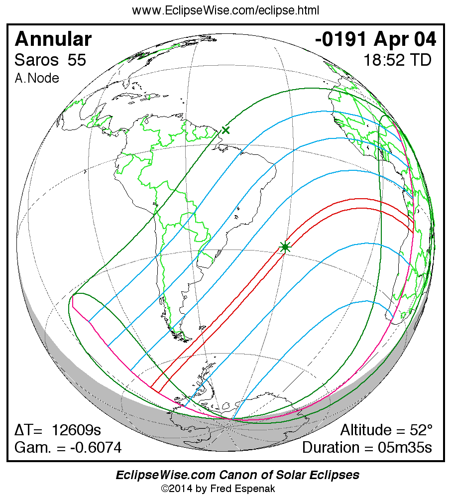 A panorama of all solar eclipses belonging to Saros 55 is presented here. Each map depicts the geographic region of visibility for a single eclipse. For central eclipses, the total or annular path is plotted in either blue (total) or red (annular). The date and time is given for the instant of Greatest Eclipse. Every map serves as a hyperlink to the EclipseWise Prime page for that eclipse where a larger map and complete details for the eclipse can be found. Visit the Key to Solar Eclipse Maps for a detailed explanation of these maps. Near the bottom of the page are a series of hyperlinks for more on solar eclipses.